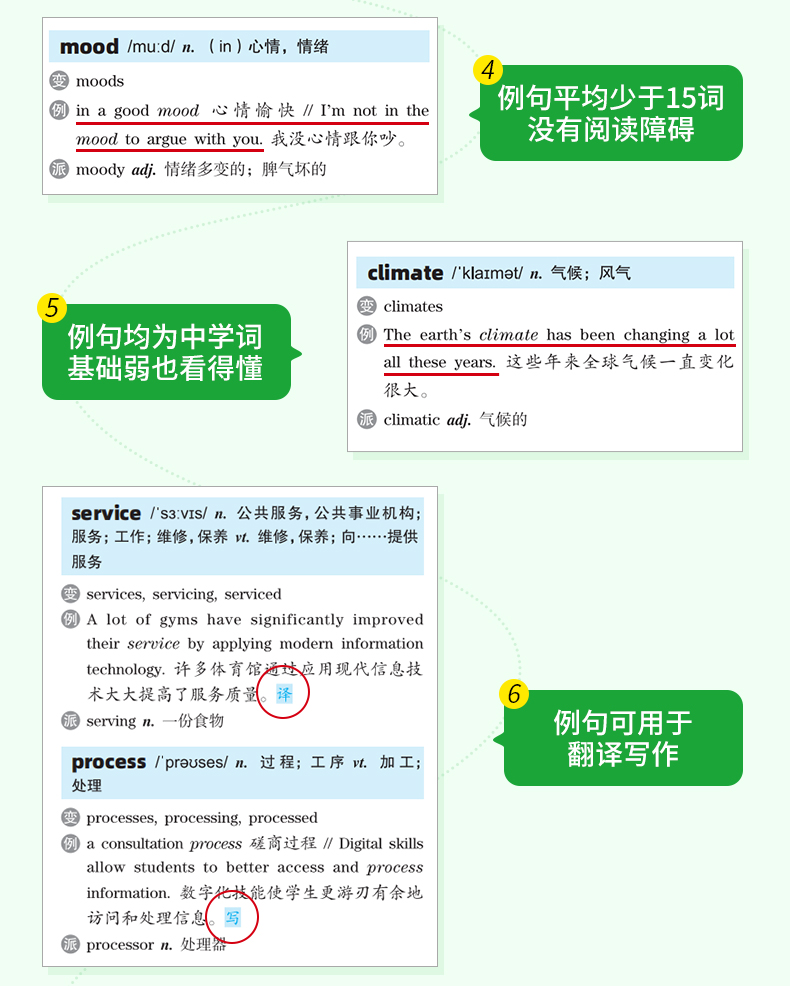 (3)例句用词均为中学词汇,既有短语也有句子,句子简短,句式简单,没有阅读障碍,基础弱也看得懂;