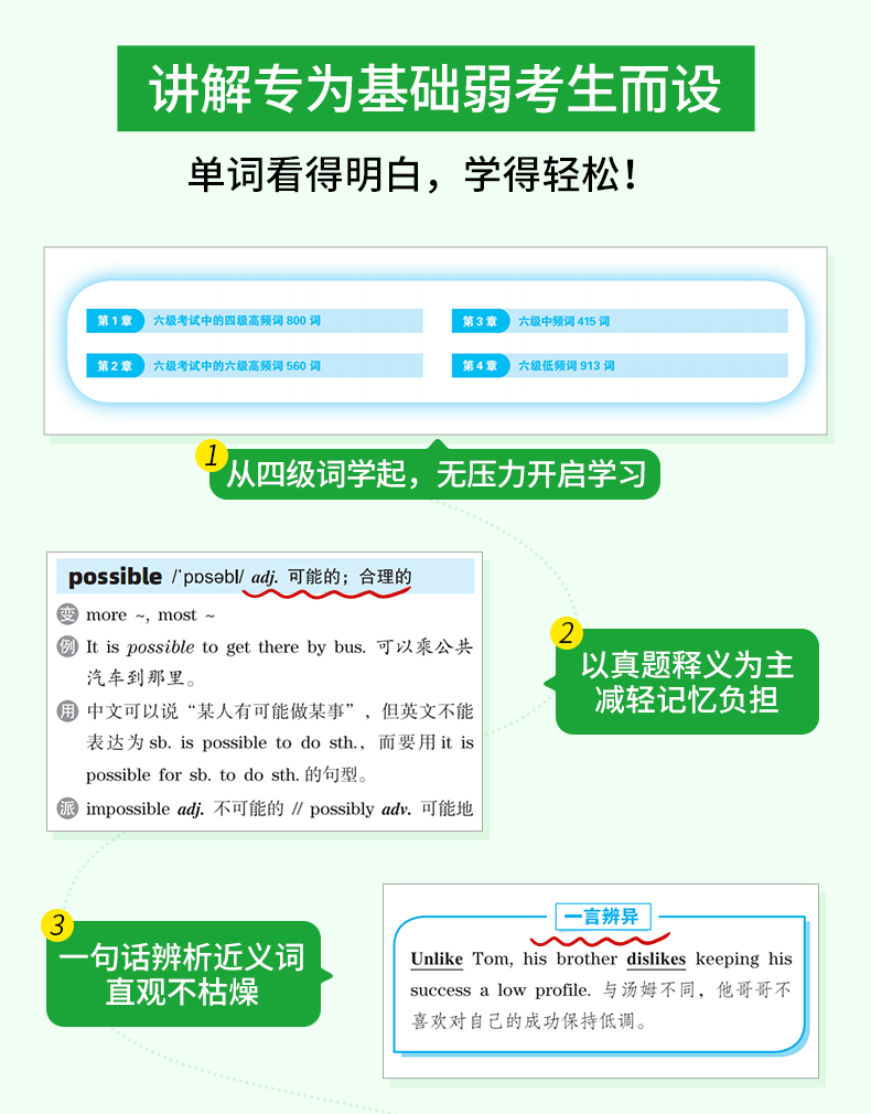 (2)词汇所给意思以真题考过的意思为主,不给生僻意思,减少记忆负担;