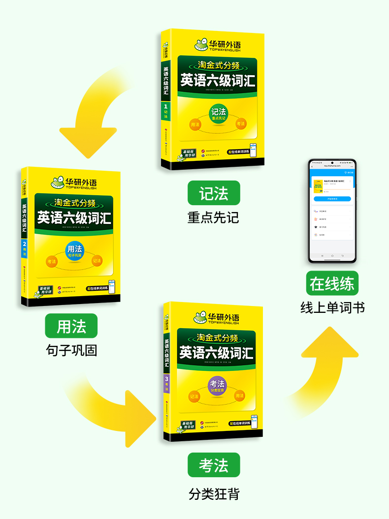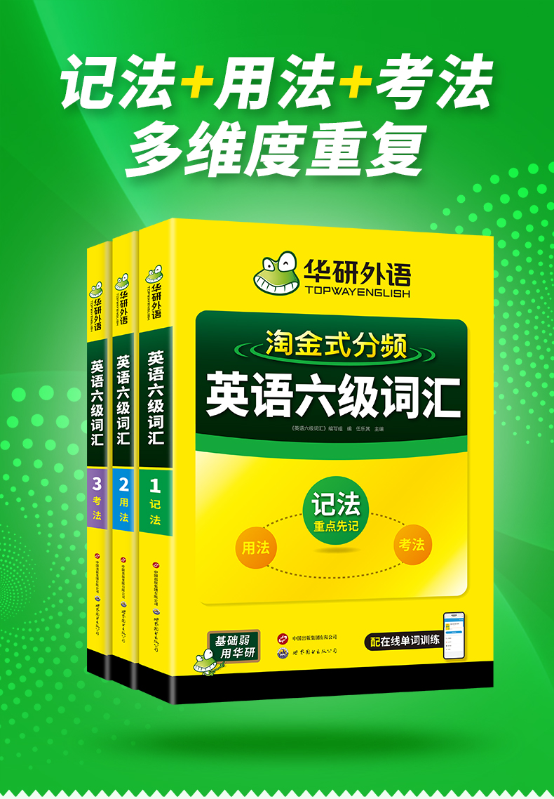 (1)高频词从六级常考的四级词汇入手,从更熟悉的记起,由易到难,无压力开启学习;