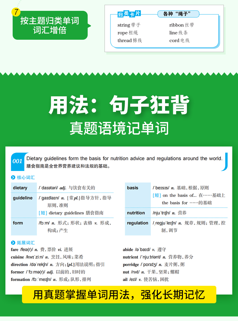 (3)考法:据考试题型对单词进行针对性分类和精准记忆,因题制宜,直击考点,适合考前查漏补缺,针对性提高弱项。