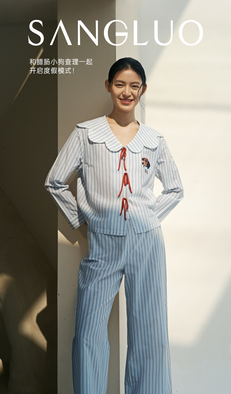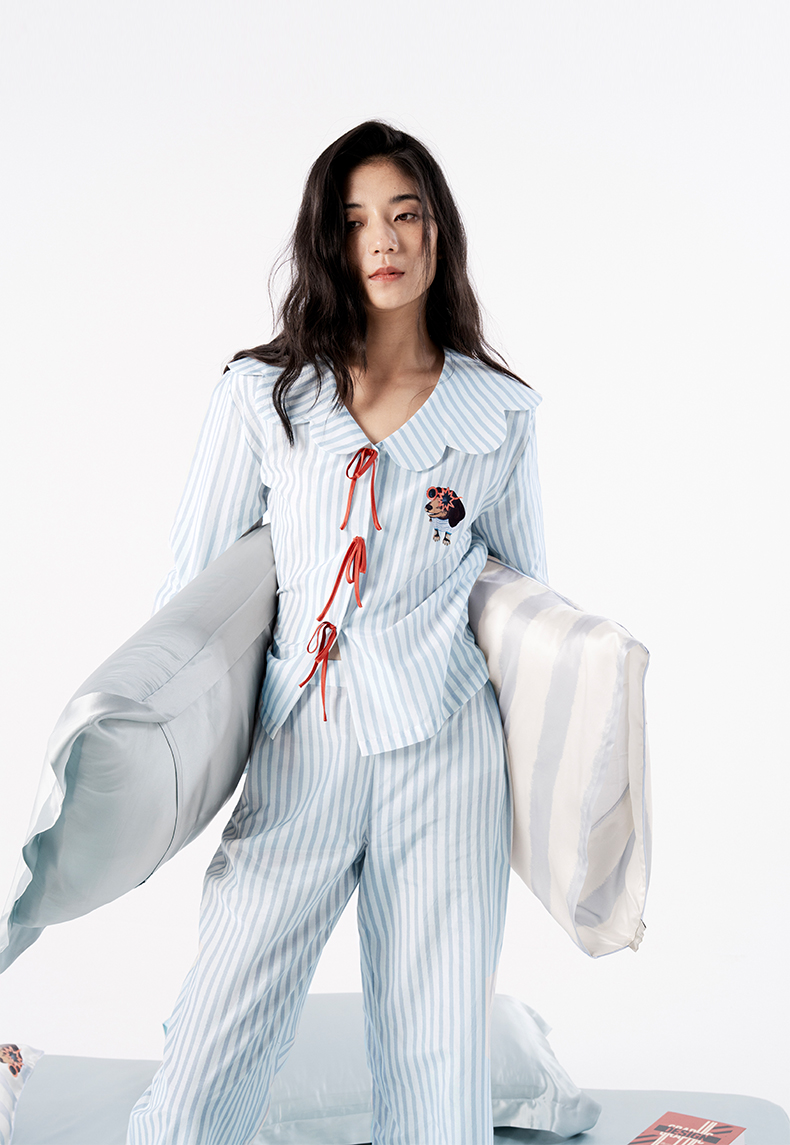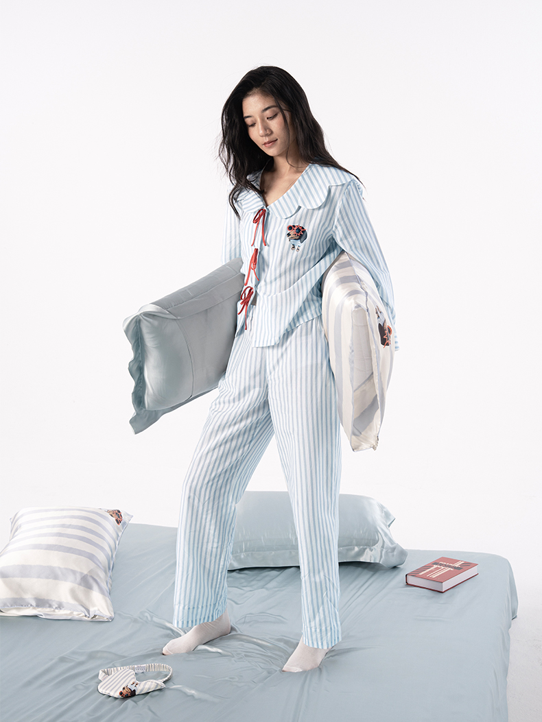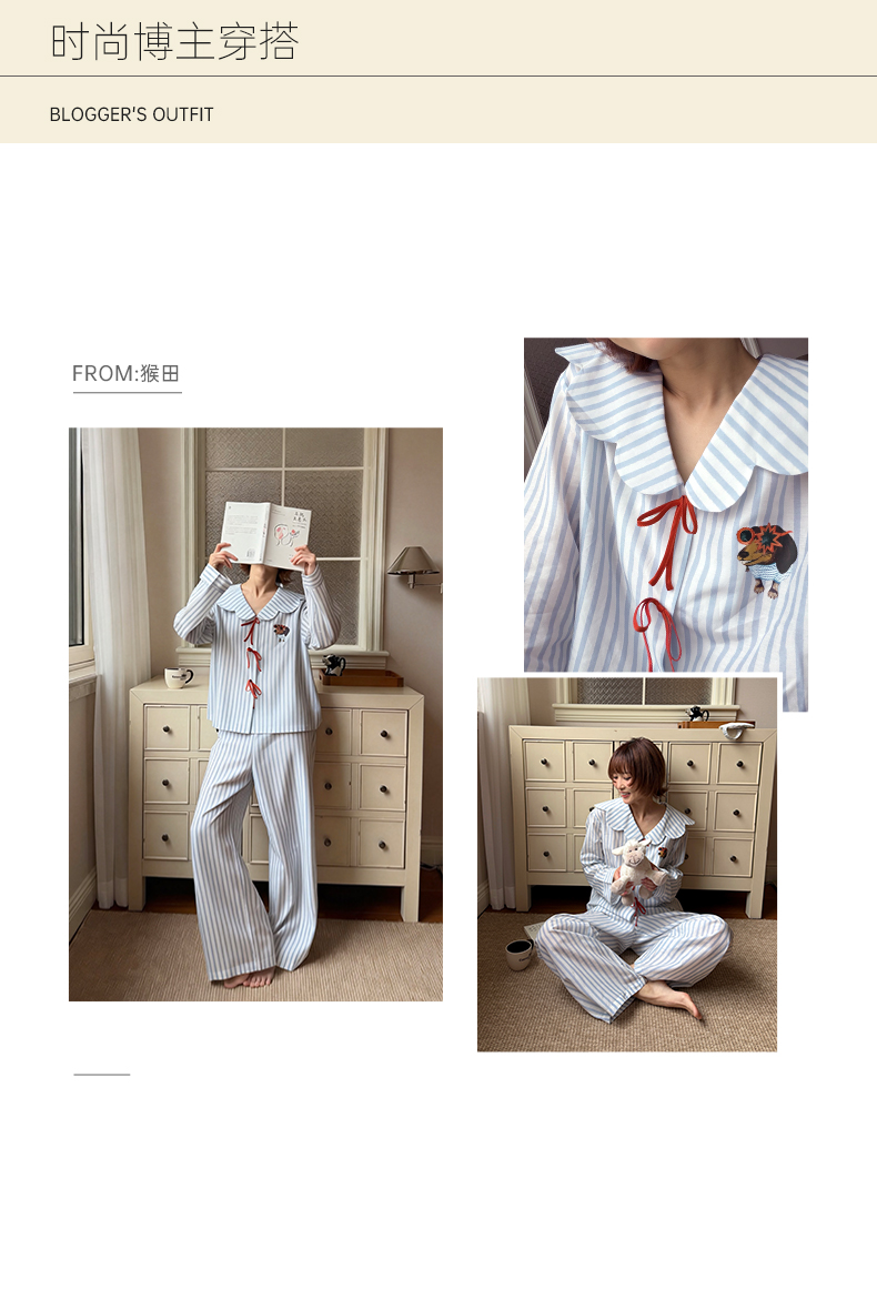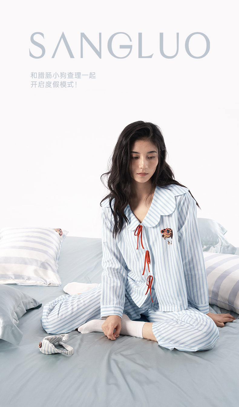 桑罗萌趣旺旺条纹印花桑蚕丝睡衣套装女娃娃领长袖家居服腊肠小狗可外穿