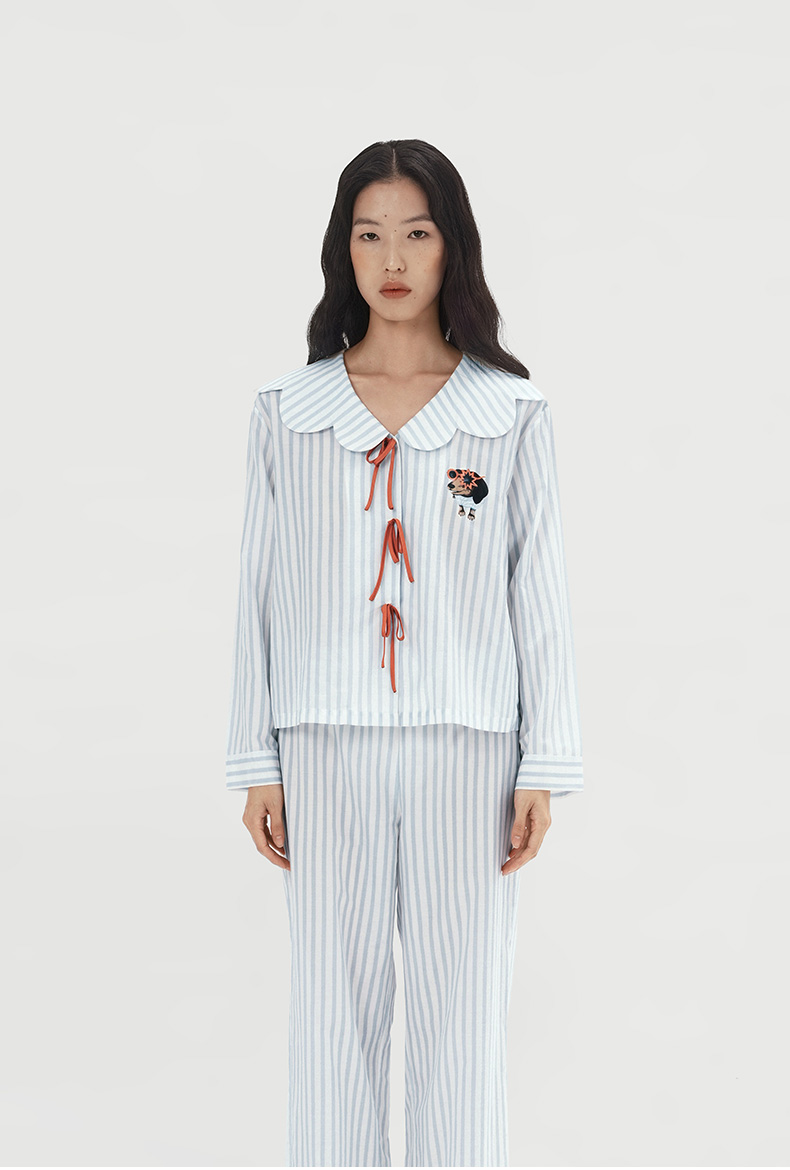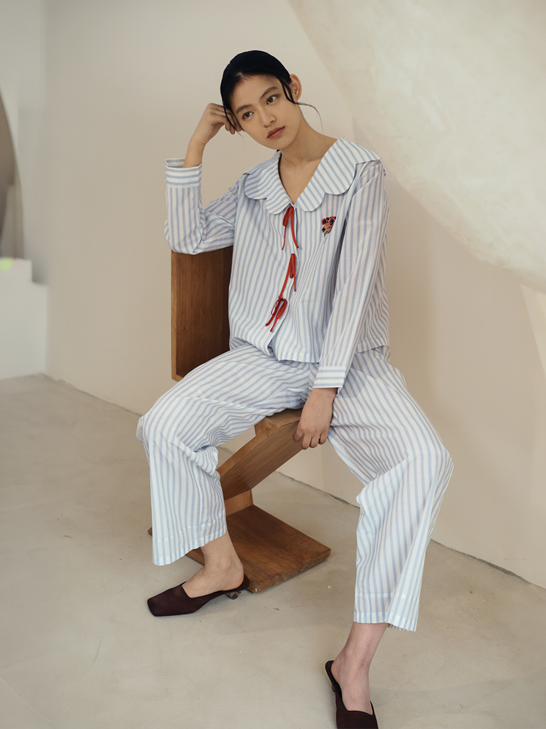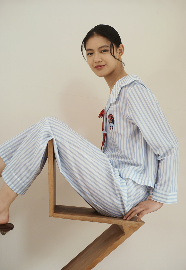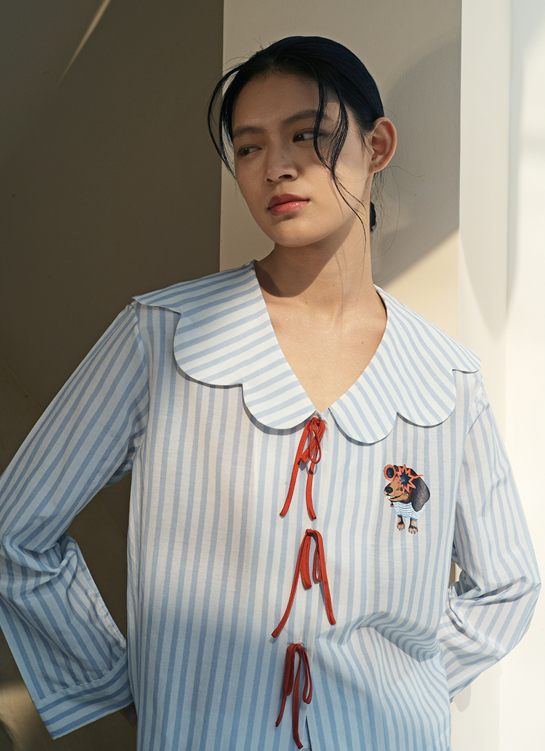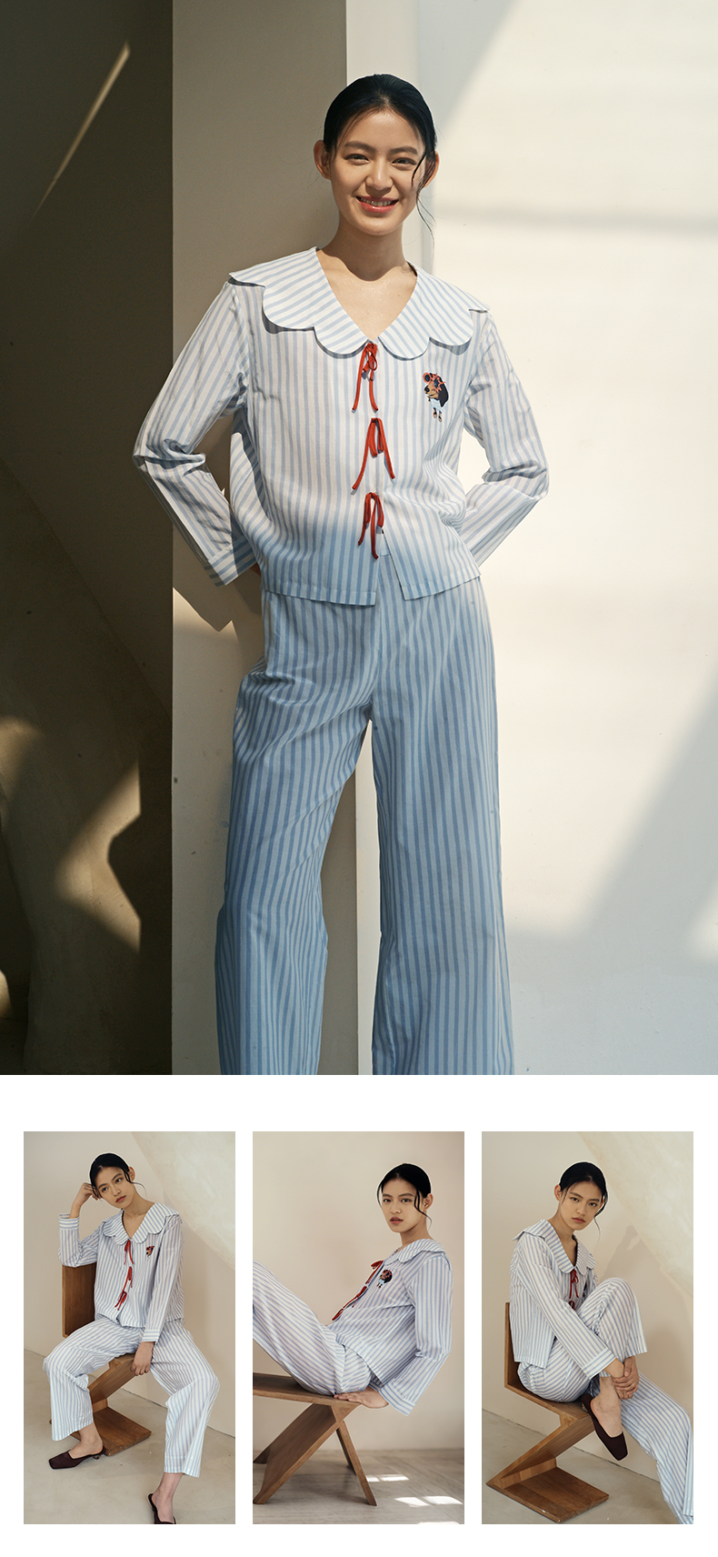 桑罗萌趣旺旺条纹印花桑蚕丝睡衣套装女娃娃领长袖家居服腊肠小狗可外穿