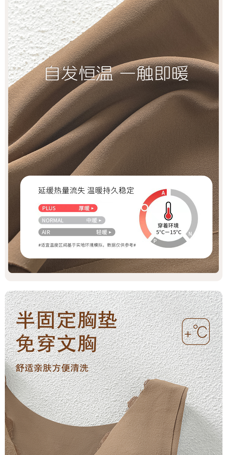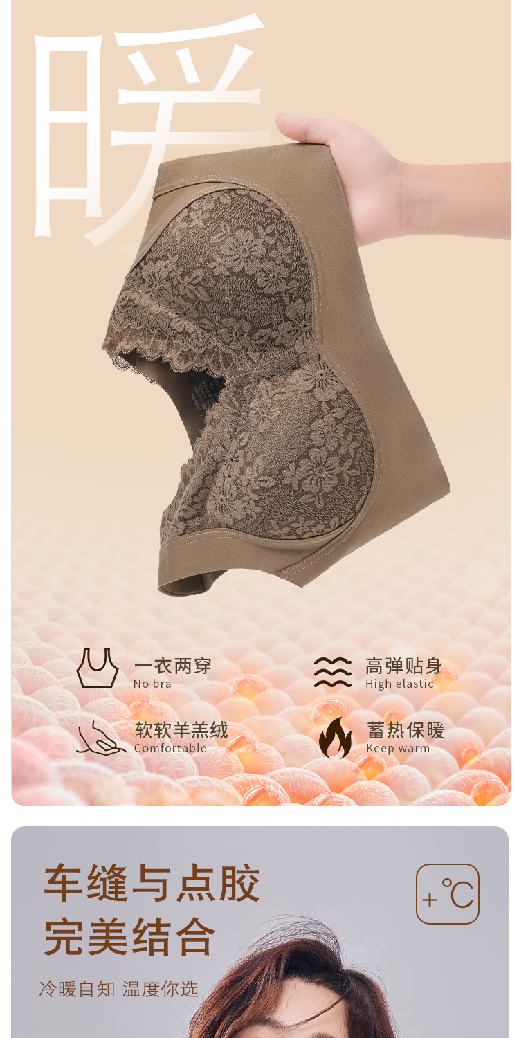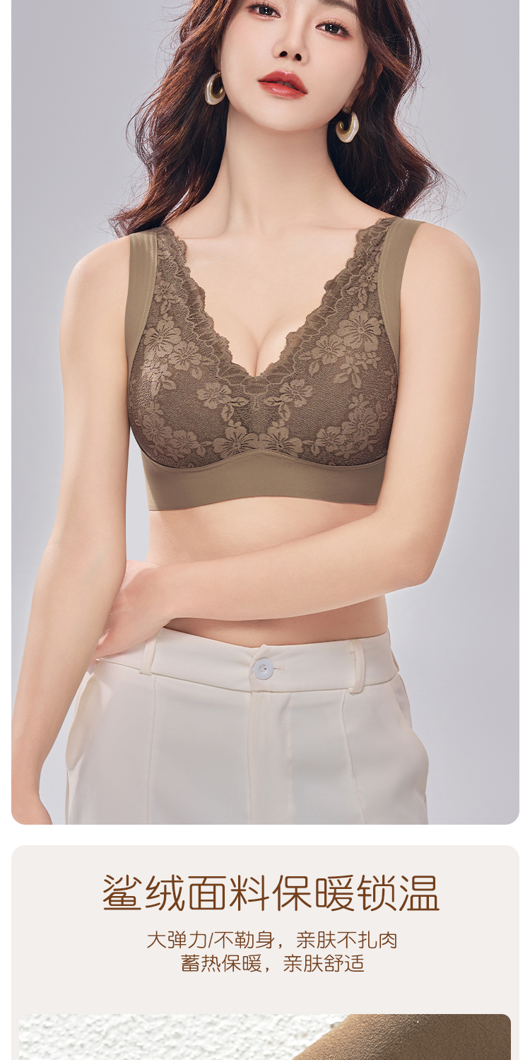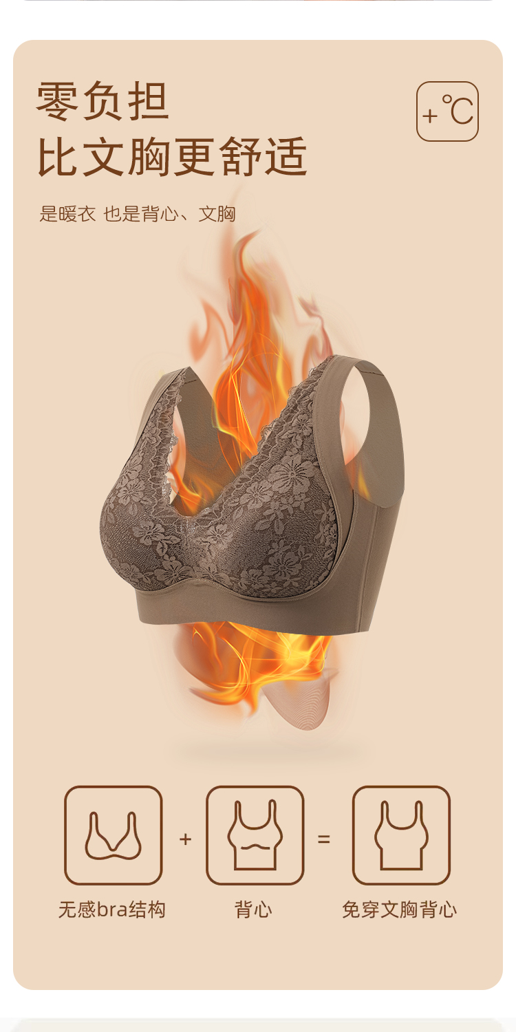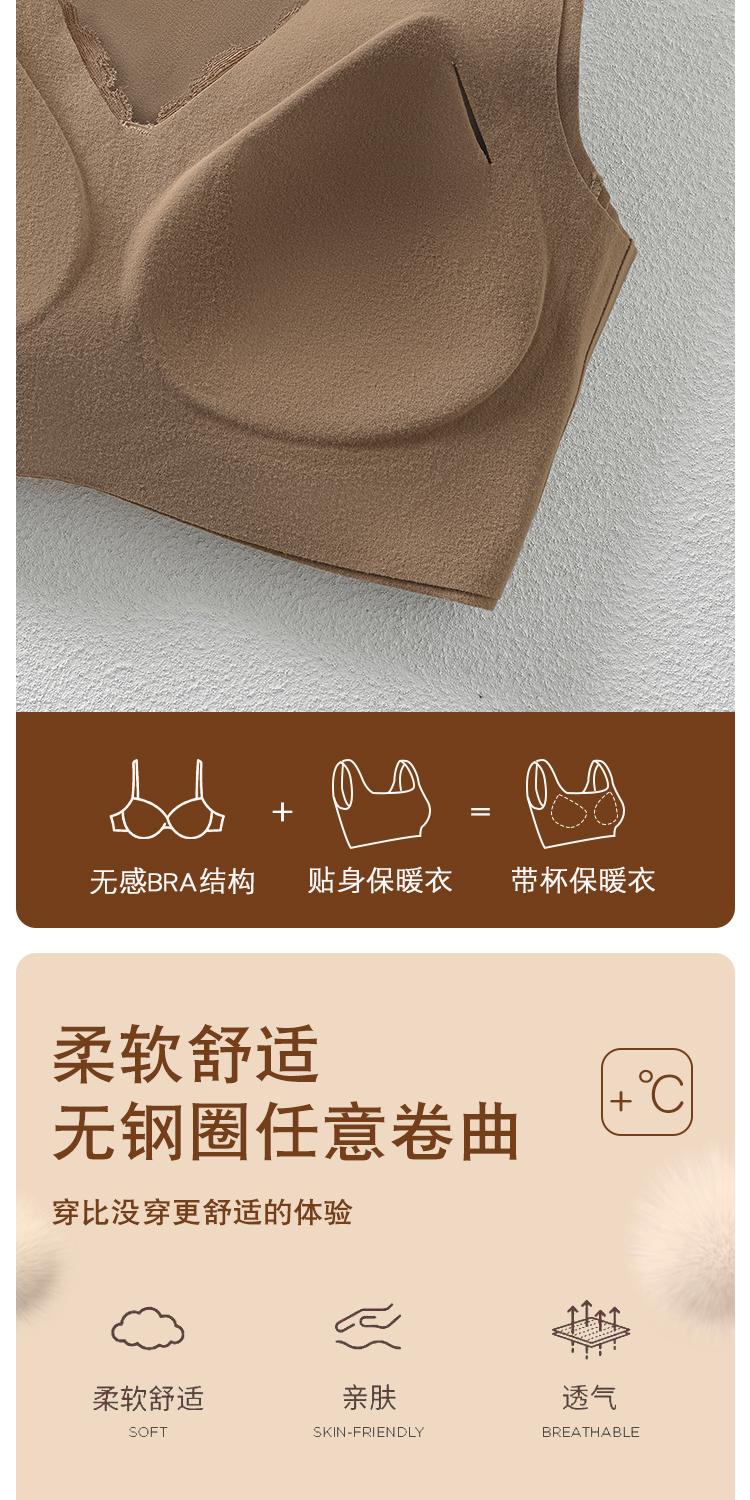 蓄热保暖背心文胸 无痕速暖双面磨毛自发热保暖内衣 轻盈无痕温暖 亲肤透气高弹 蕾丝聚拢上托收副乳半固定杯V领