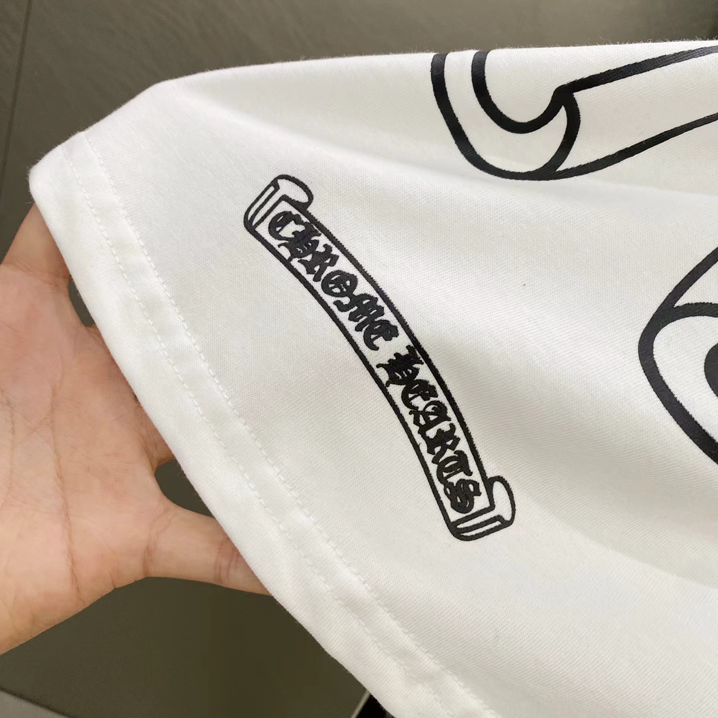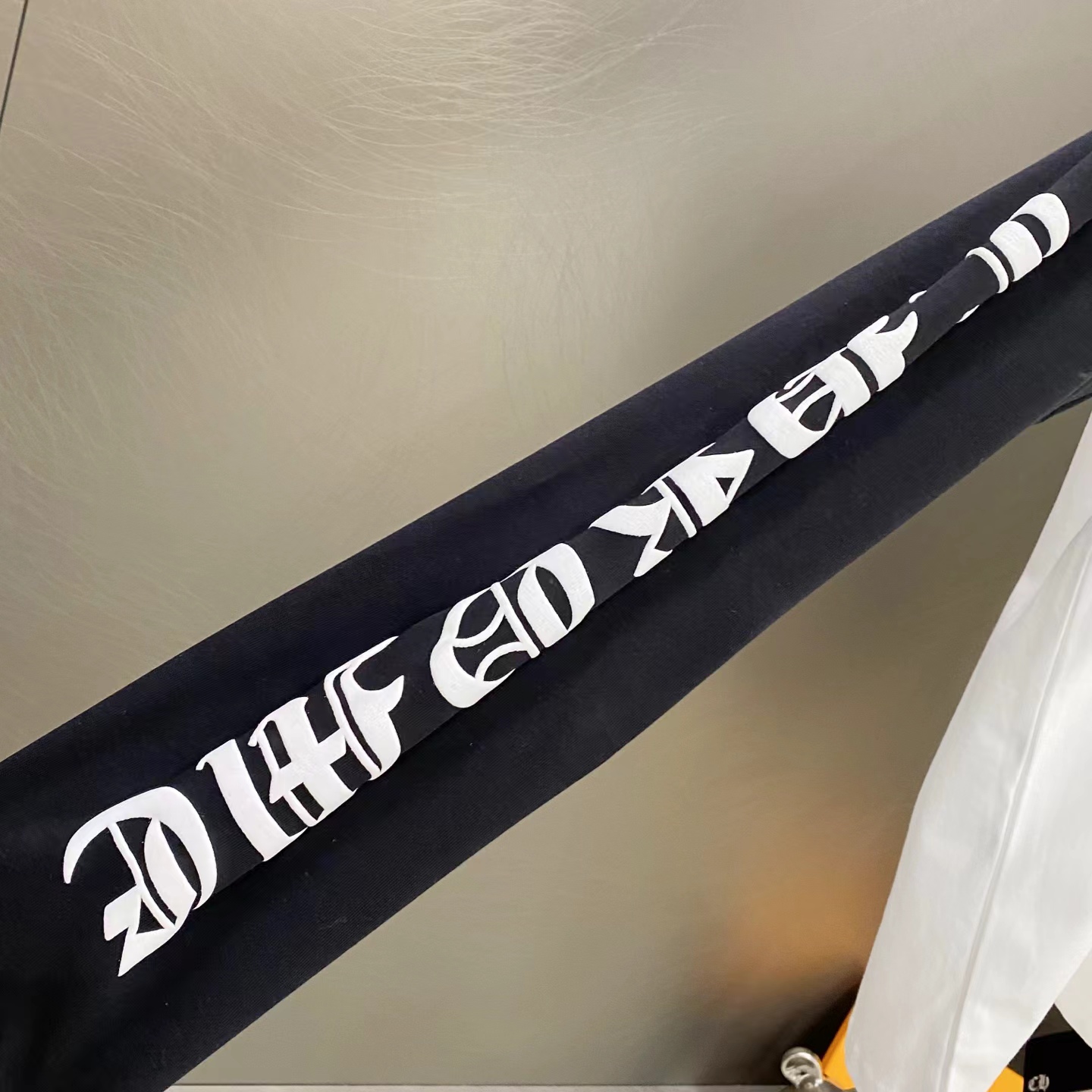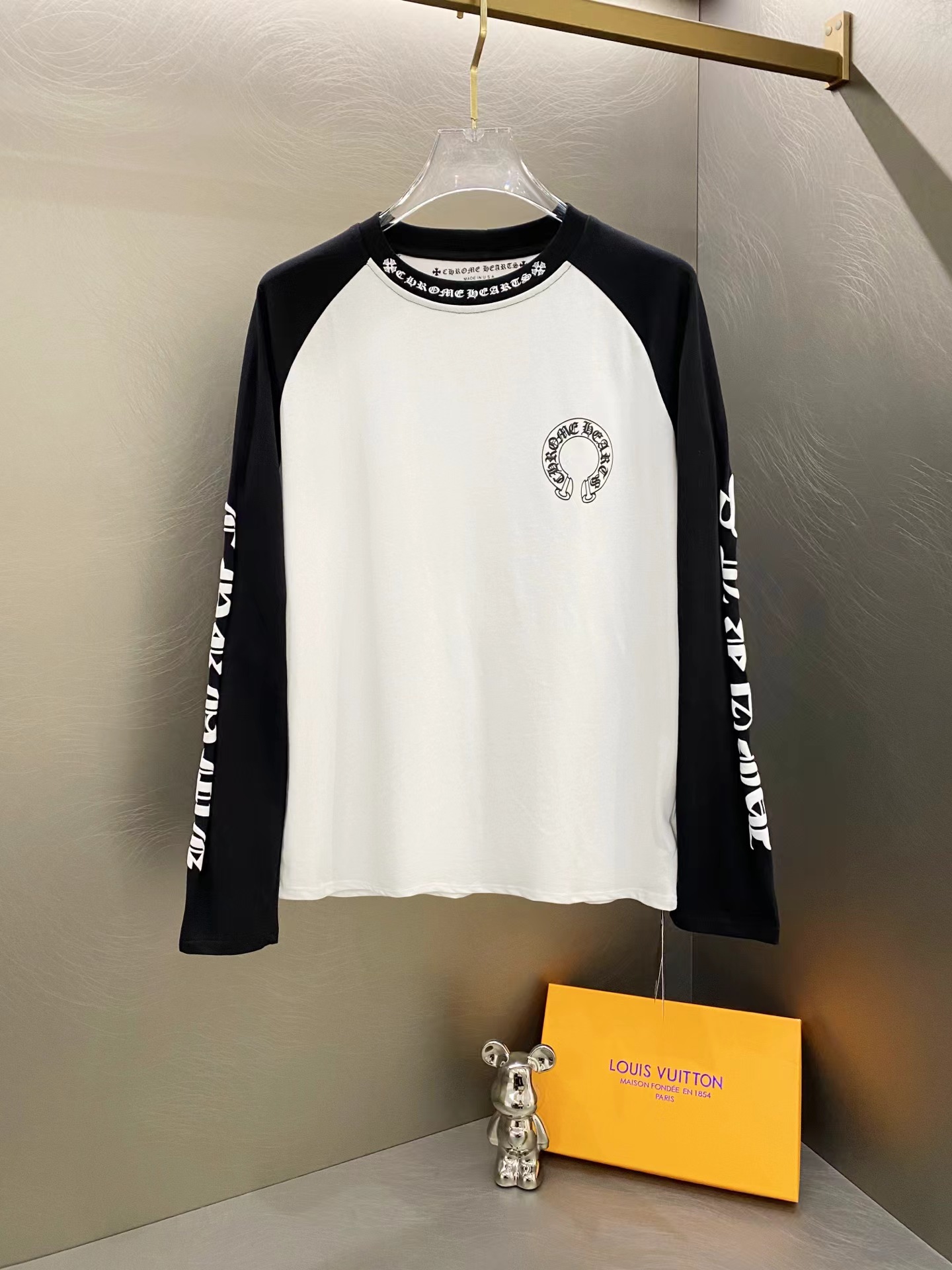 D110716梵文马蹄拼接发泡字母印花爆款长袖T恤