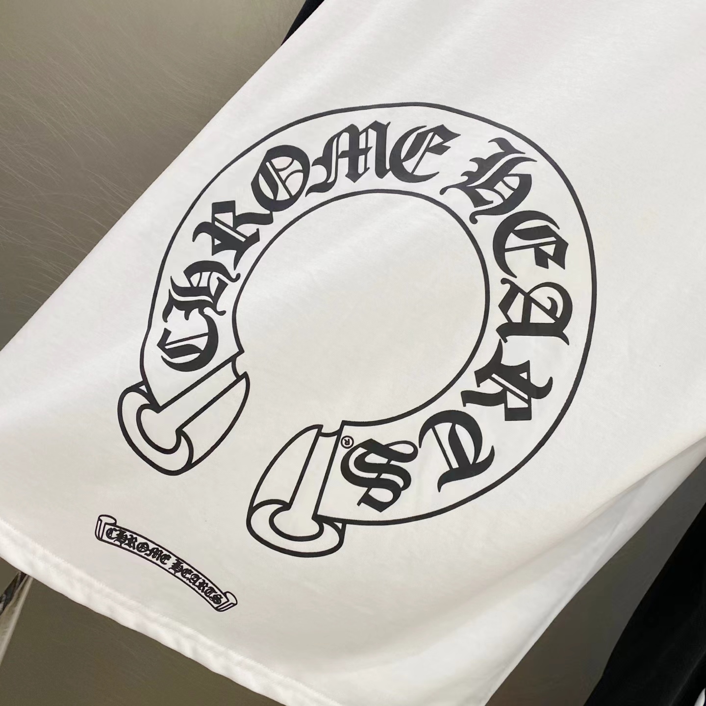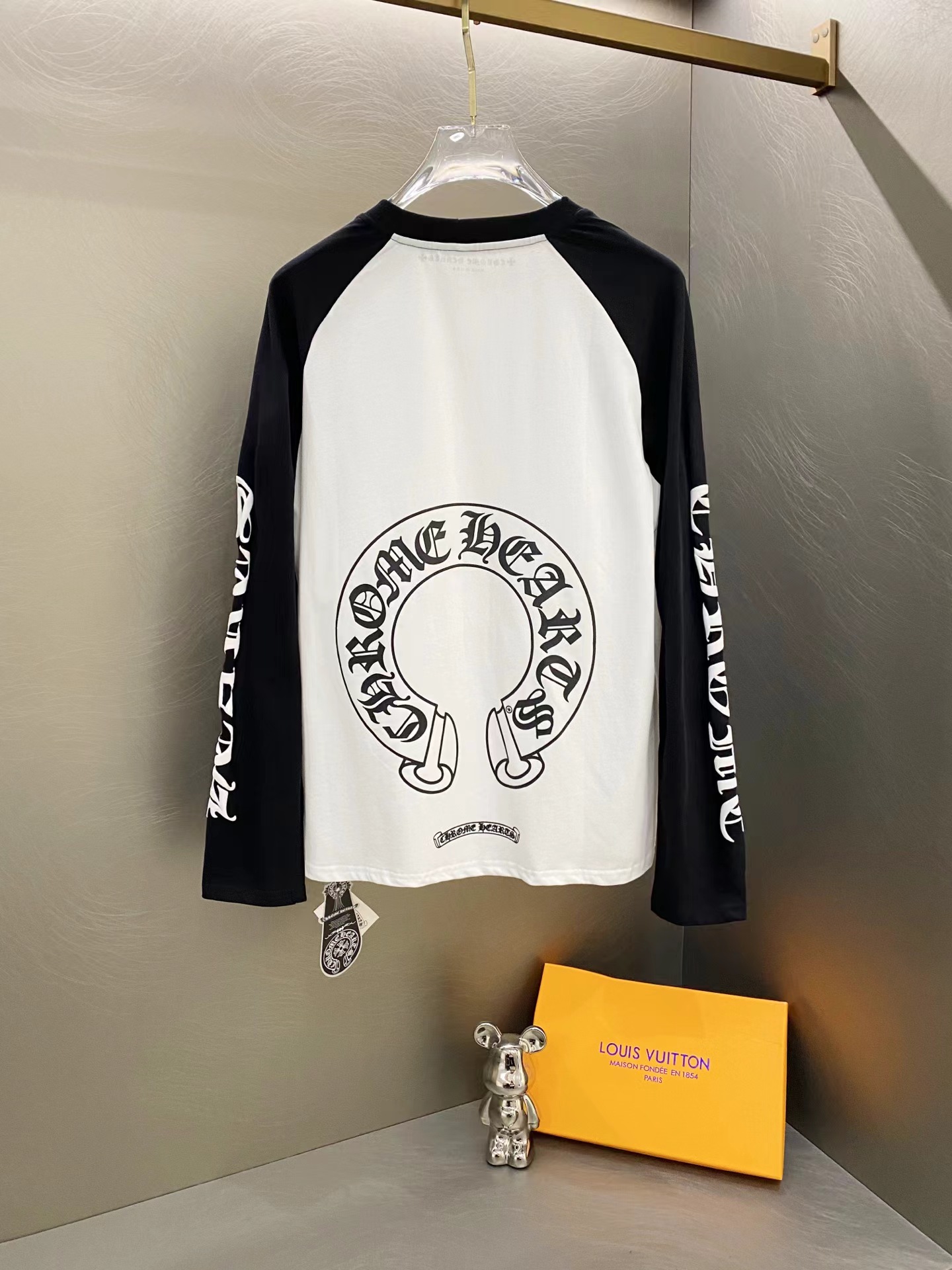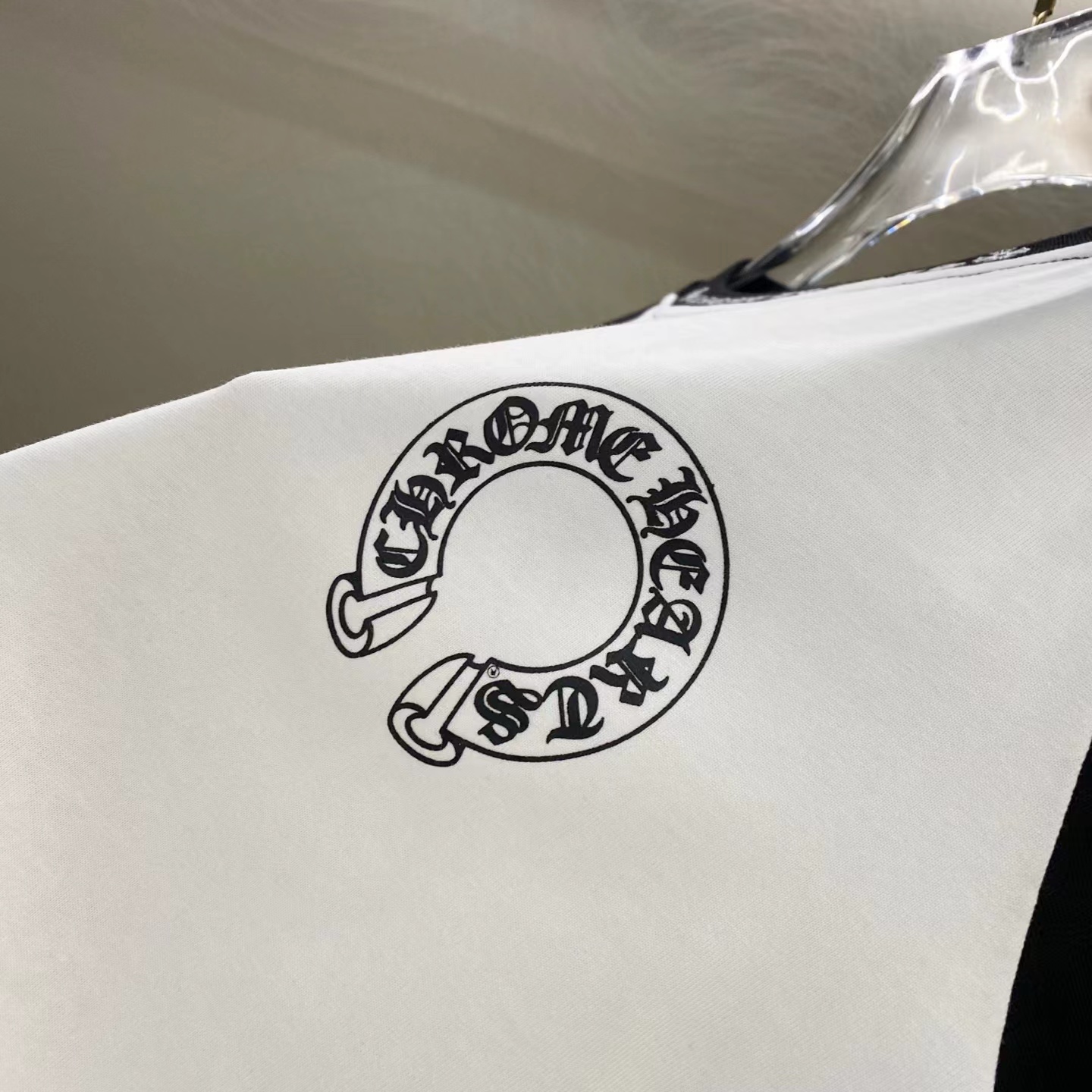 D110716梵文马蹄拼接发泡字母印花爆款长袖T恤
