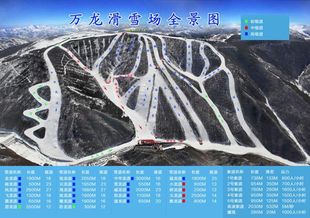 万龙滑雪场前期开发共建成初、中、高级滑雪道22 条,雪道总面积90多万平方米,树林野雪总面积90余万平方米。与滑雪道相匹配,设置了2条双人吊椅式索道,单位时间总运力为1950人/小时、3条4人吊椅式索道,运速为2.25米/秒,单位时间总运力为3100人/小时以及1条专门为初级滑雪者配备的魔毯,更加贴心的设计,免去了初级滑雪者初次滑雪时对缆车的恐惧!庞大的人工造雪系统覆盖了每条雪道,再配以得天独厚的天然降雪,使万龙滑雪场成为中国开放最早、雪期最长、雪质最佳的滑雪场。