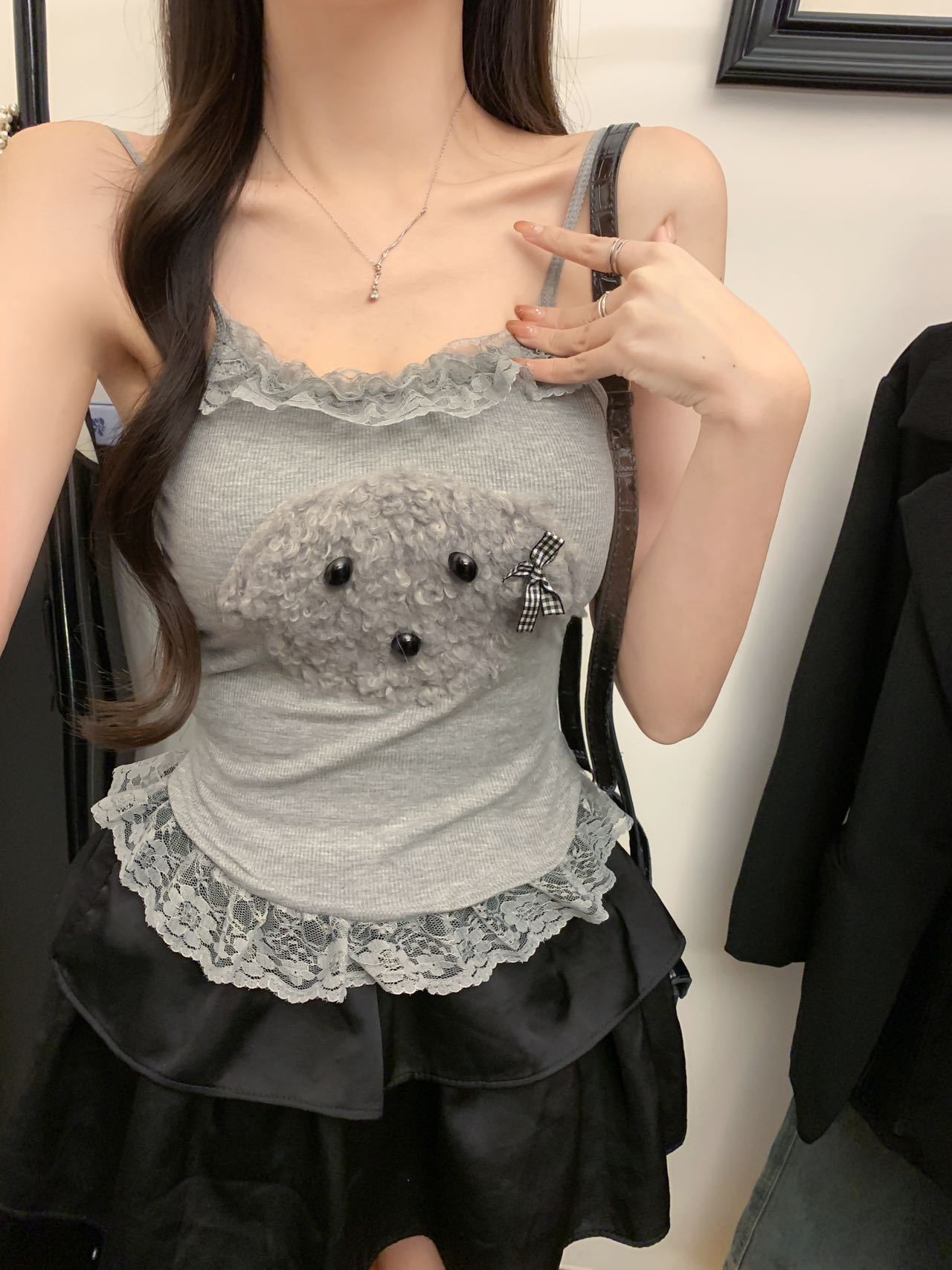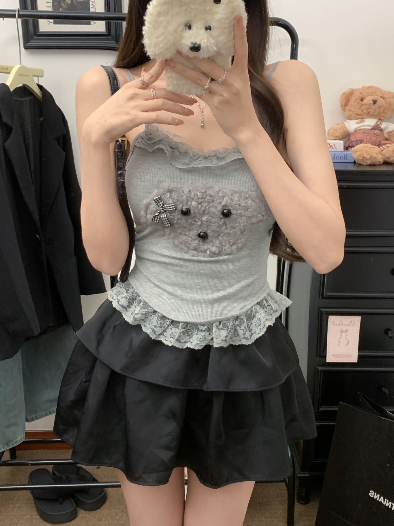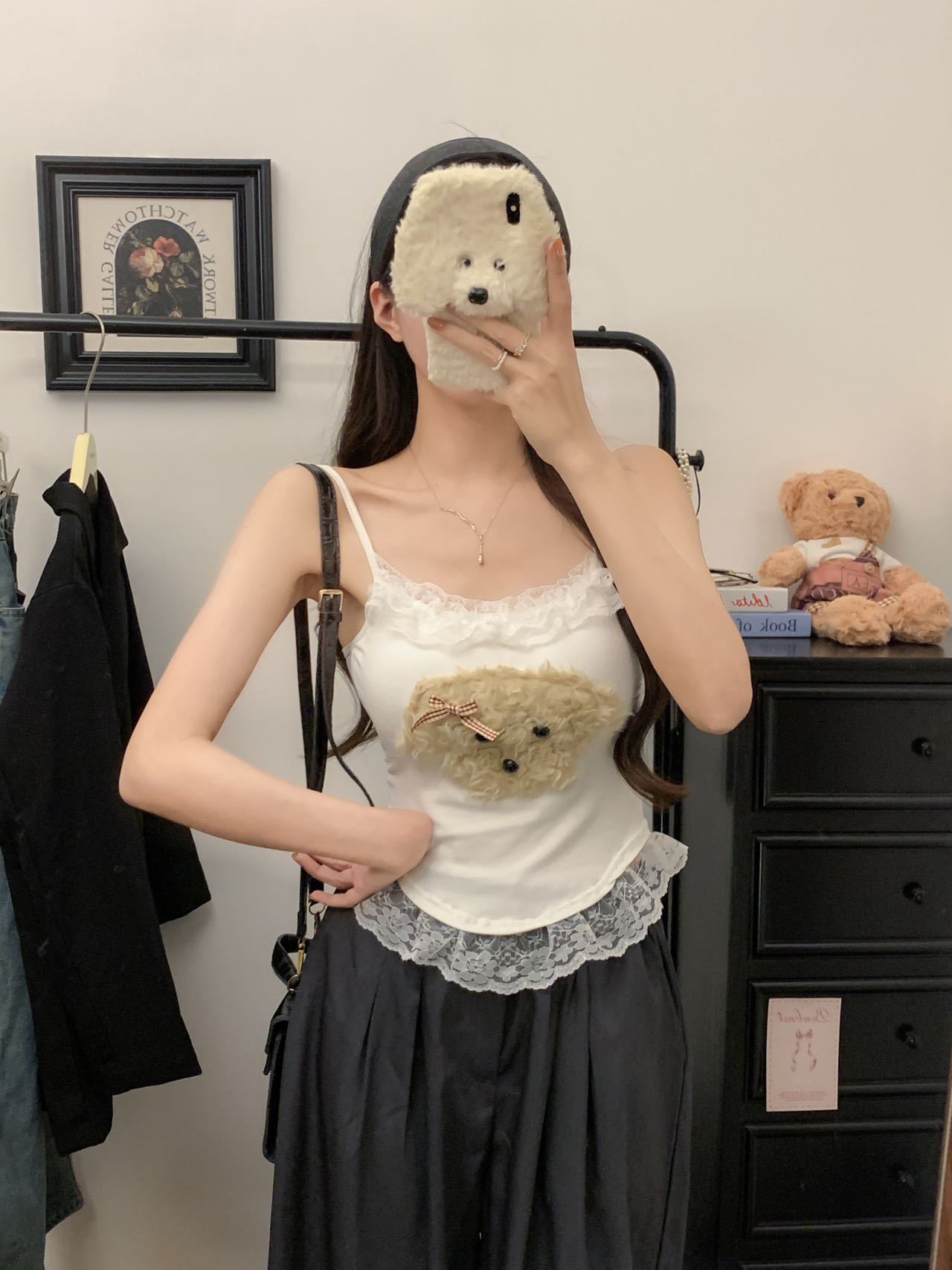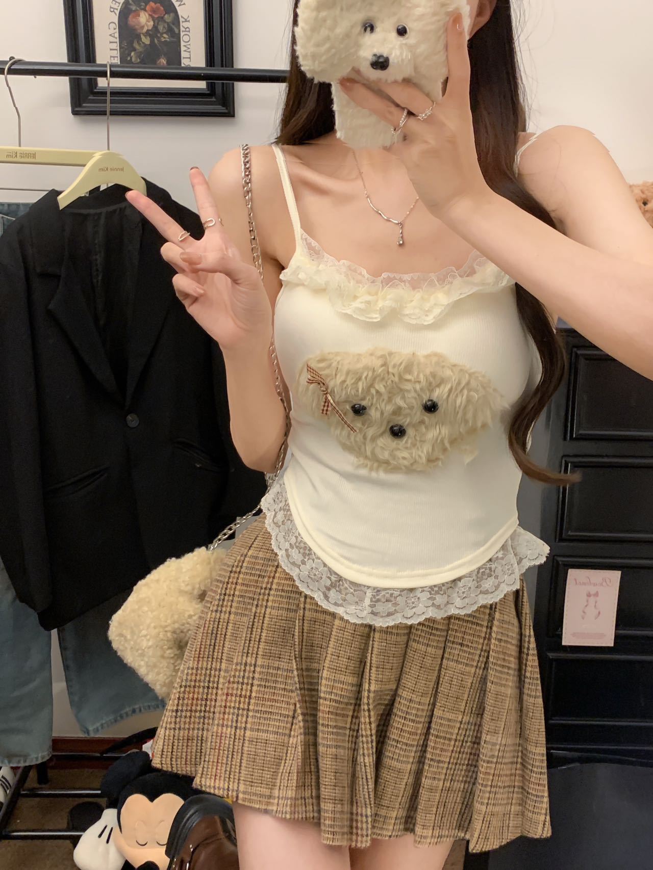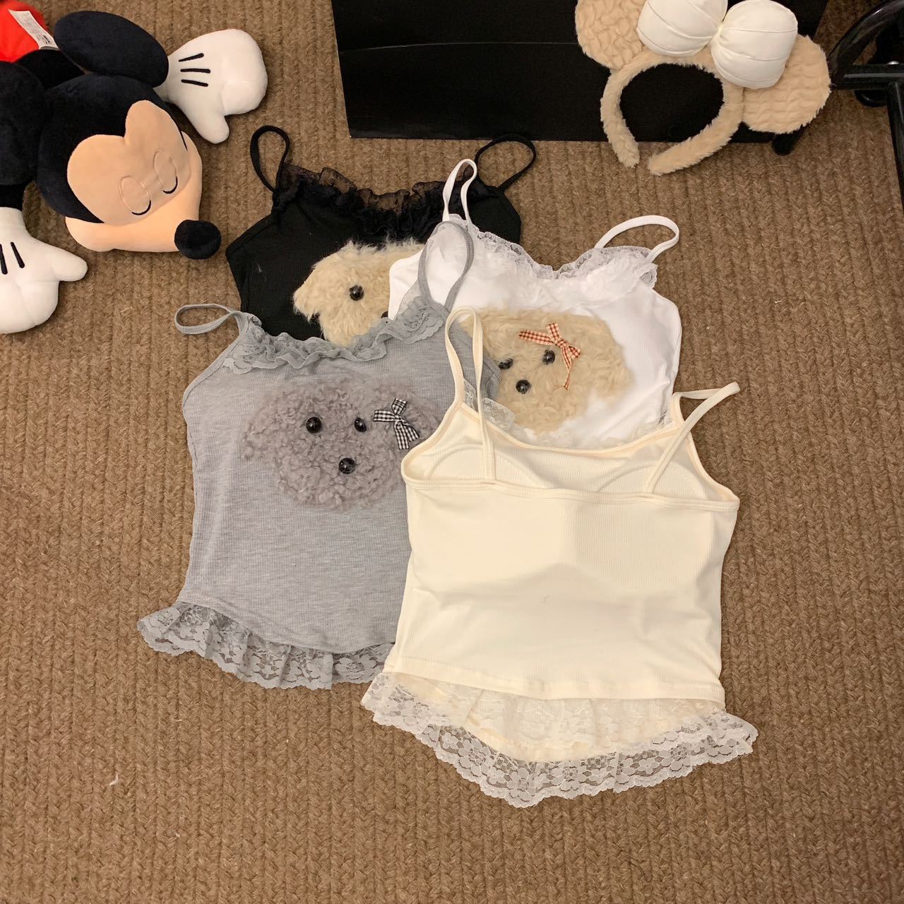 【甜美减龄❗️毛绒小狗蕾丝花边吊带背心】立体毛绒小狗贴布 + 格纹蝴蝶结,奶 fufu 的质感,自带软妹滤镜,颜值与舒适感双在线,花边短款打底上衣服L