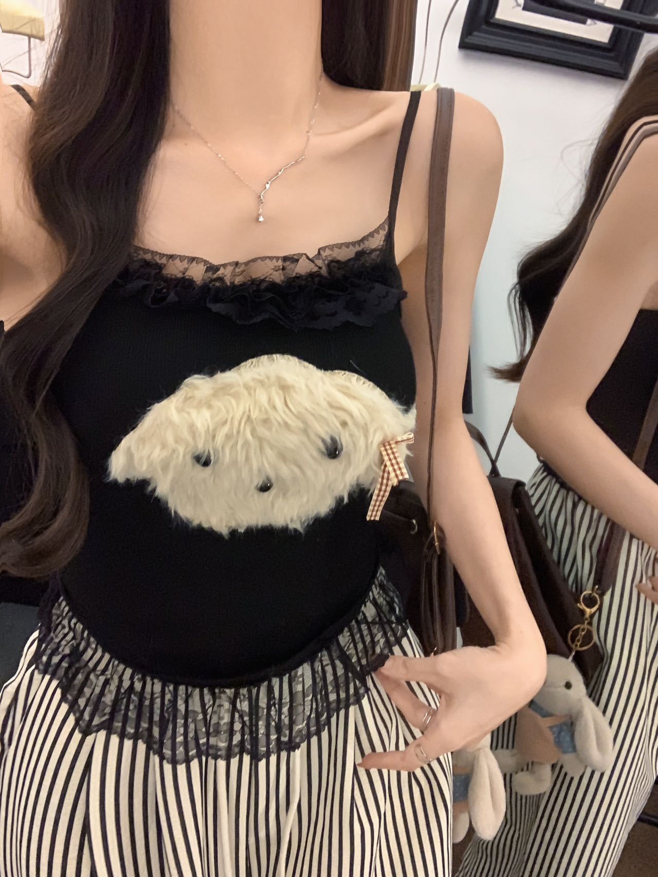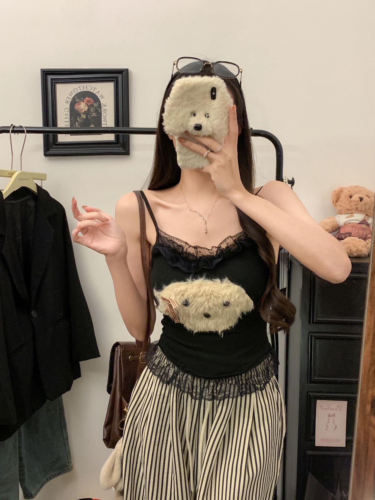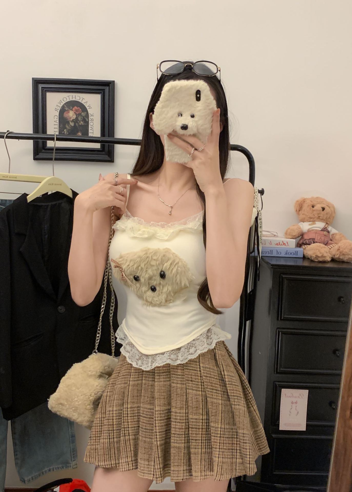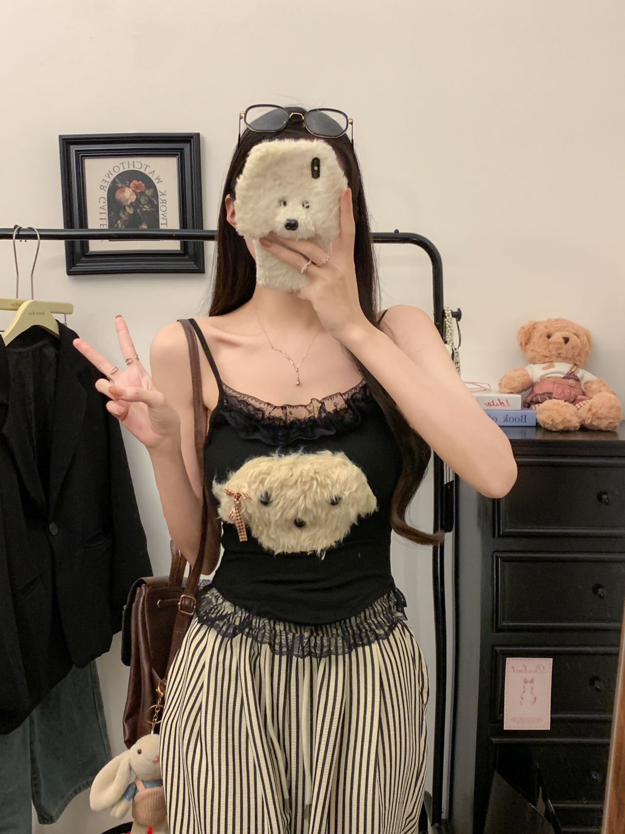 【甜美减龄❗️毛绒小狗蕾丝花边吊带背心】立体毛绒小狗贴布 + 格纹蝴蝶结,奶 fufu 的质感,自带软妹滤镜,颜值与舒适感双在线,花边短款打底上衣服L