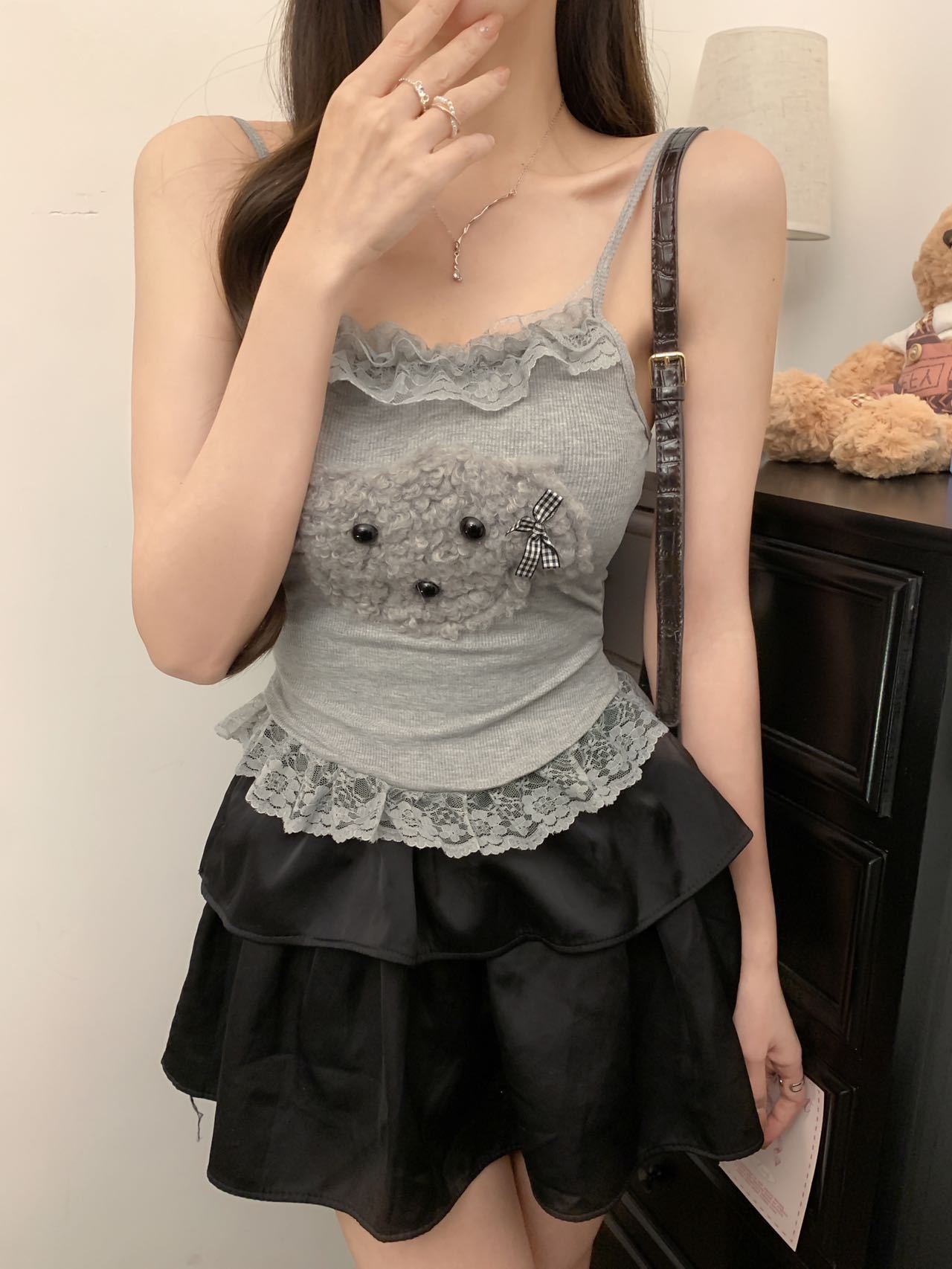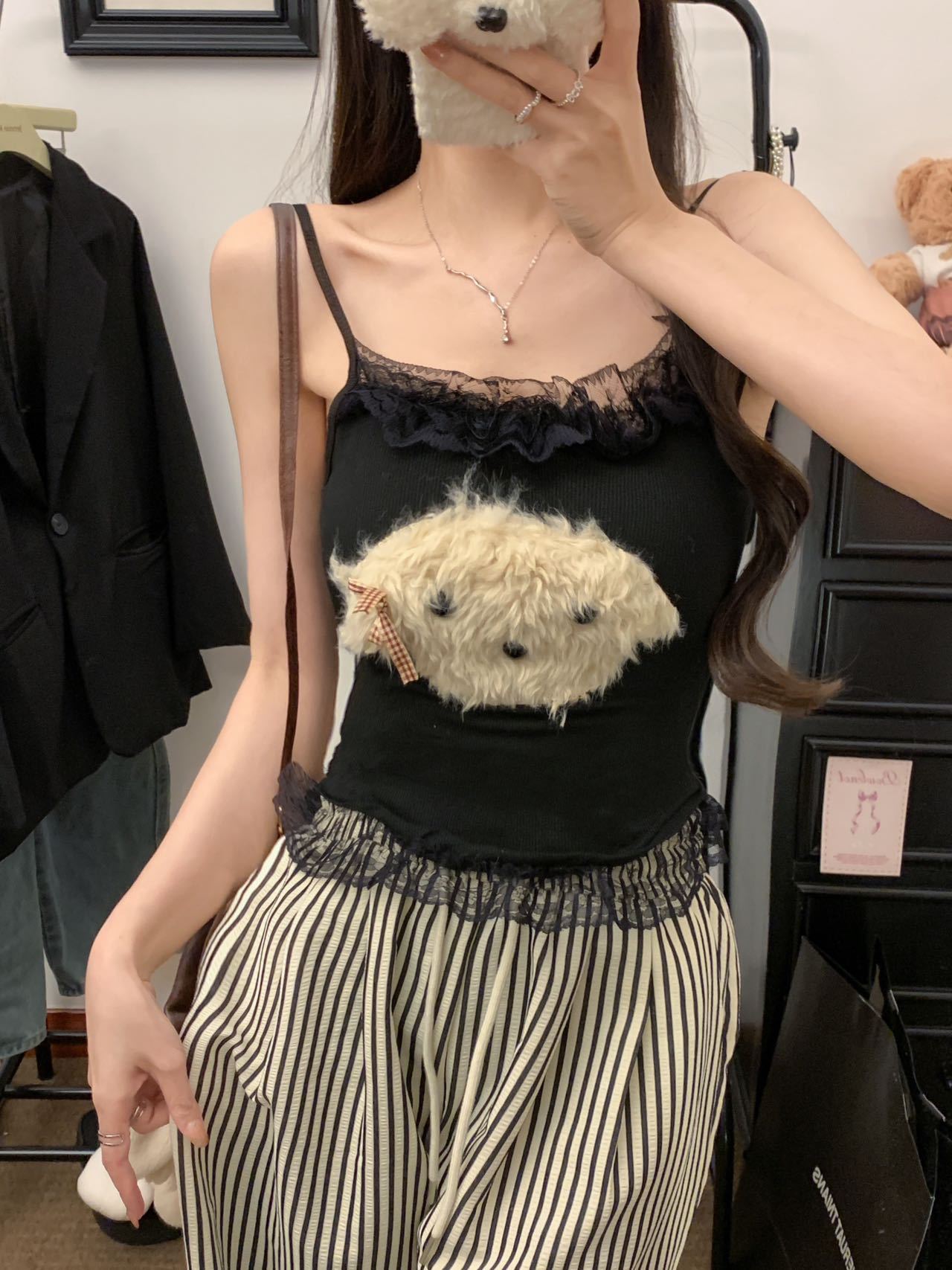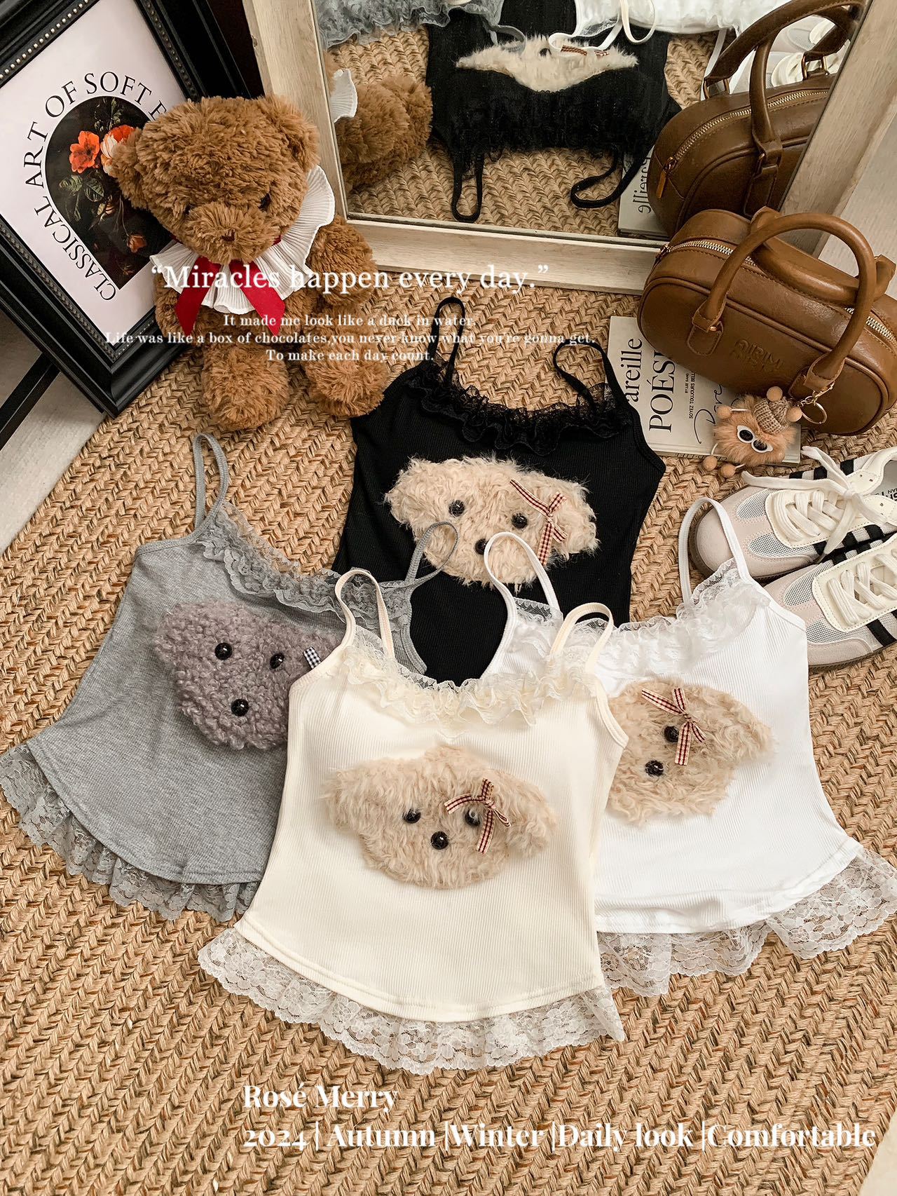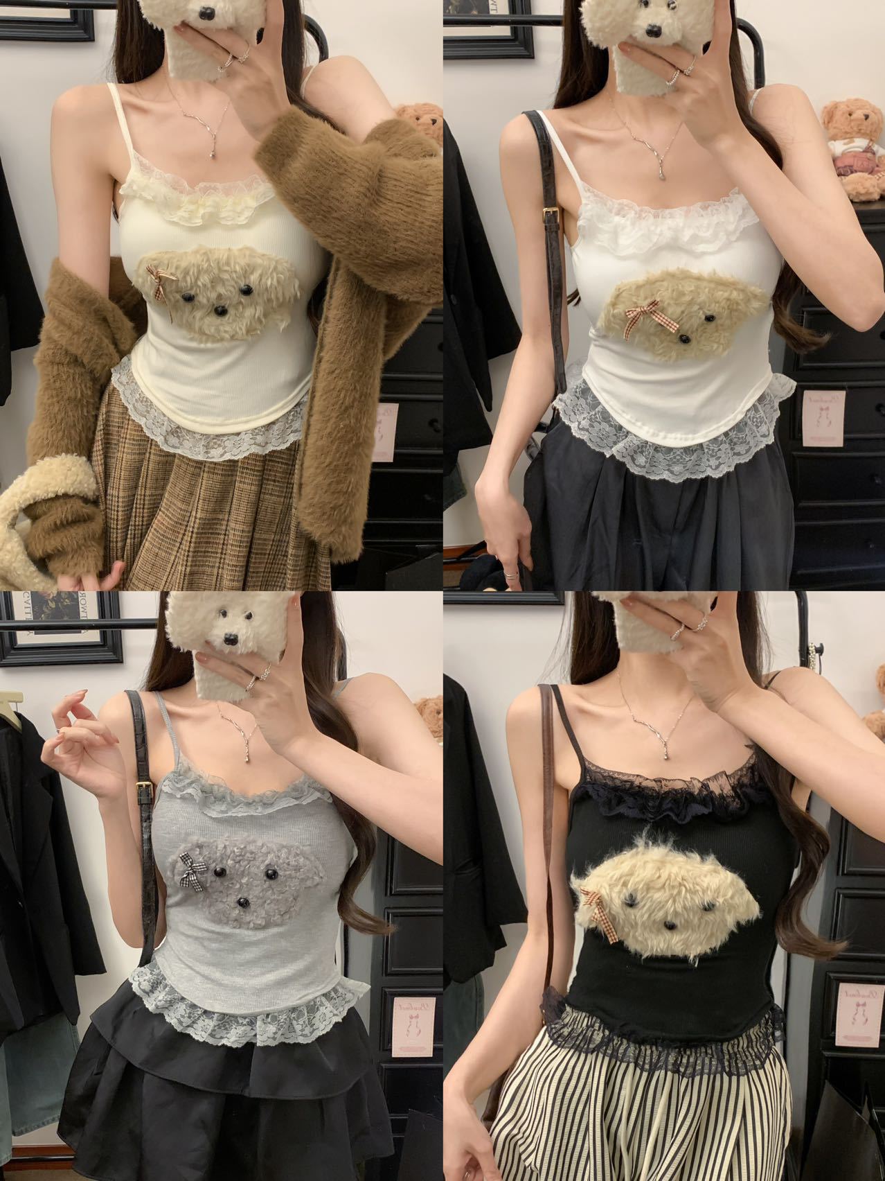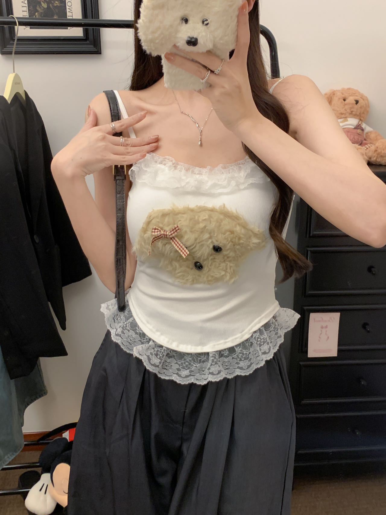 【甜美减龄❗️毛绒小狗蕾丝花边吊带背心】立体毛绒小狗贴布 + 格纹蝴蝶结,奶 fufu 的质感,自带软妹滤镜,颜值与舒适感双在线,花边短款打底上衣服L