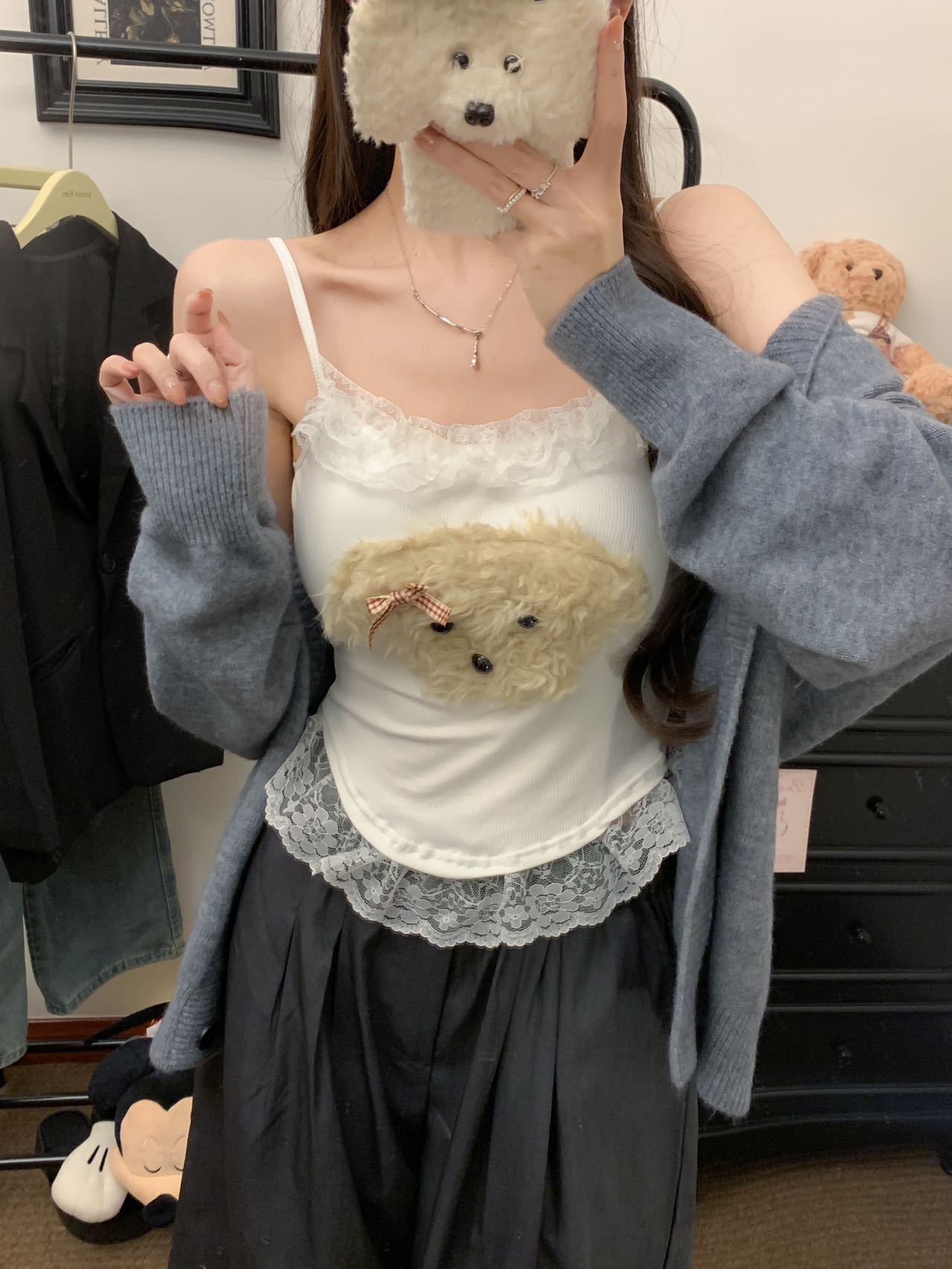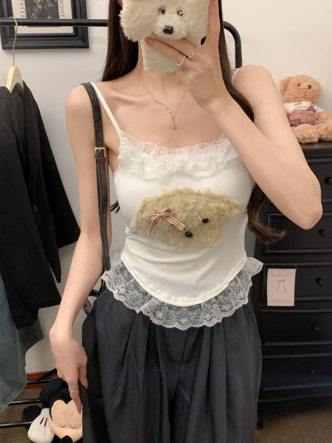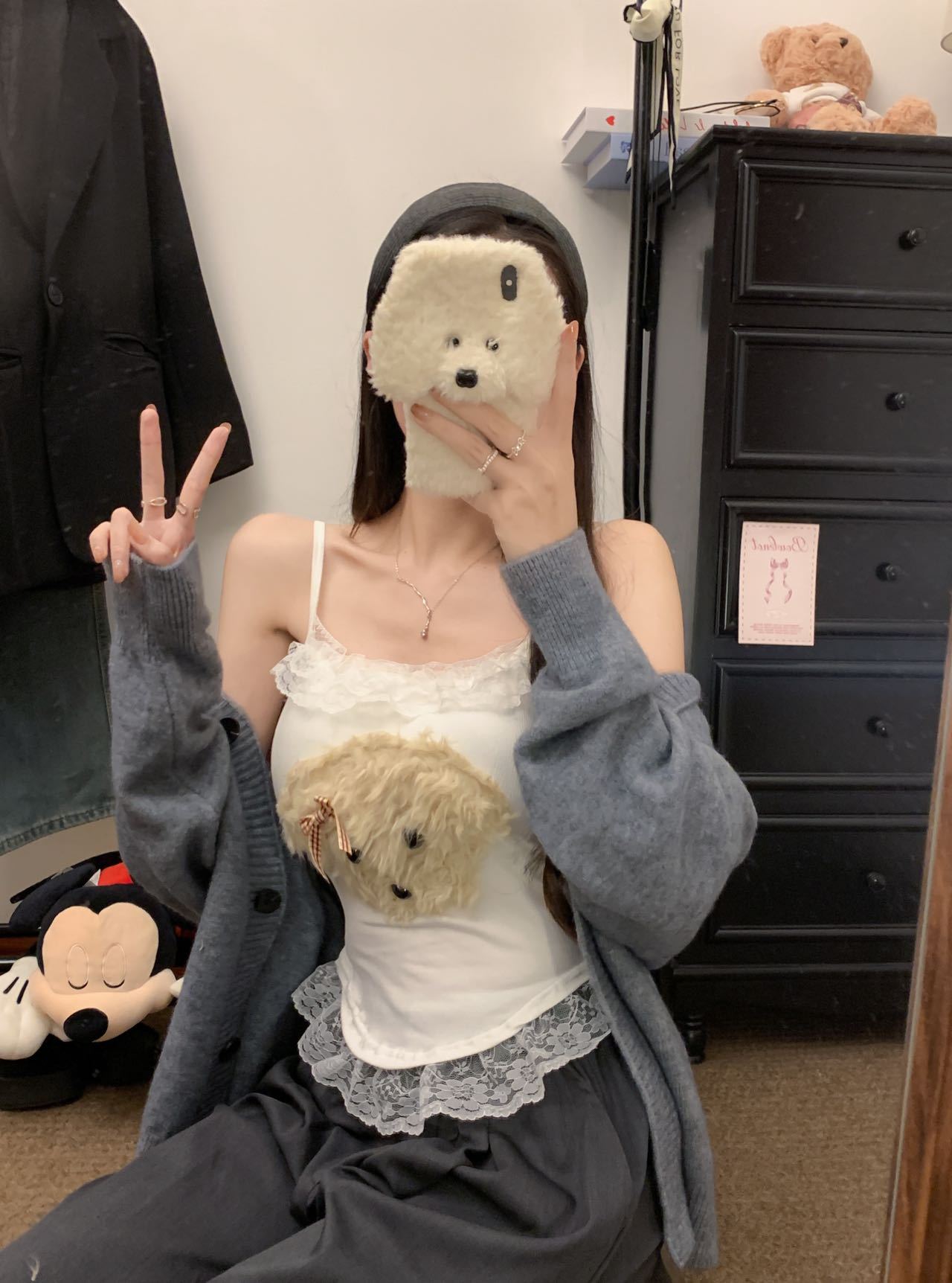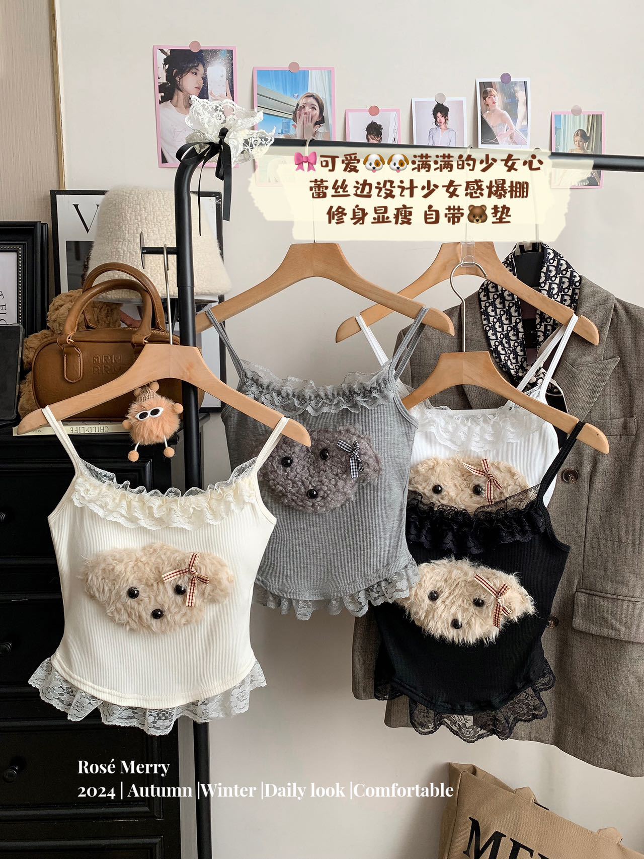 【甜美减龄❗️毛绒小狗蕾丝花边吊带背心】立体毛绒小狗贴布 + 格纹蝴蝶结,奶 fufu 的质感,自带软妹滤镜,颜值与舒适感双在线,花边短款打底上衣服L