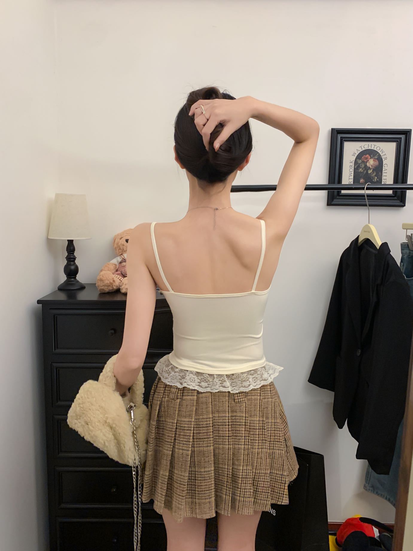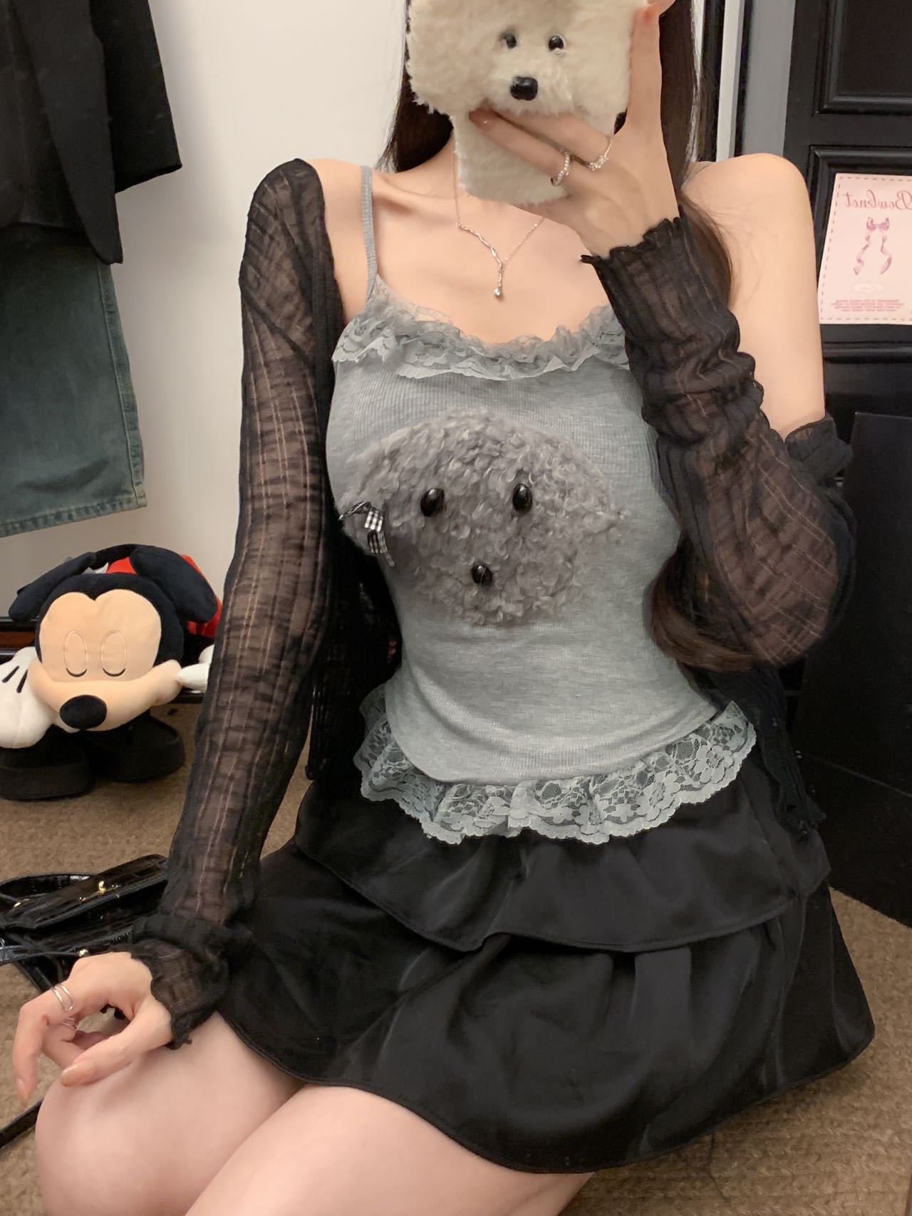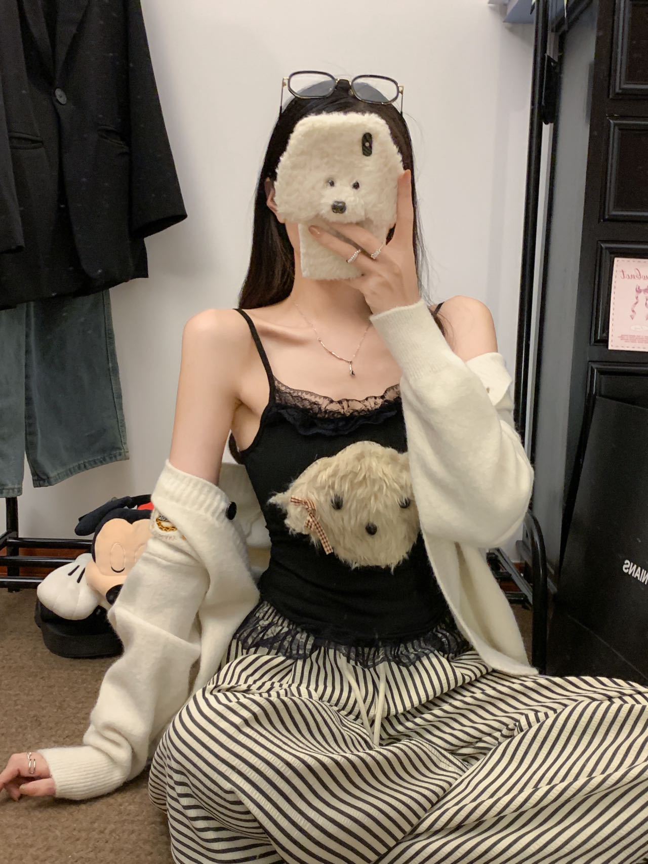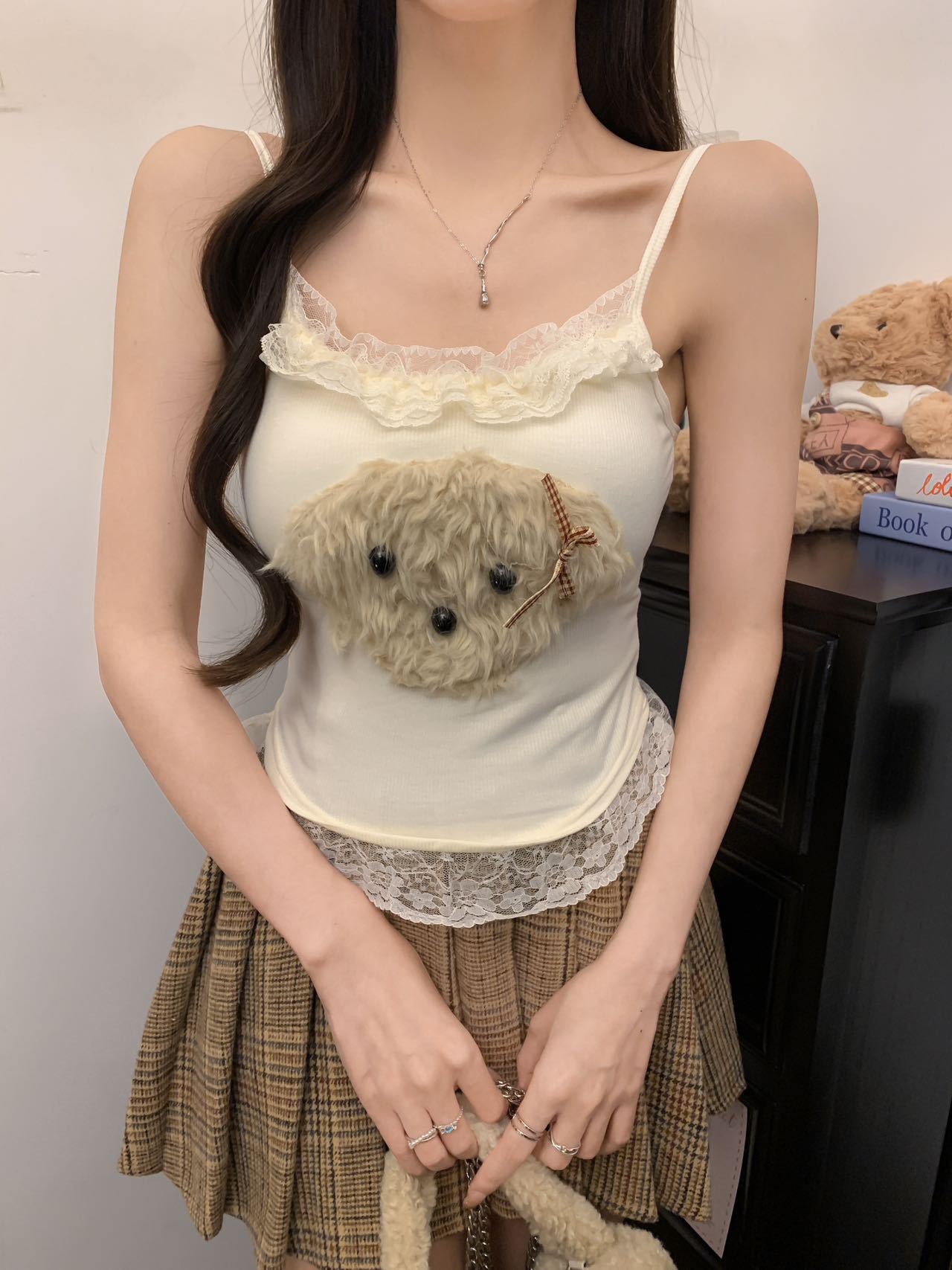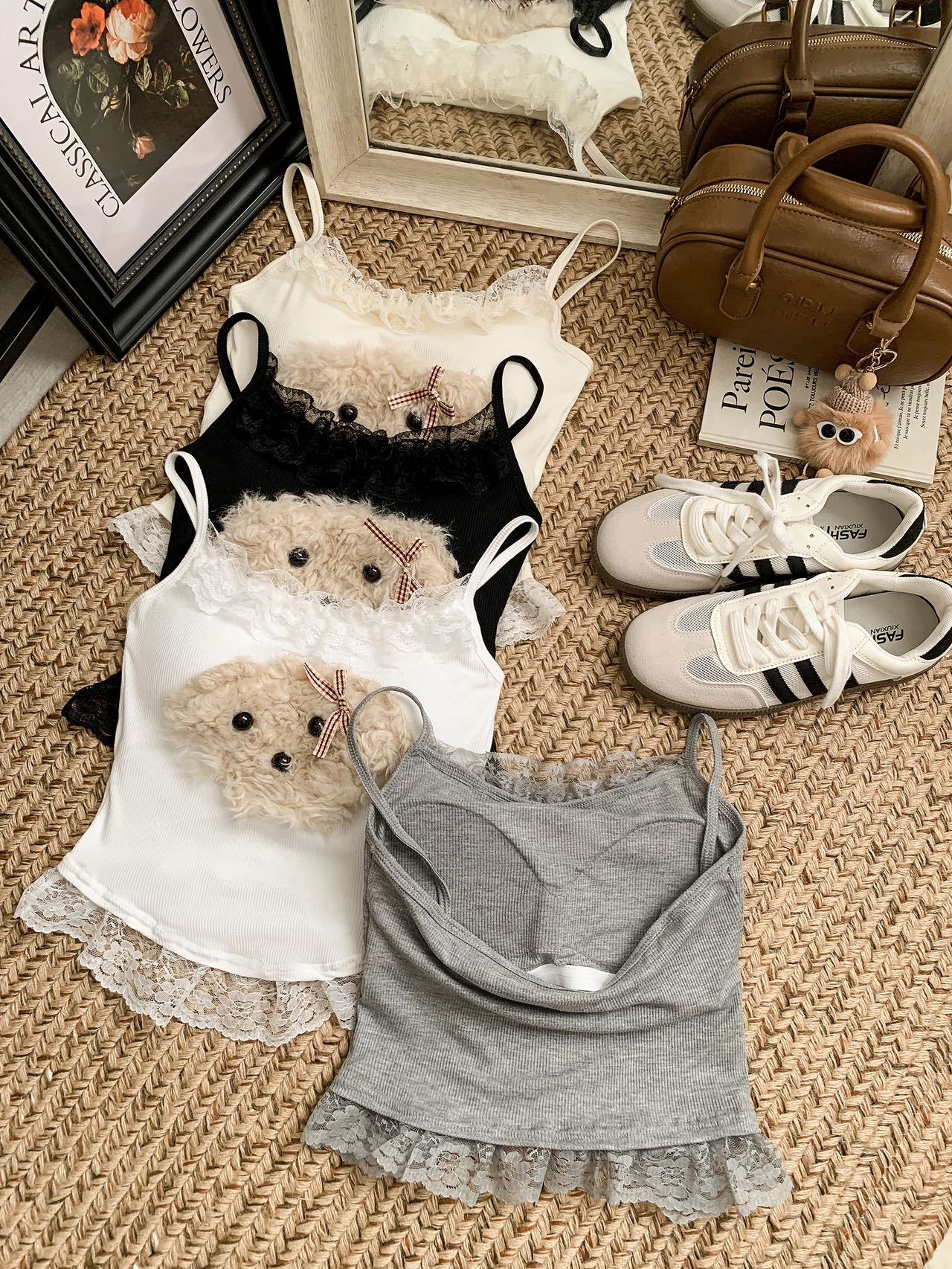 【甜美减龄❗️毛绒小狗蕾丝花边吊带背心】立体毛绒小狗贴布 + 格纹蝴蝶结,奶 fufu 的质感,自带软妹滤镜,颜值与舒适感双在线,花边短款打底上衣服L