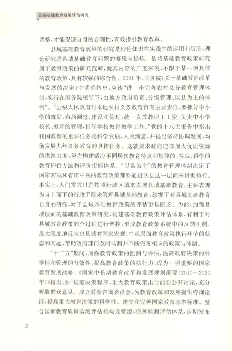 县域基础教育是构成整个国家基础教育的基本区域单位,是整个国家基础教育的一个质点。县域基础教育政策,就是立足现有基础教育存在的社会经济、文化和历史等各方面的差异,在国家和省市基础教育政策的基础上的县域实施,它是高一级行政区域基础教育政策的具体实施,也是立足县域差异的自主建设。而教育政策评估是指根据教育政策所要达到的目标,按照一定的标准,通过一定的程序和方法,对教育政策问题确认、政策制定、执行与变更过程及其实施成效进行的事实判断和价值判断。而对县域基础教育政策评估的界定是基于县域基础教育政策所要达到的目标而进行的一种事实判断与价值判断。
