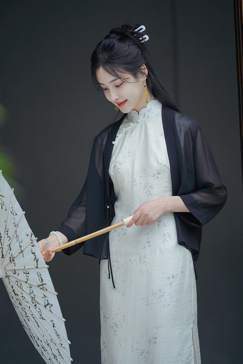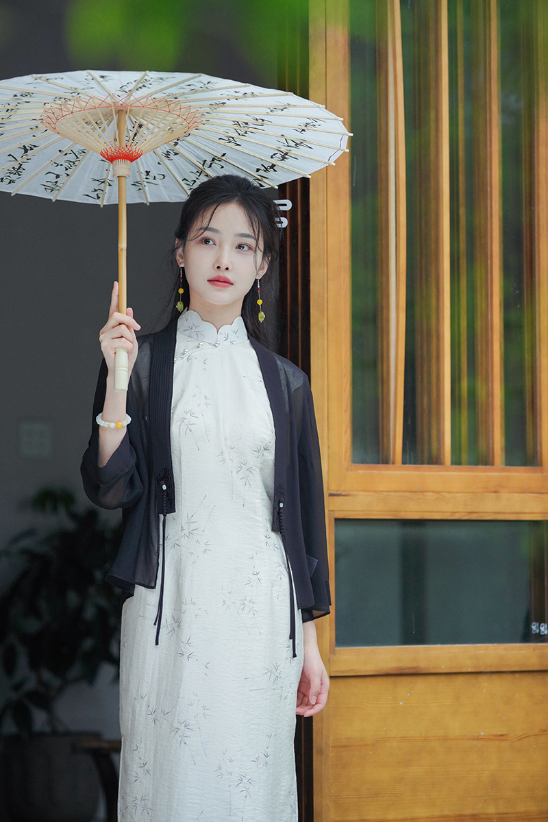 ✨墨染黑可以搭配淡色旗袍,能与旗袍形成对比,很有层次感。黑色显得人端庄又有气质,黑色真的超级显瘦,穿上就是纸片人的感觉,相对来说防晒指数会略高一些哦~