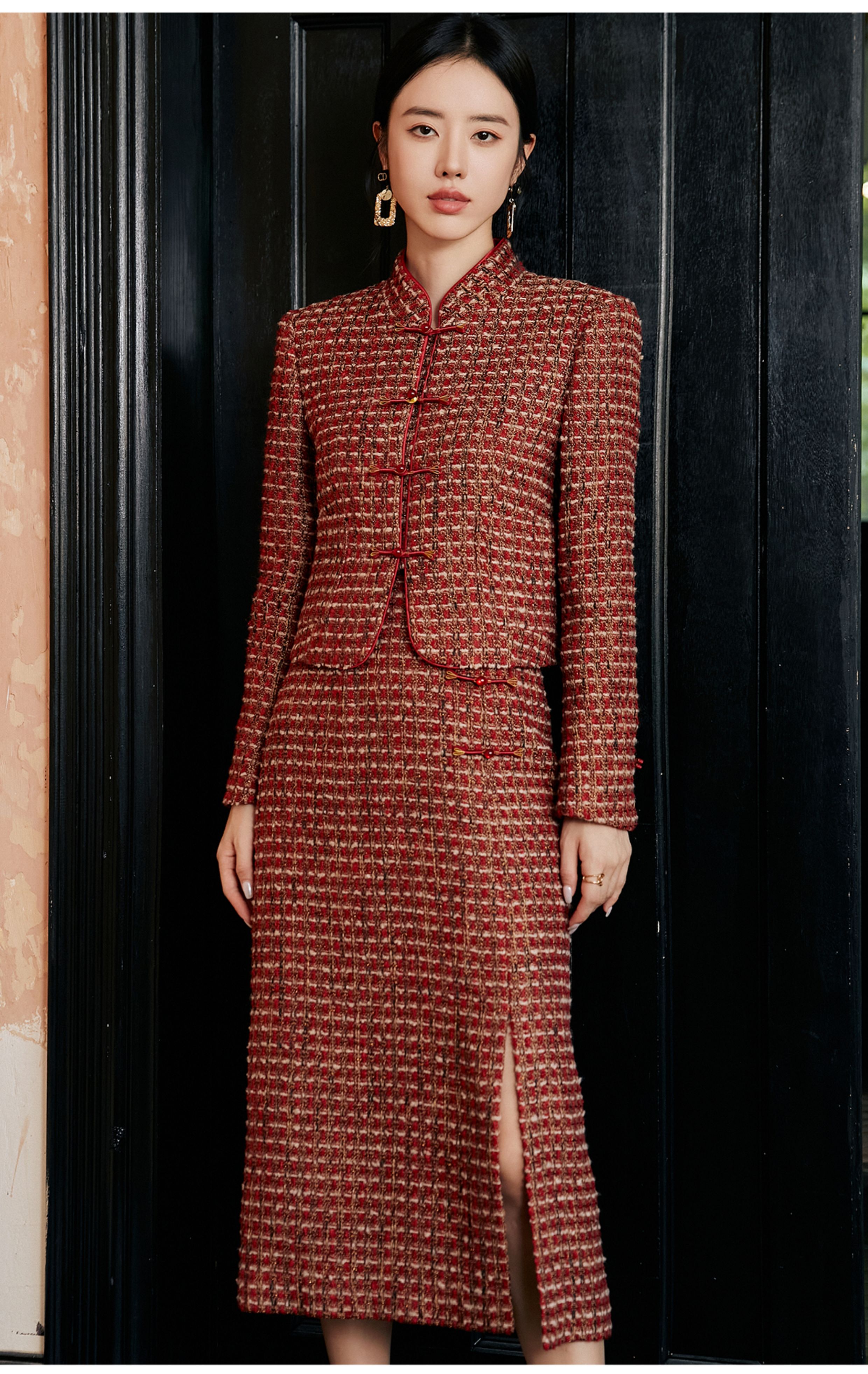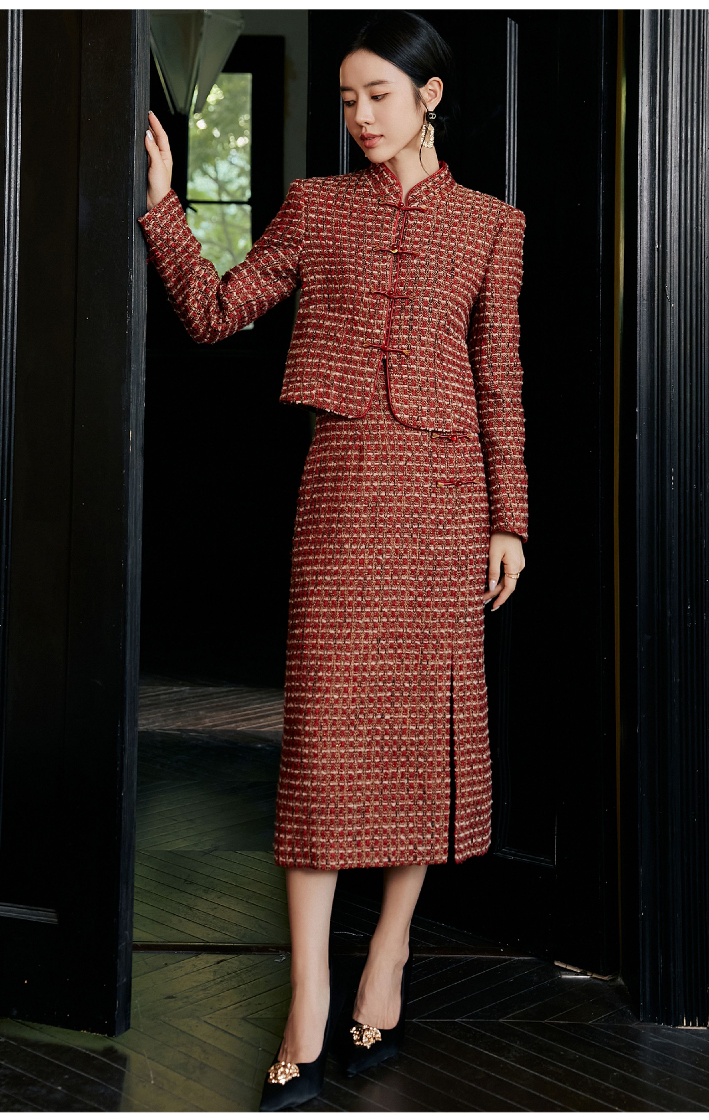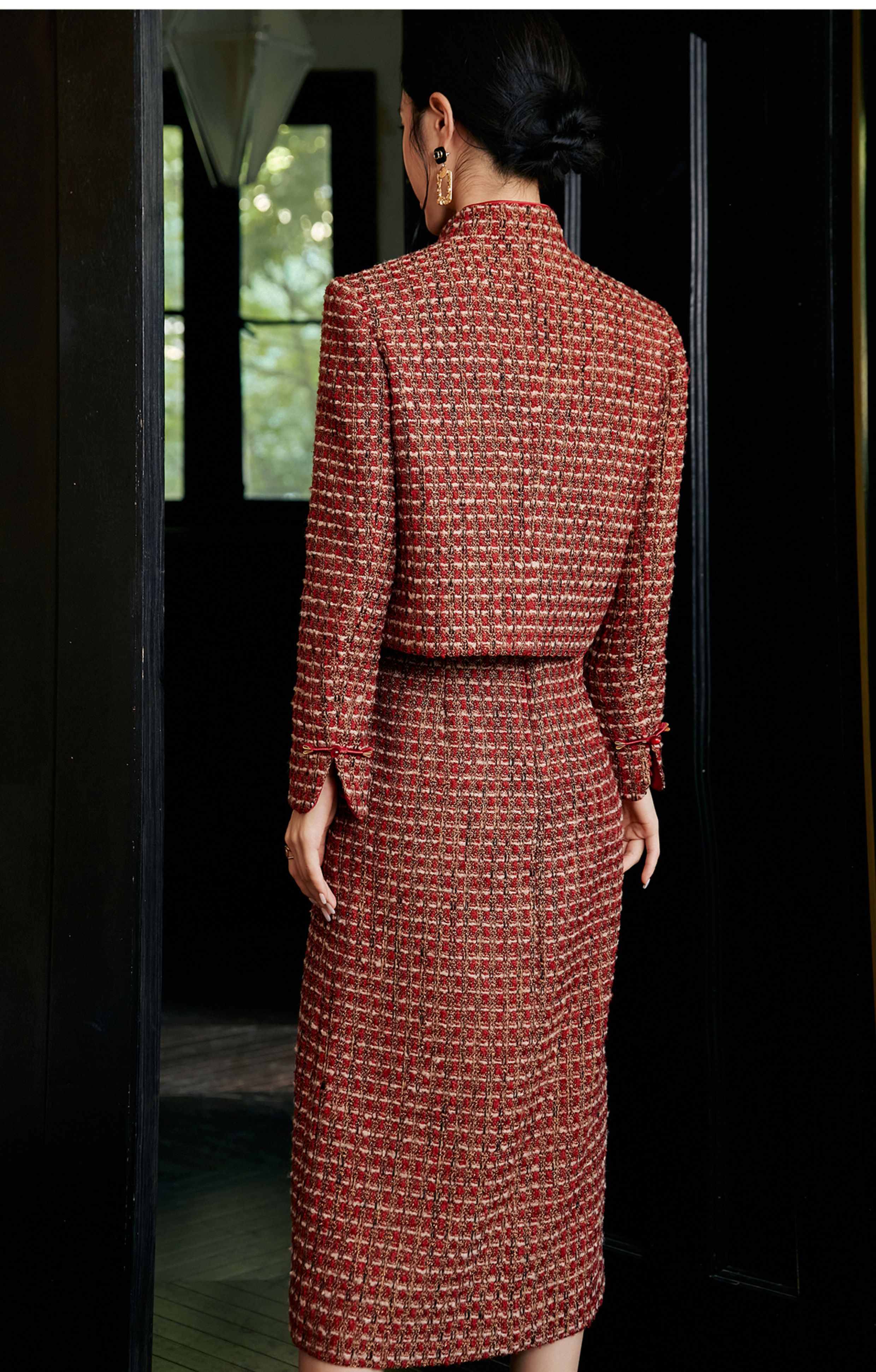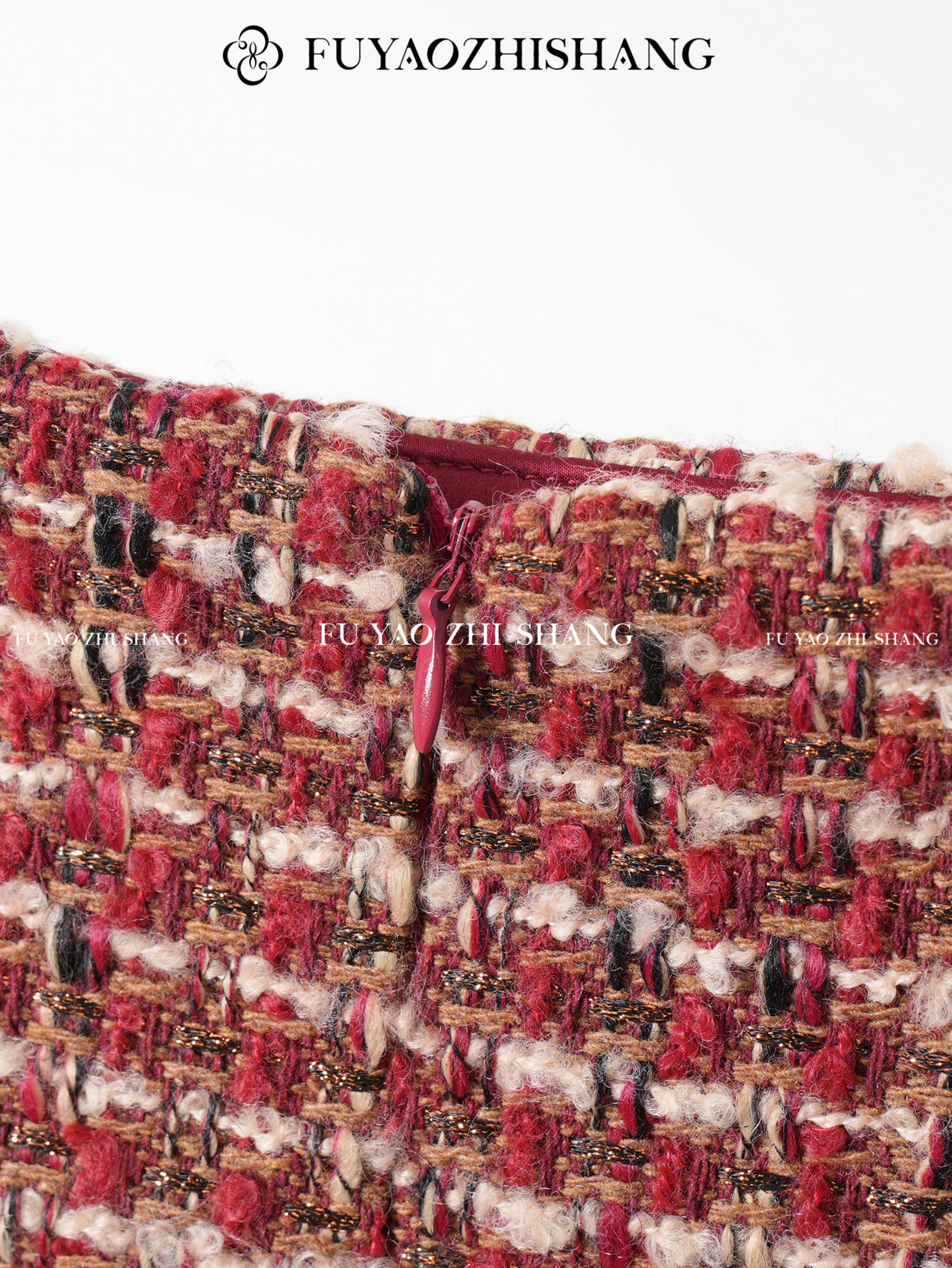 FUYAO扶摇 轻奢重工外套开叉半身裙红色小香风粗花呢编织羊毛套装