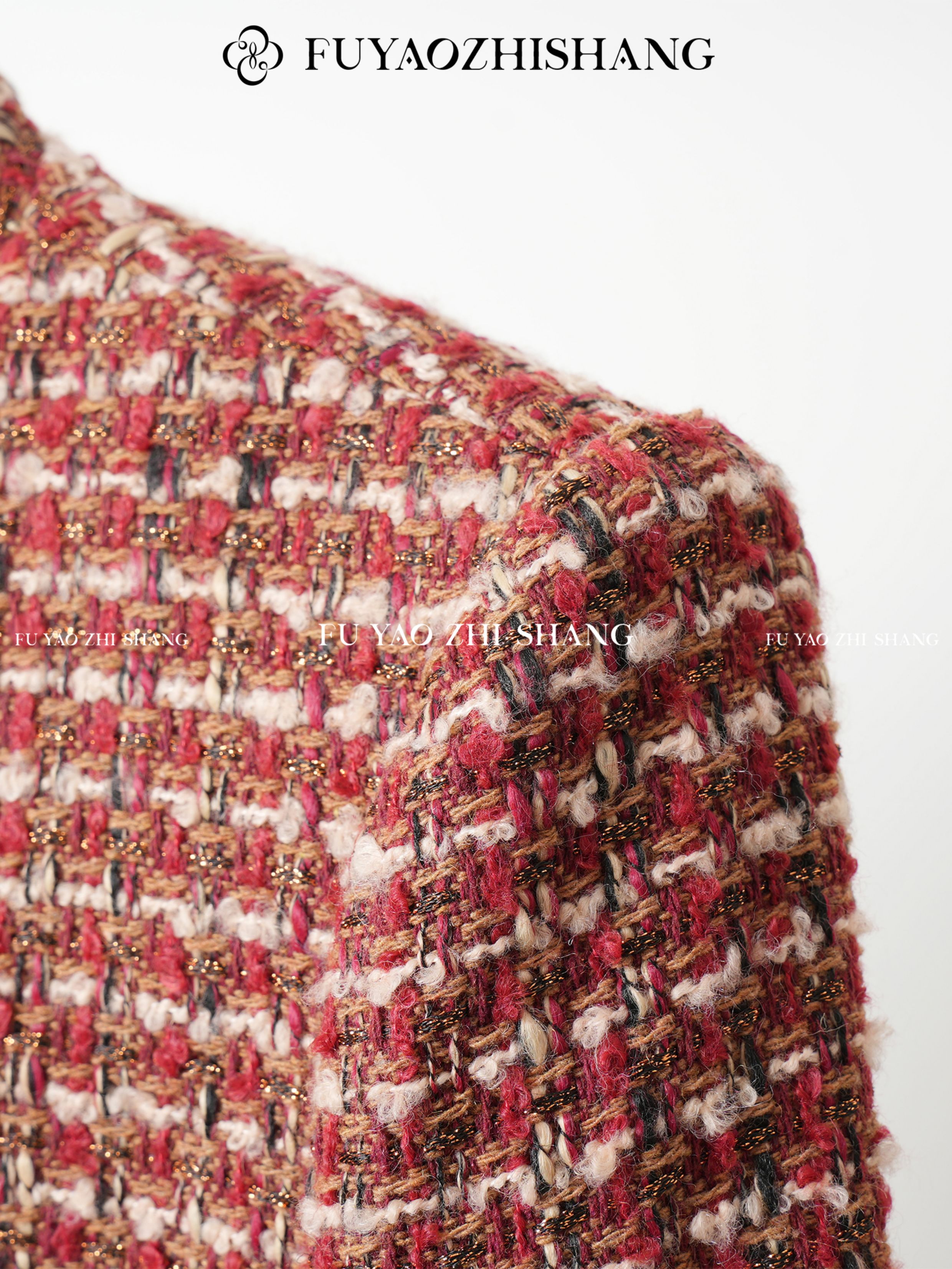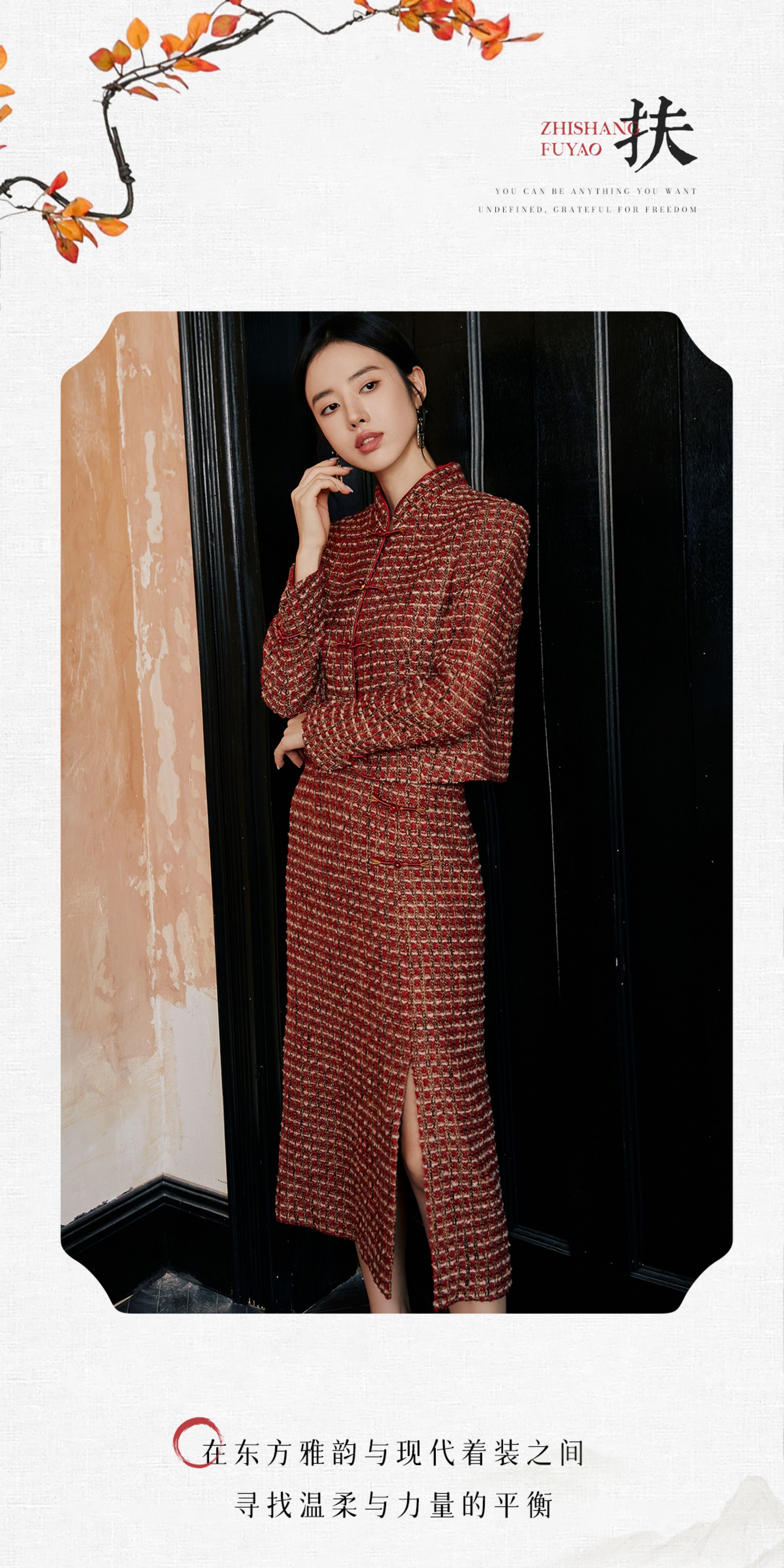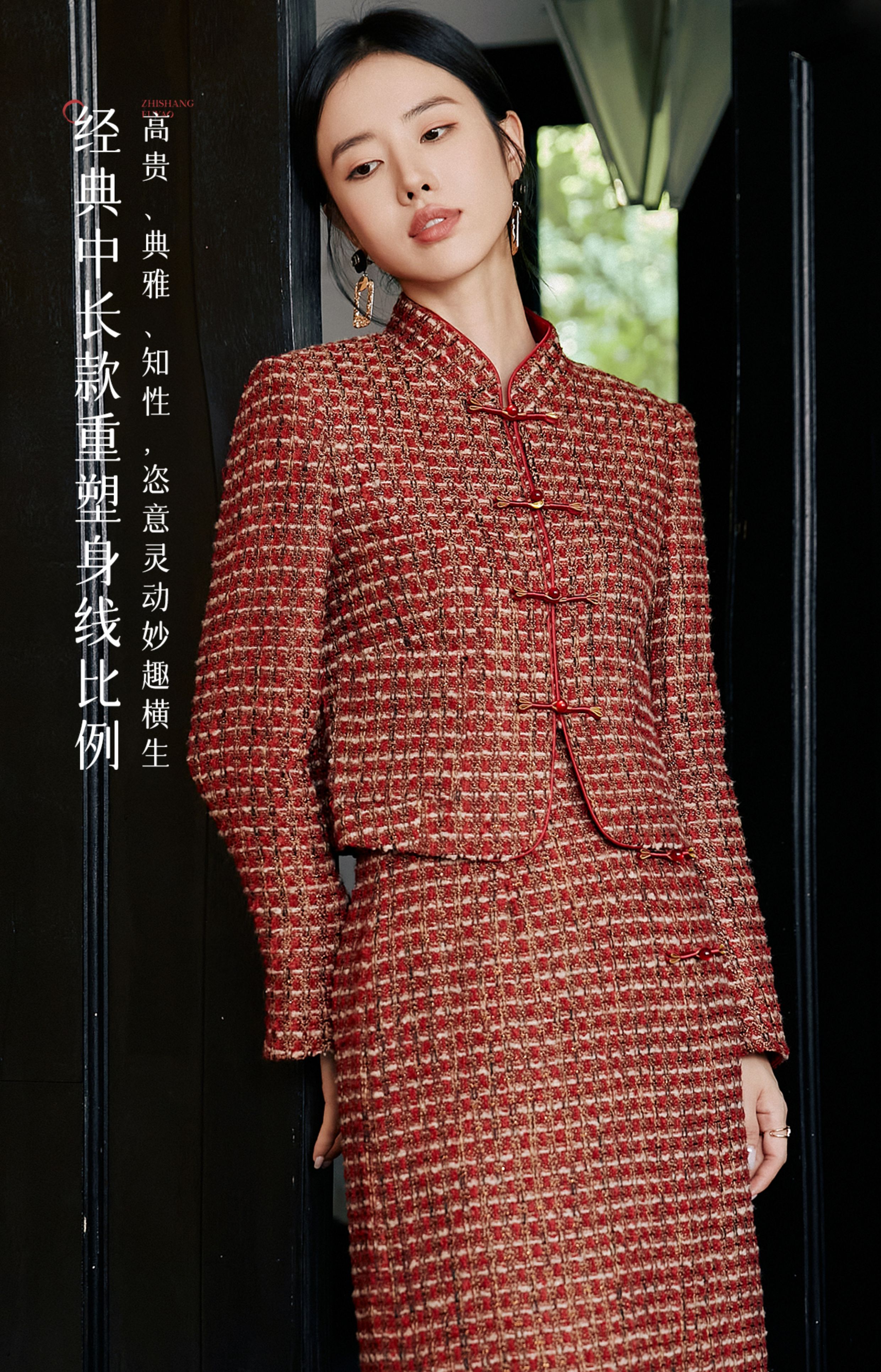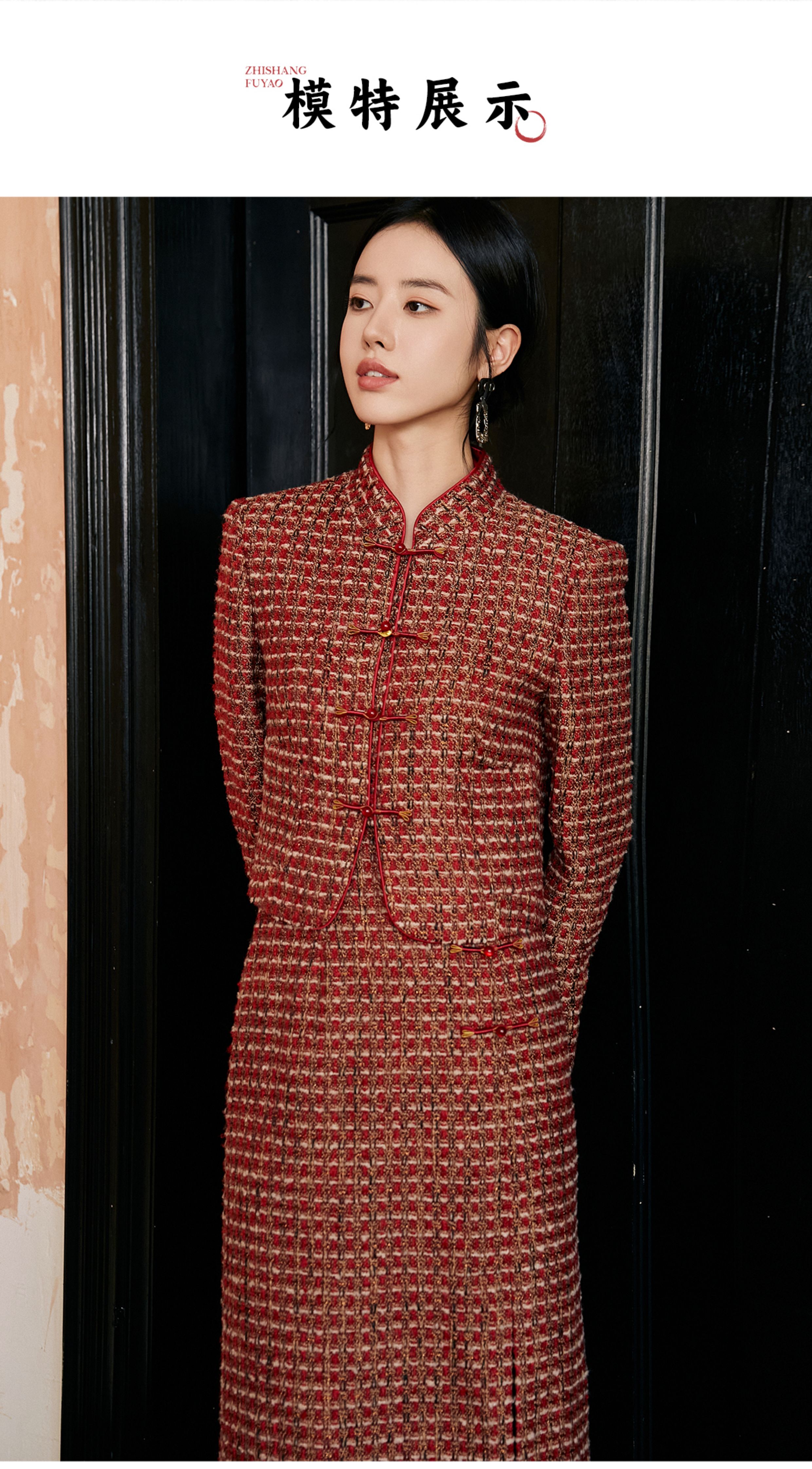 FUYAO扶摇 轻奢重工外套开叉半身裙红色小香风粗花呢编织羊毛套装