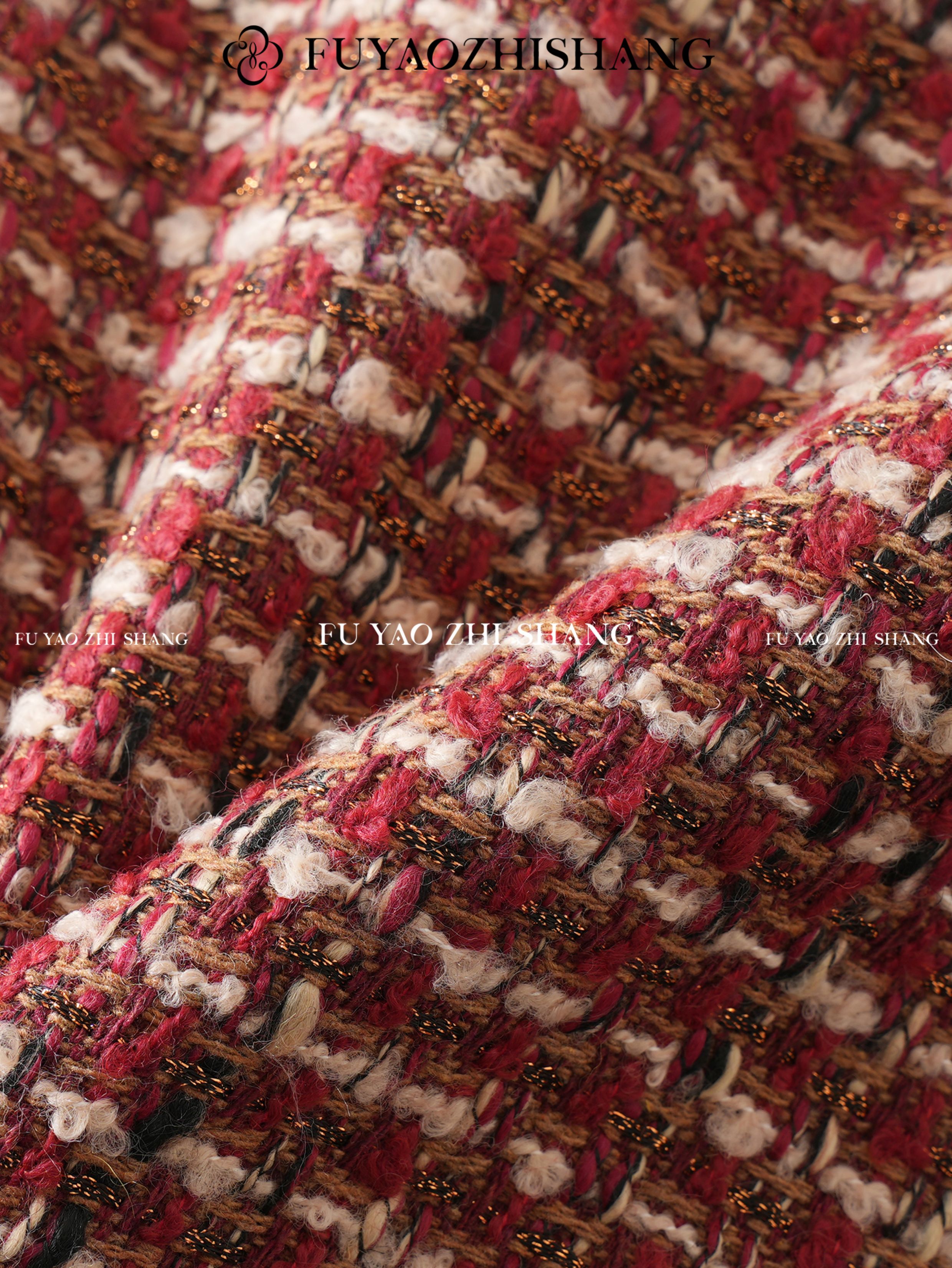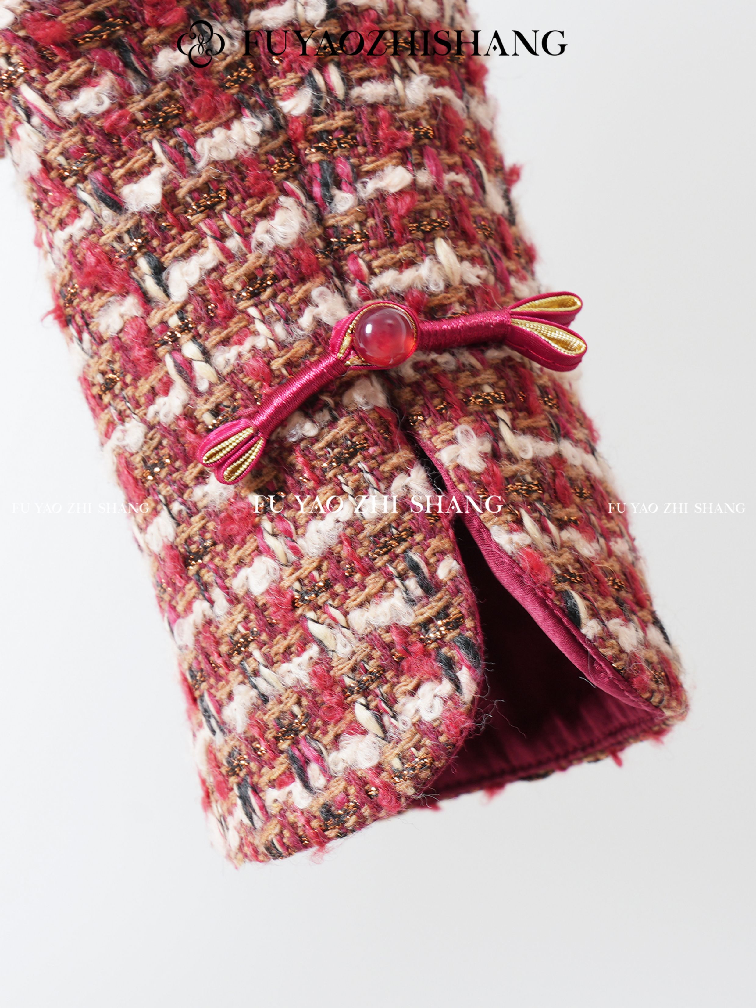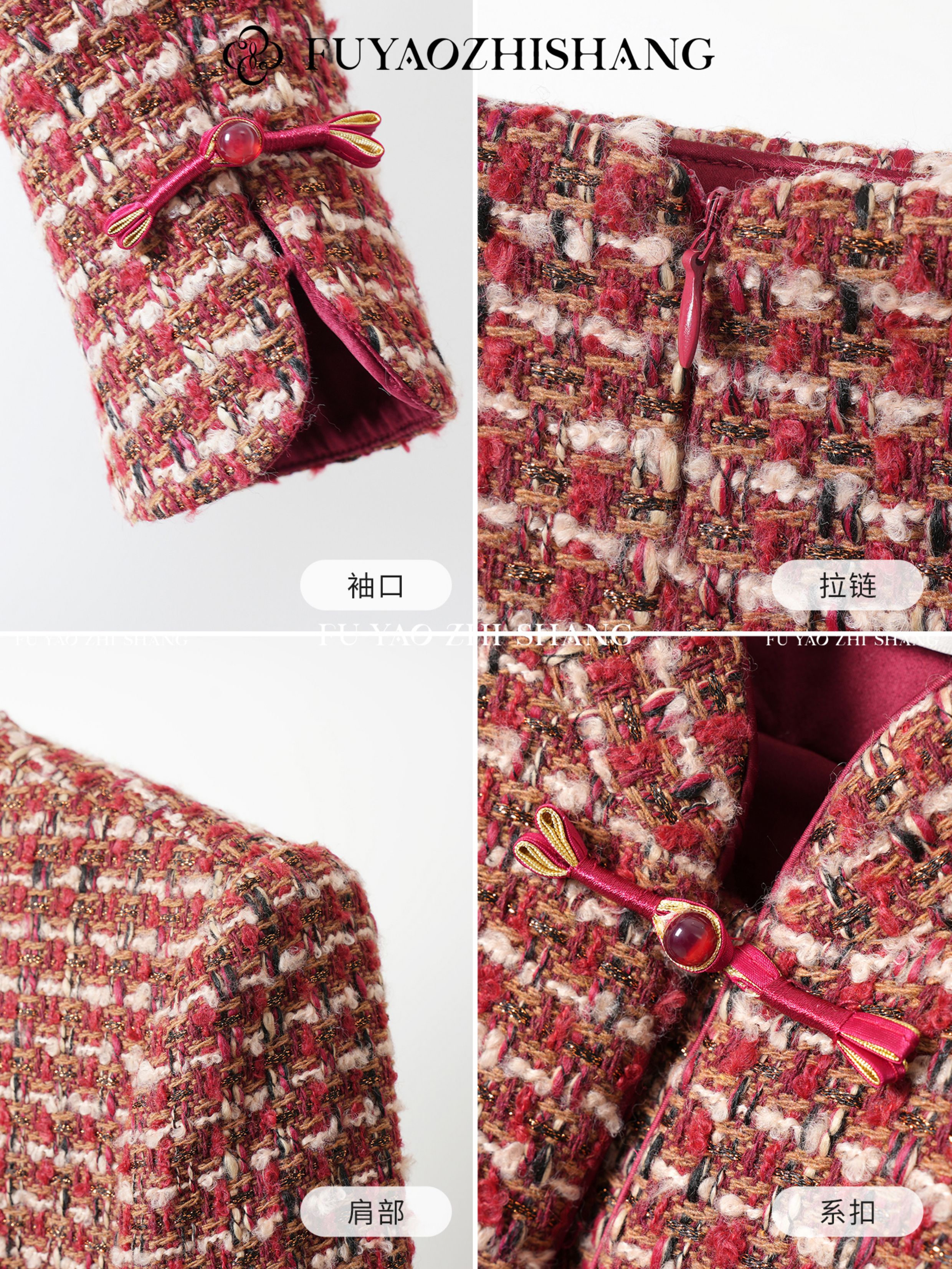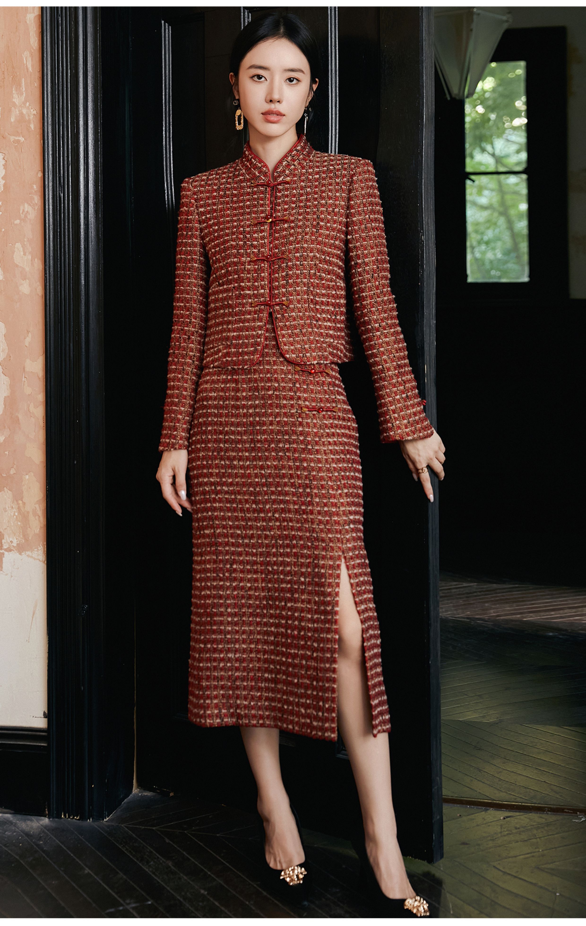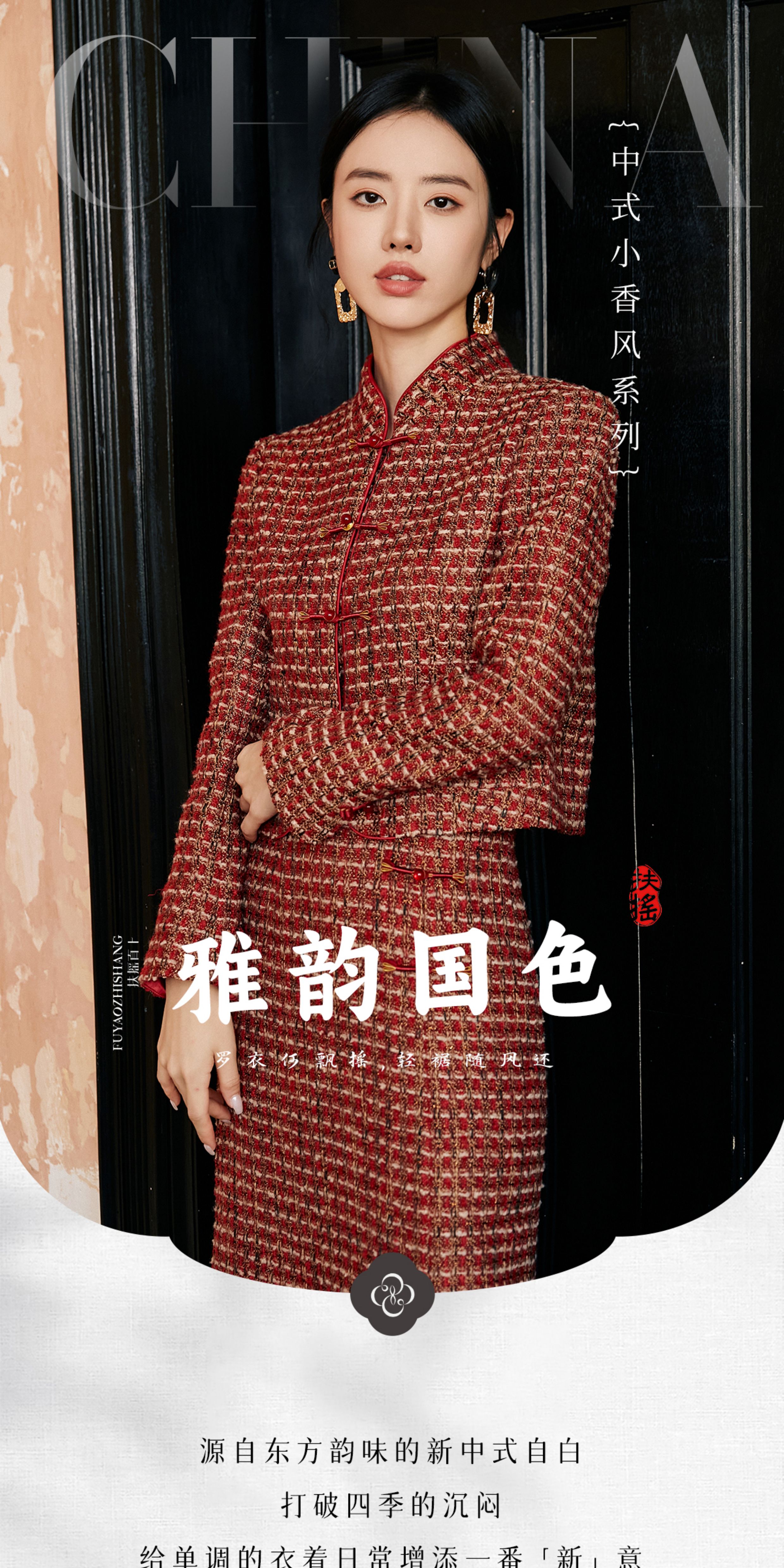 FUYAO扶摇 轻奢重工外套开叉半身裙红色小香风粗花呢编织羊毛套装