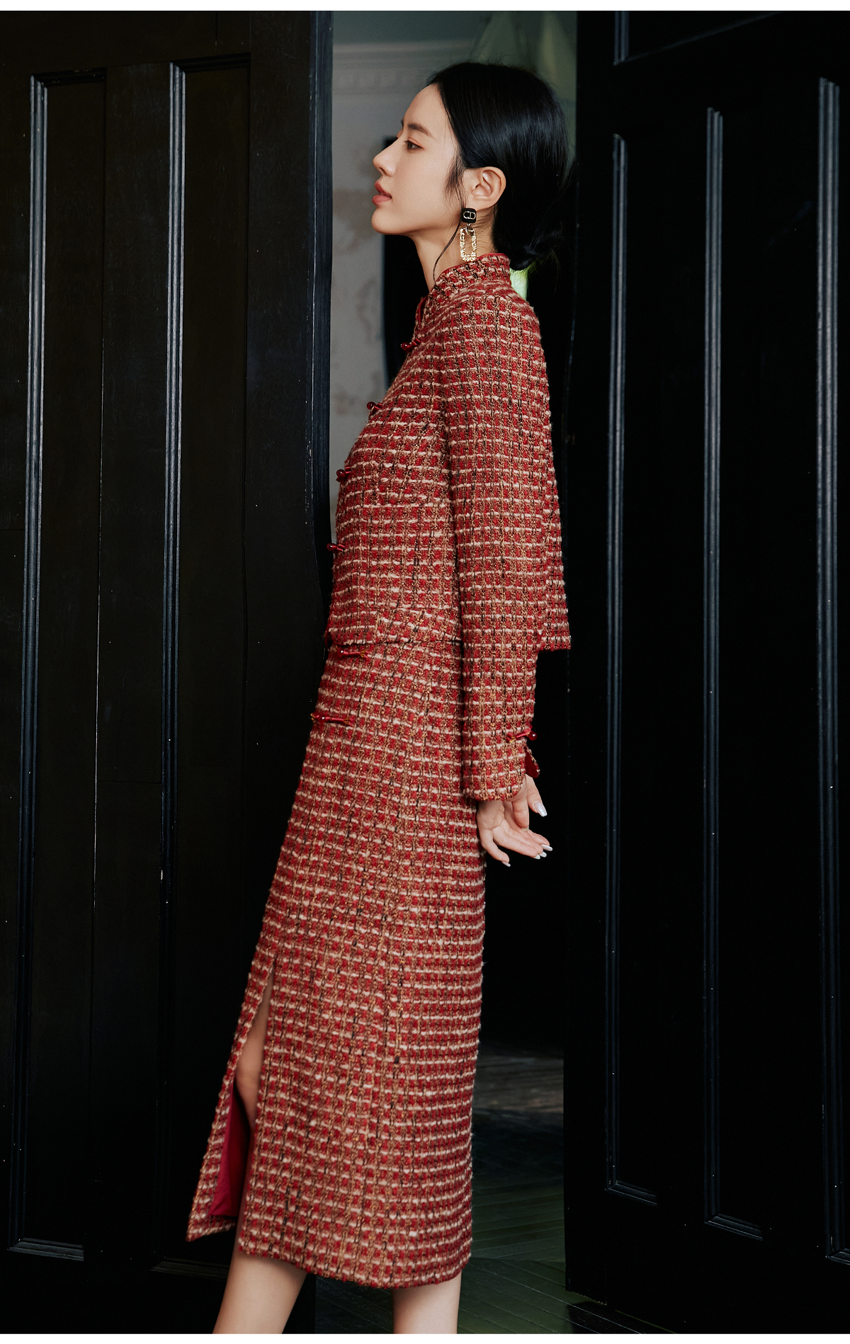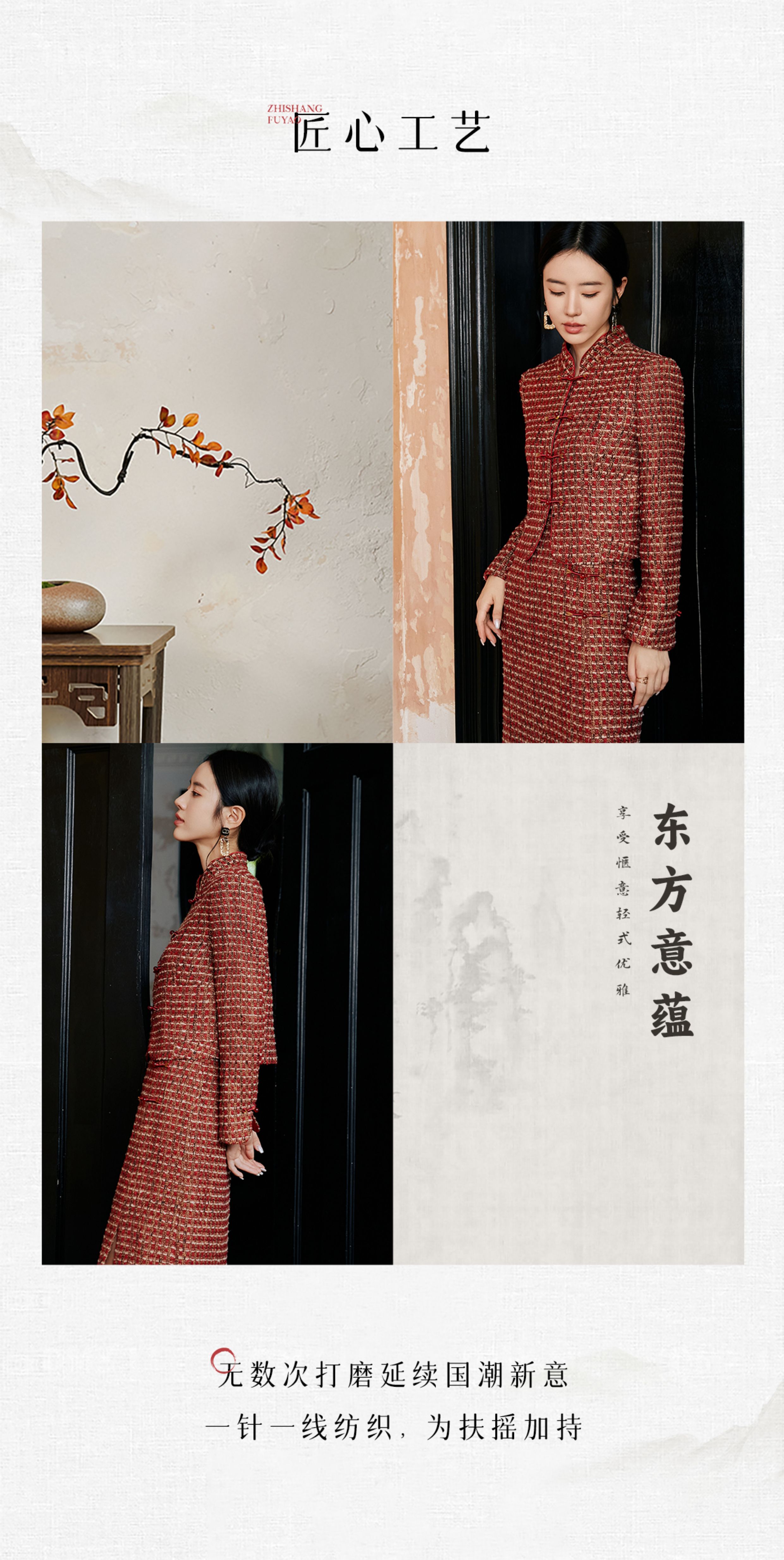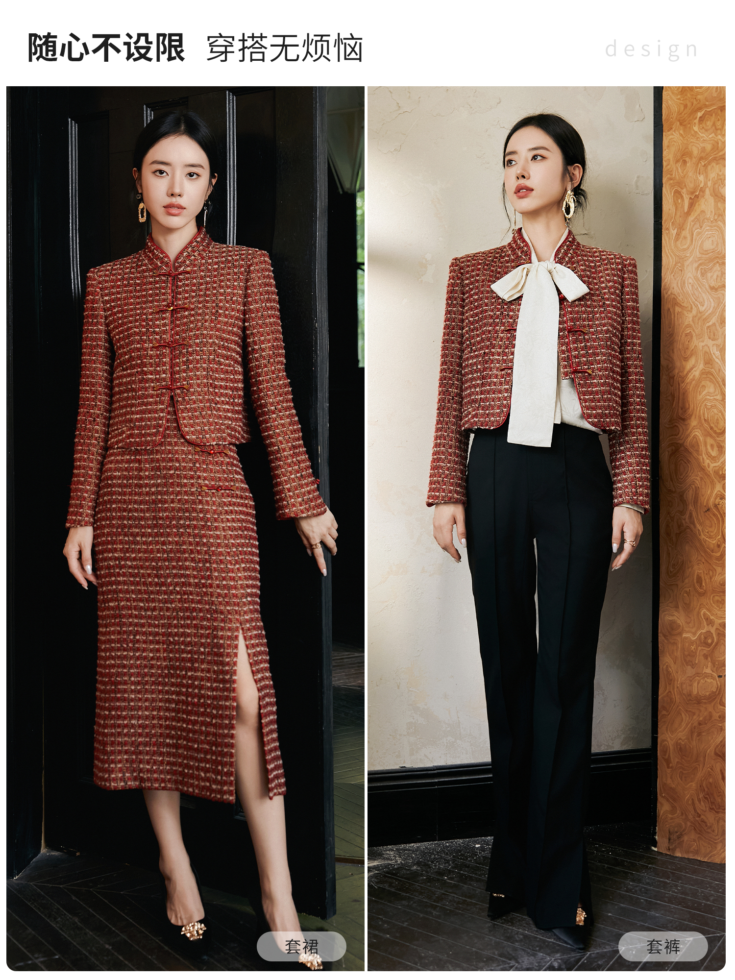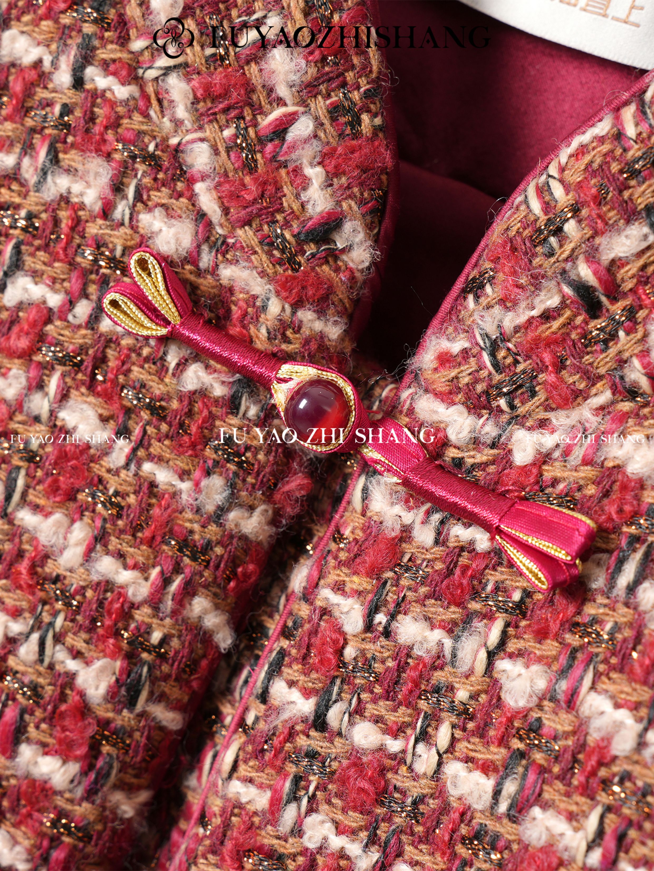 FUYAO扶摇 轻奢重工外套开叉半身裙红色小香风粗花呢编织羊毛套装