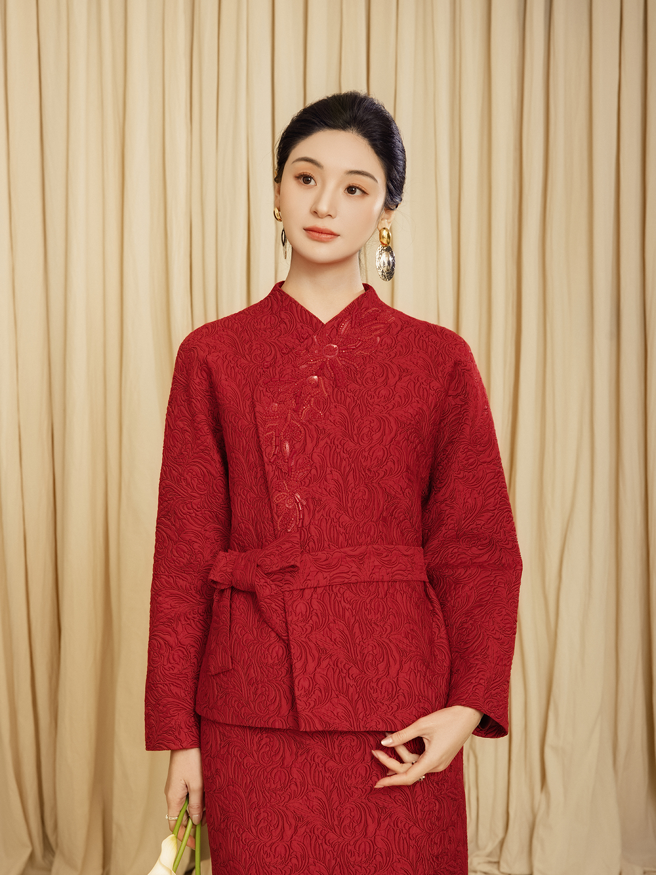 盛唐婧 |米杏色国风提花上衣[特价品]