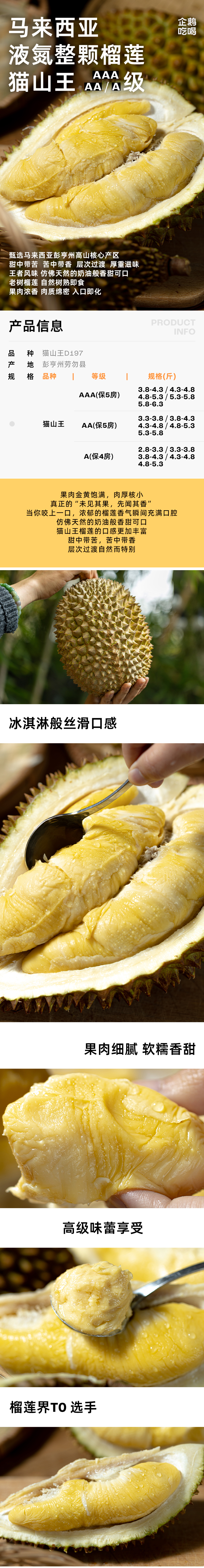 企鹅市集|马来西亚 猫山王榴莲 液氮冷冻整颗榴莲 浓郁香甜