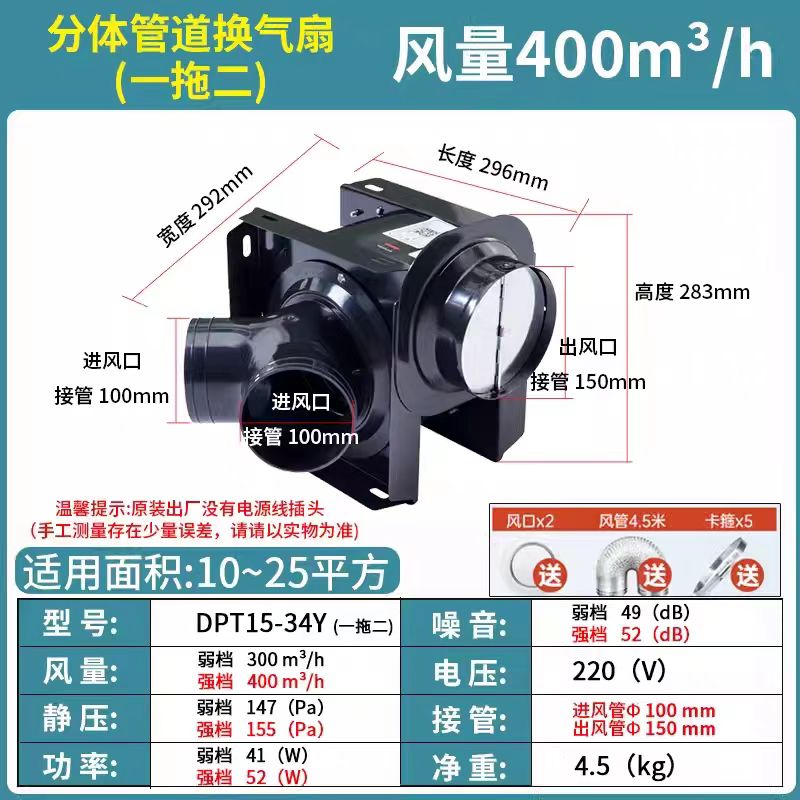 绿岛风DPT15-34Y(一拖二)全金属分体式管道换气扇2档300-400㎡ 10-20/20-25㎡适用 商品代码80049