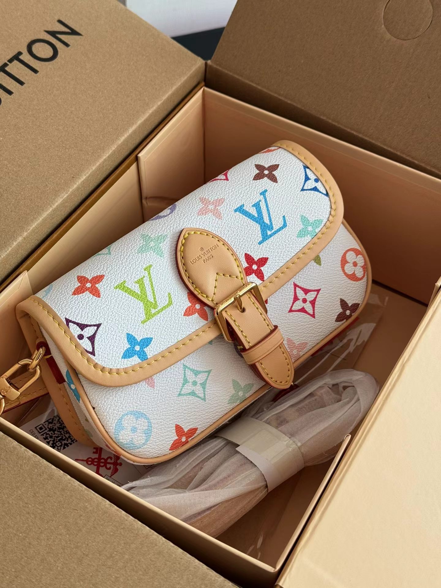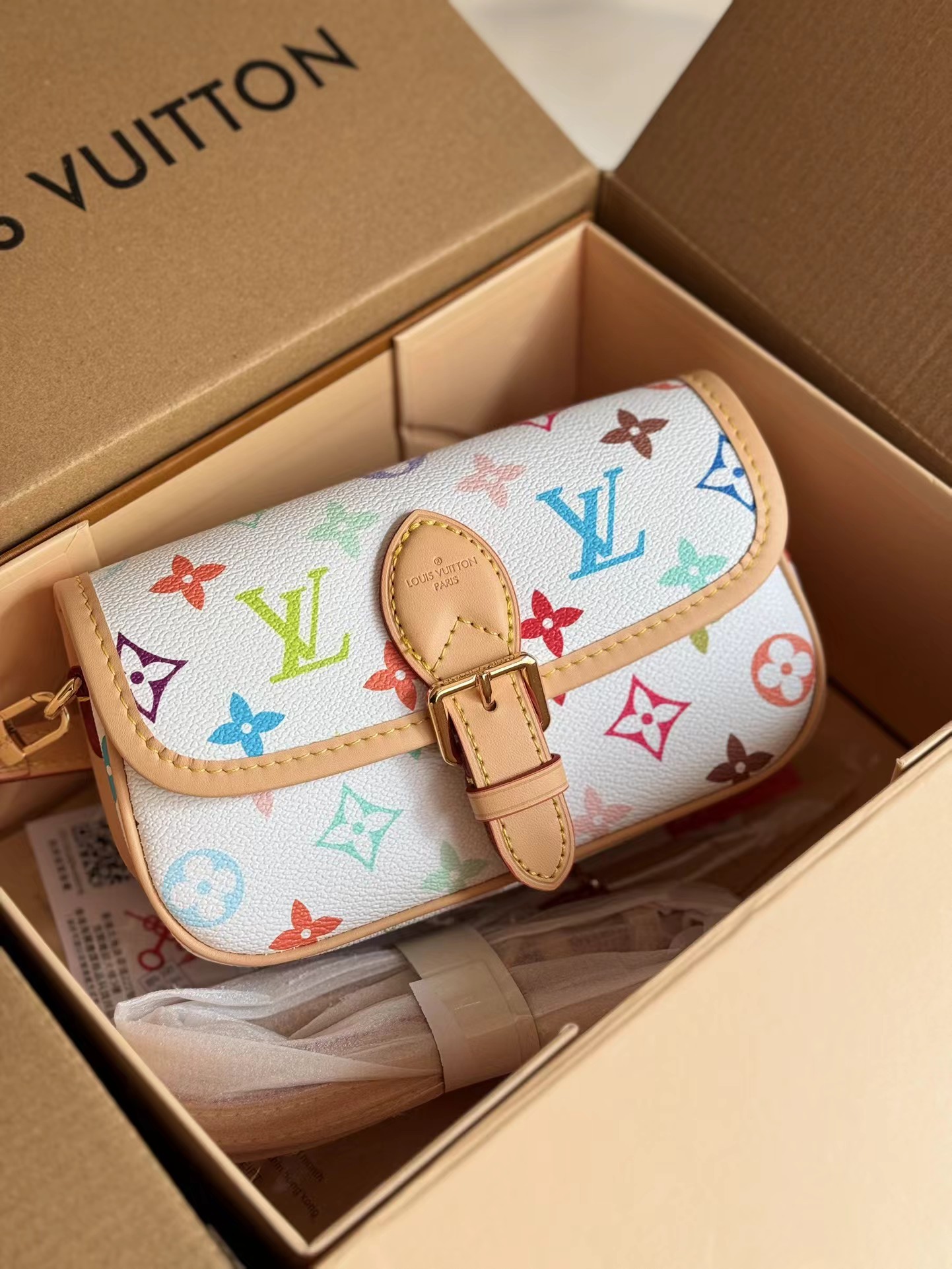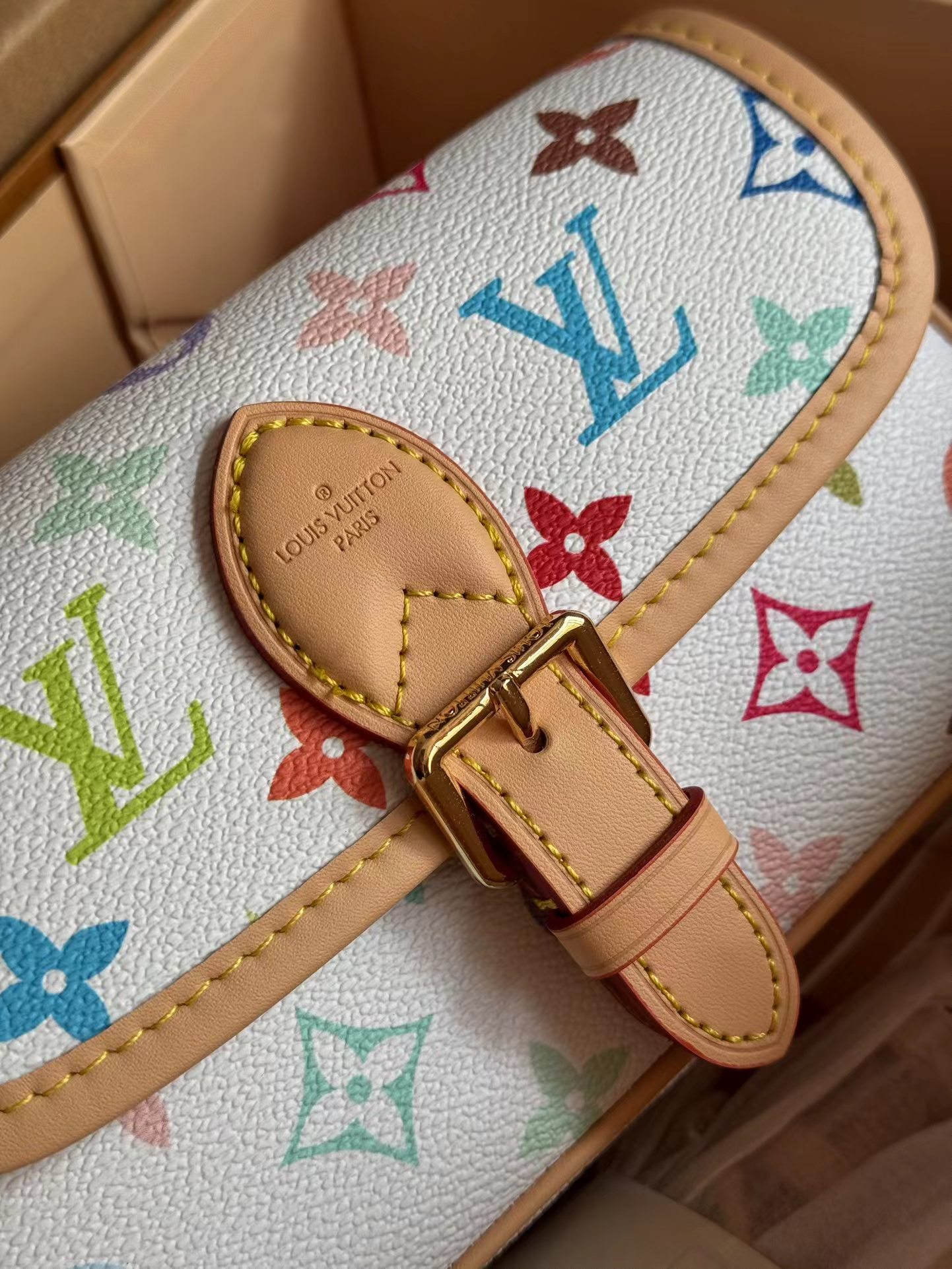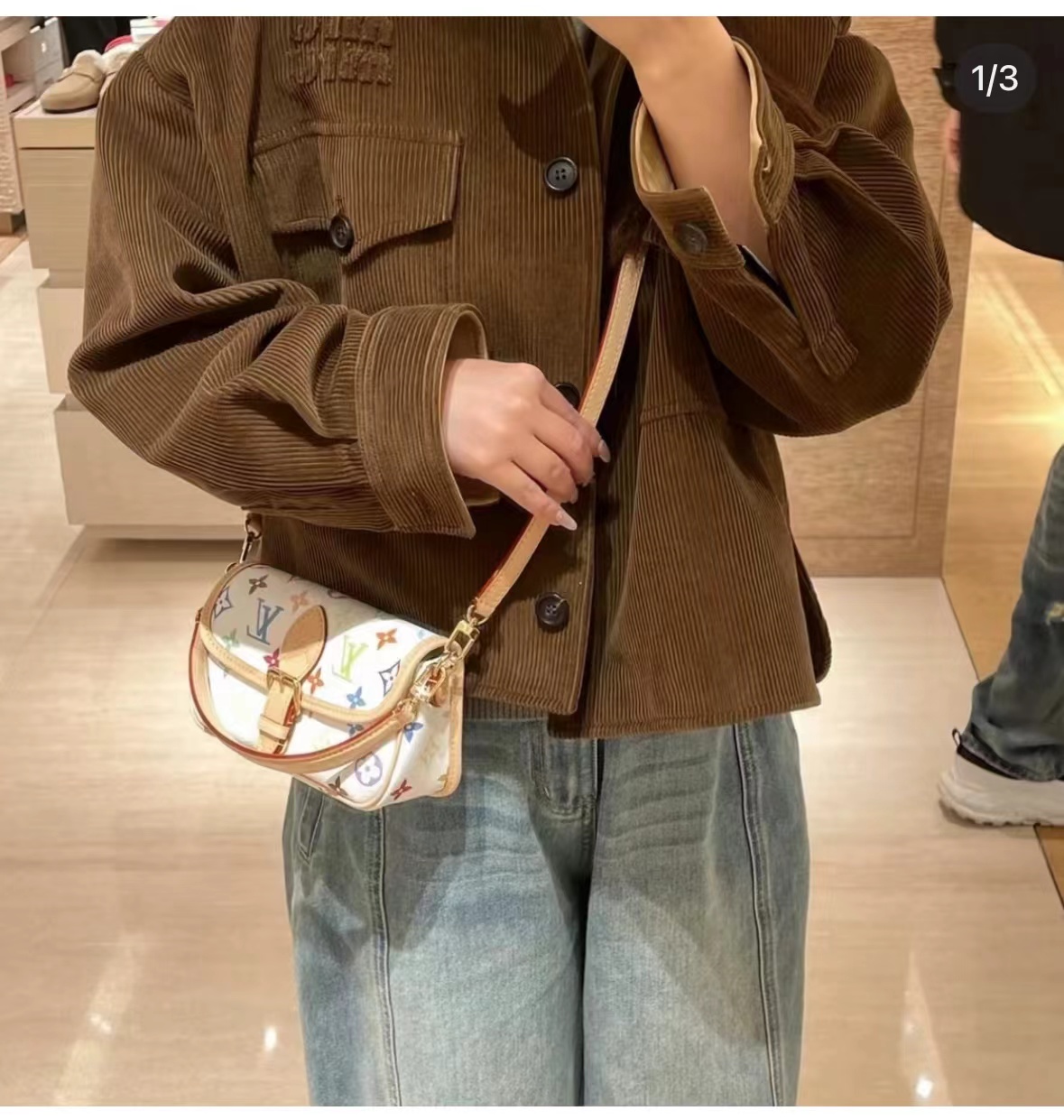 新款法棍小号出货啦 本款Nano Diane为Monogram帆布包身融入皮革包角和传统搭扣等复古元素,复现圆润翻盖和腰带式开合等原型细节。充裕空间可收纳手机和日常所需,可拆卸手柄和可拆卸并调节的肩带实现灵活背携,昼夜场合皆宜。