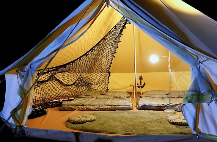 帐篷抗风防水,拥有窗户和纱帘,每顶帐篷内都拥有:空调、插线板、多用床头灯、2张1.5米榻 榻米(冬季更换成厚床垫+木床)、四件套、拖鞋、地毯、茶几、香氛瓶、蒲团、垃圾桶,以及各 不相同的有趣装饰。帐篷外底部拥有架高防腐木地台,门口有木地台、感应小夜灯、帐篷铭牌。