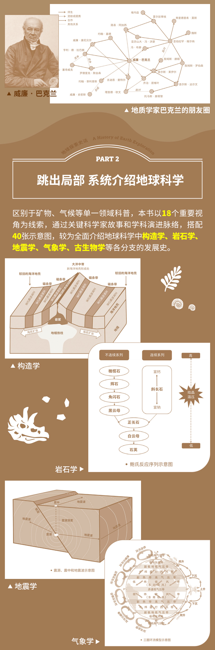 本书截取地球科学发展史的18个经典剖面,结合历史人文与传奇故事,以科学特写的形式,从不同角度展现了人类认识地球的精彩过程与动人细节,较全面地介绍了地球科学中构造学、岩石学、地震学、气象学、古生物学等各分支的发展史。