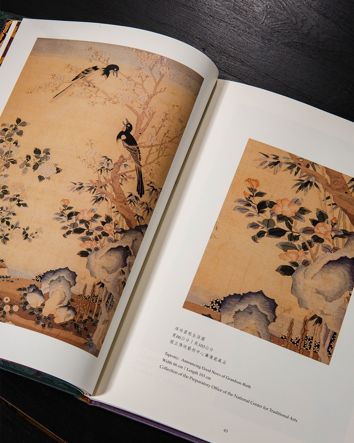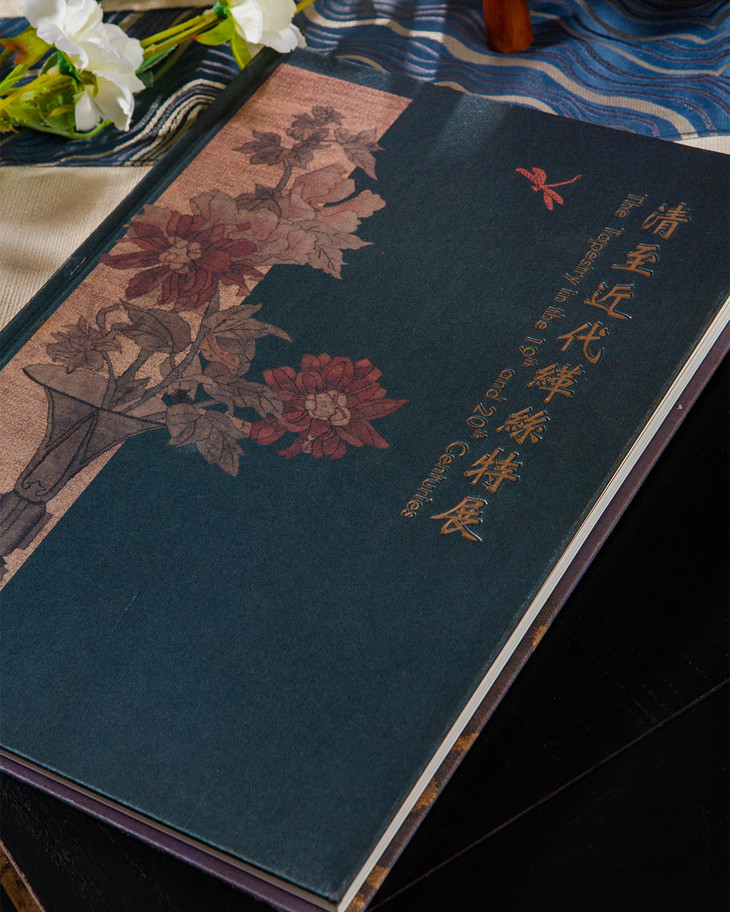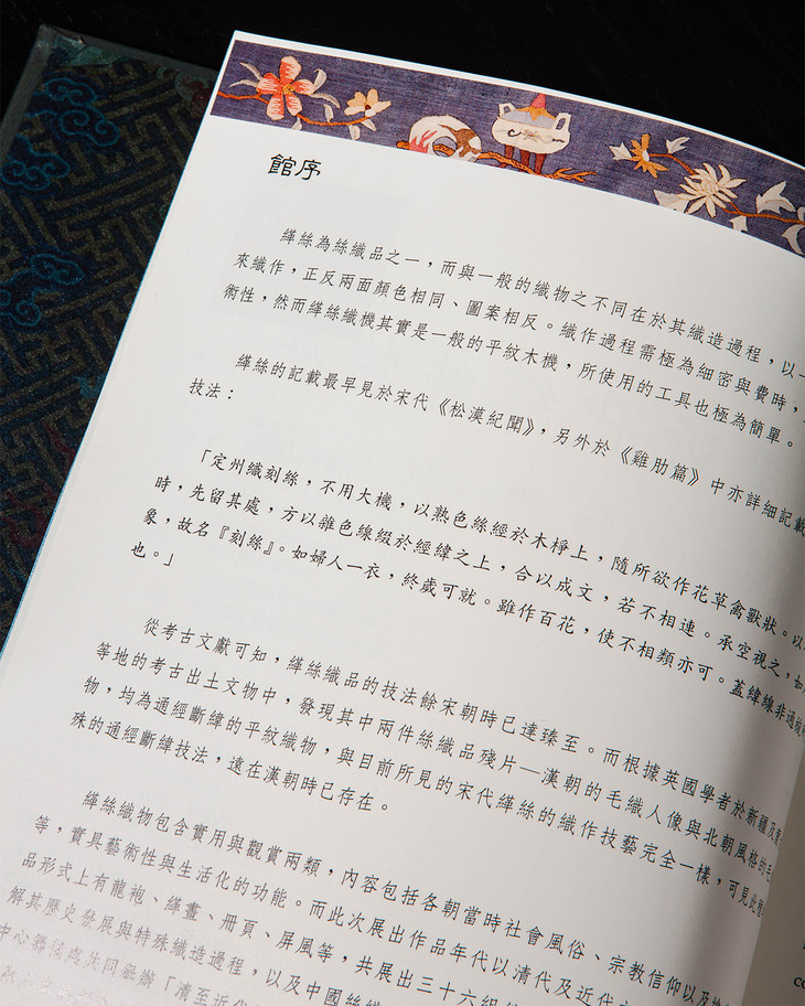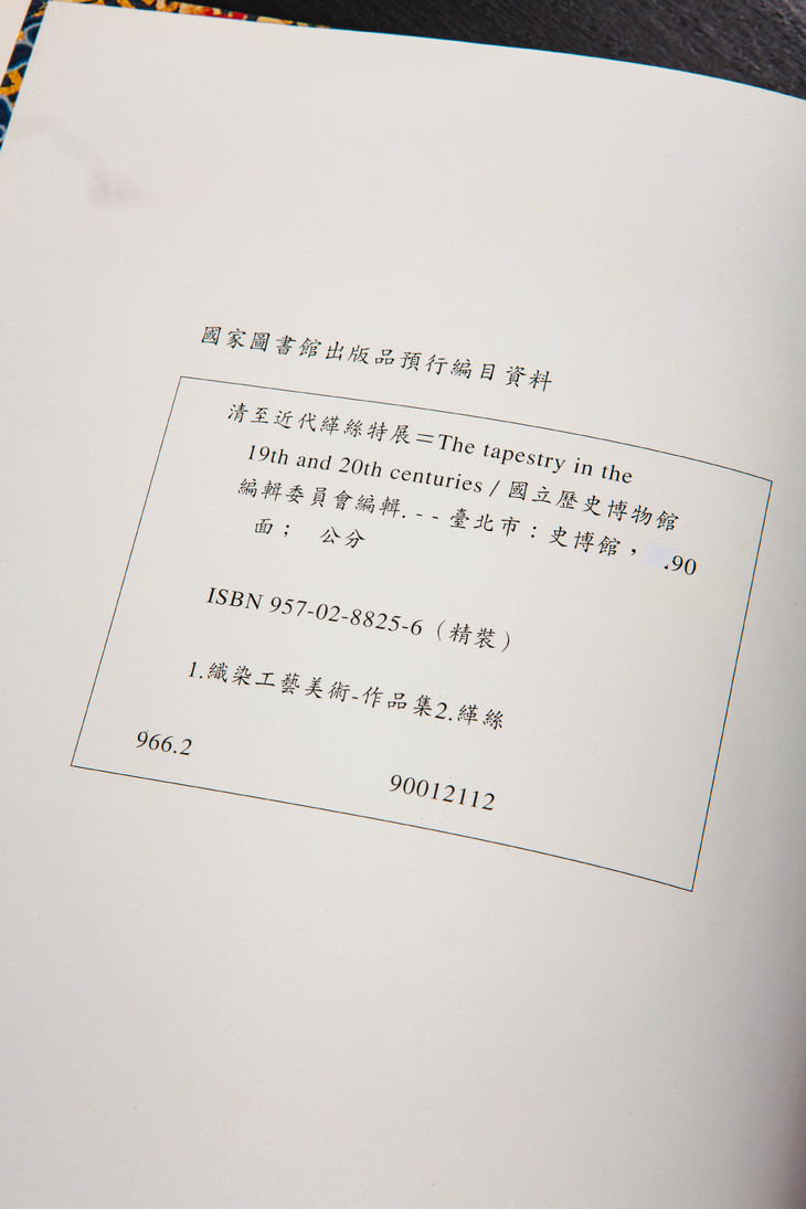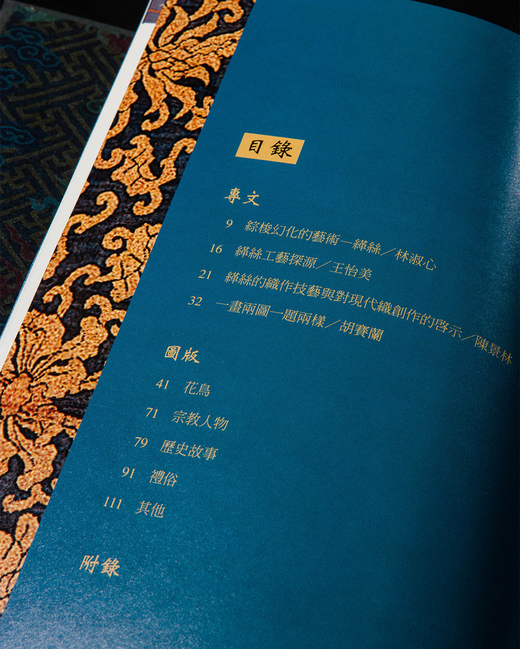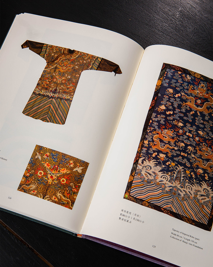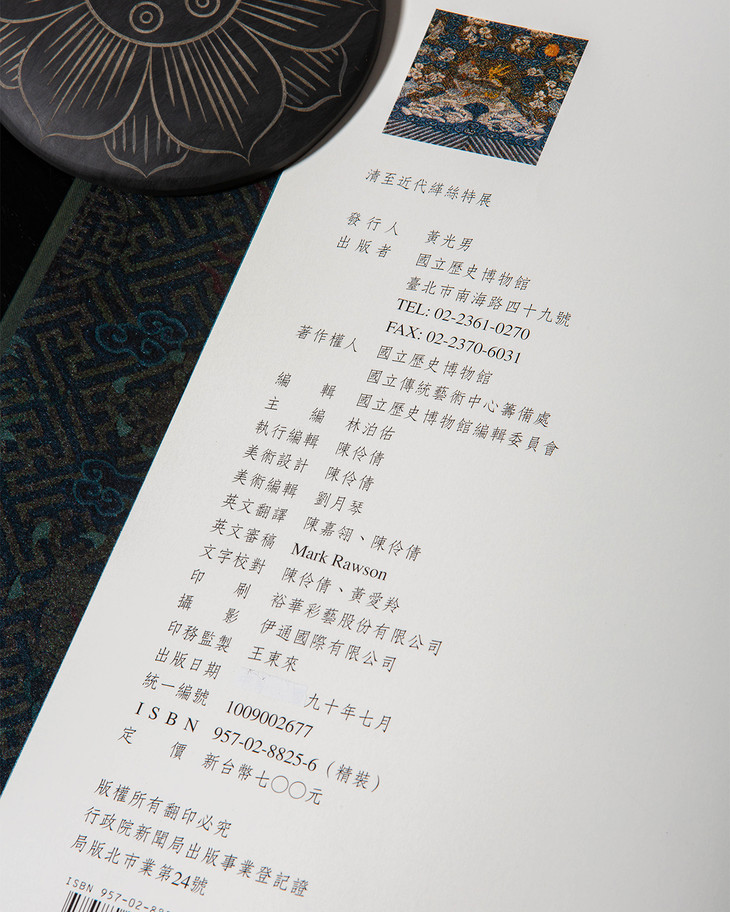 《清至近代緙絲特展》展刊。展出19-20世纪包括龙袍、缂画、册页、屏风等36组/件展品。