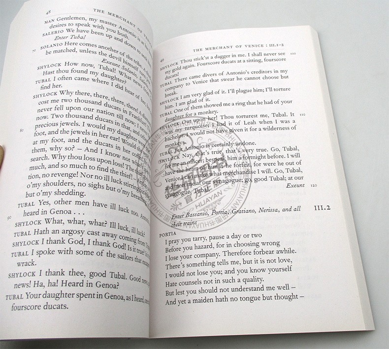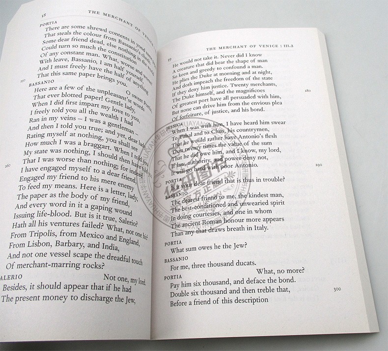 本书讲述了一个关于仁爱、友情和爱情的故事。威尼斯富商安东尼奥为了帮助好友巴萨尼奥完婚,向犹太人夏洛克借高利贷。但由于安东尼奥贷款从不要利息,还常常指责夏洛克,夏洛克对安东尼奥一直怀恨在心。为了报复安东尼奥,夏洛克在借钱给他时佯装也不要利息,但若逾期不还,就要从安东尼奥身上割下一磅肉。不巧安东尼奥的商船失事,贷款无力偿还。夏洛克去法庭控告,要求安东尼奥根据法律条文履行诺言。为救安东尼奥的性命,巴萨尼奥的未婚妻鲍西娅假扮律师出庭,要求在处罚时所割的一磅肉必须正好是一磅肉,不能多也不能少,更不准流血。如果流了血,根据威尼斯法律,谋害一个基督徒(公民)是要没收财产的。夏洛克因无法恰好割一磅肉而败诉,害人不成反失去了财产。