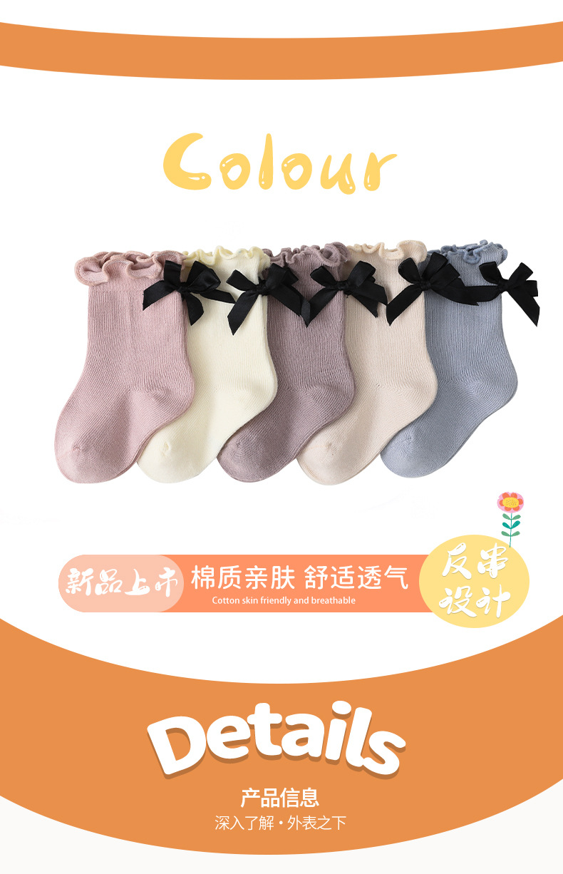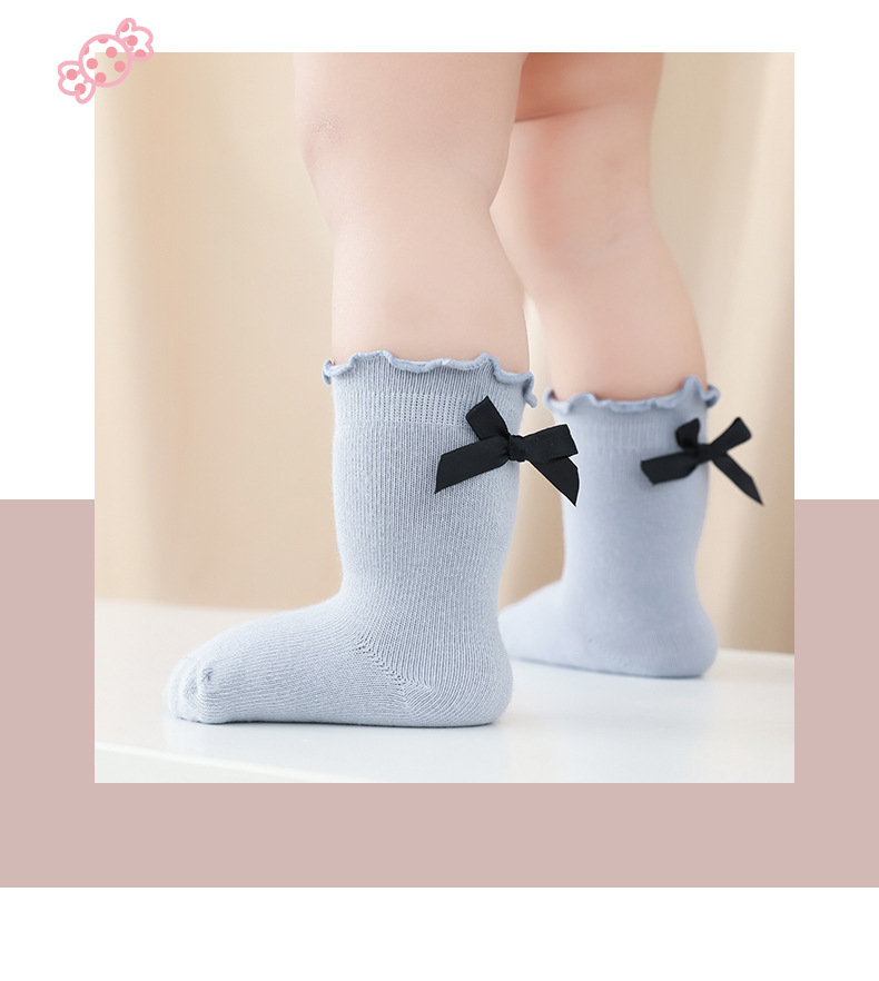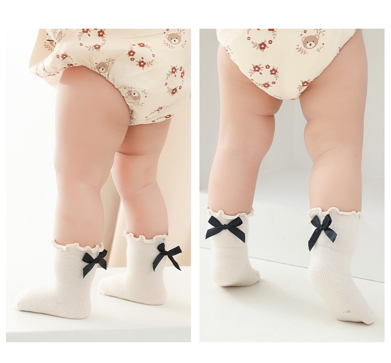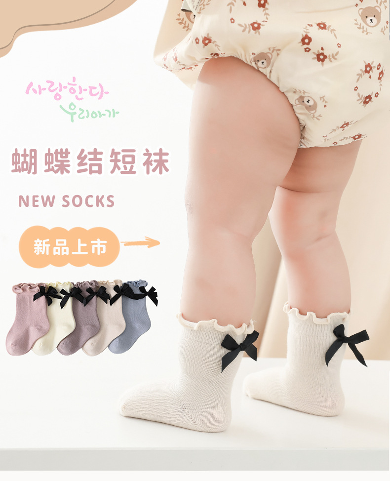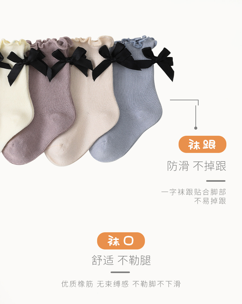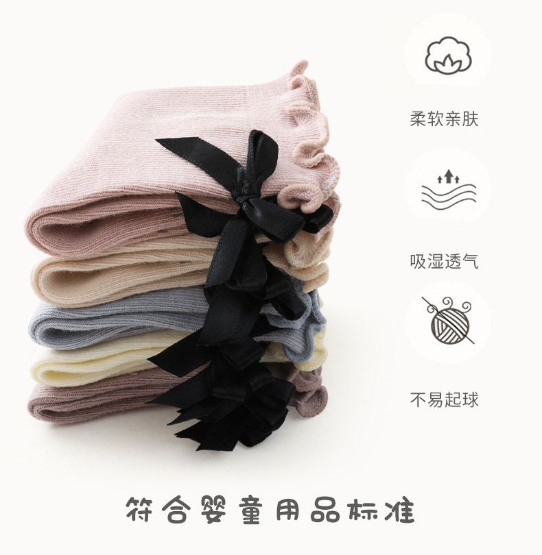 【3双装 舒适绵柔】A类婴儿袜子秋冬新款蝴蝶结宝宝中筒袜 韩版木耳边新生儿松口中筒袜