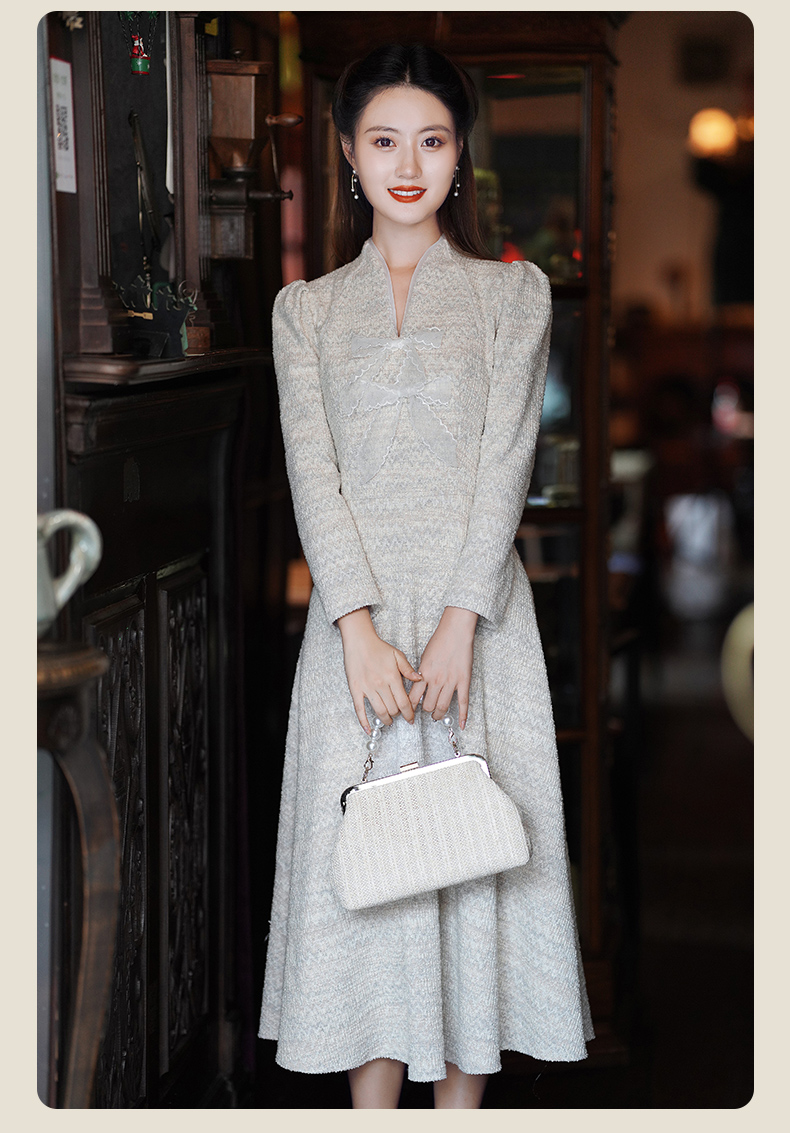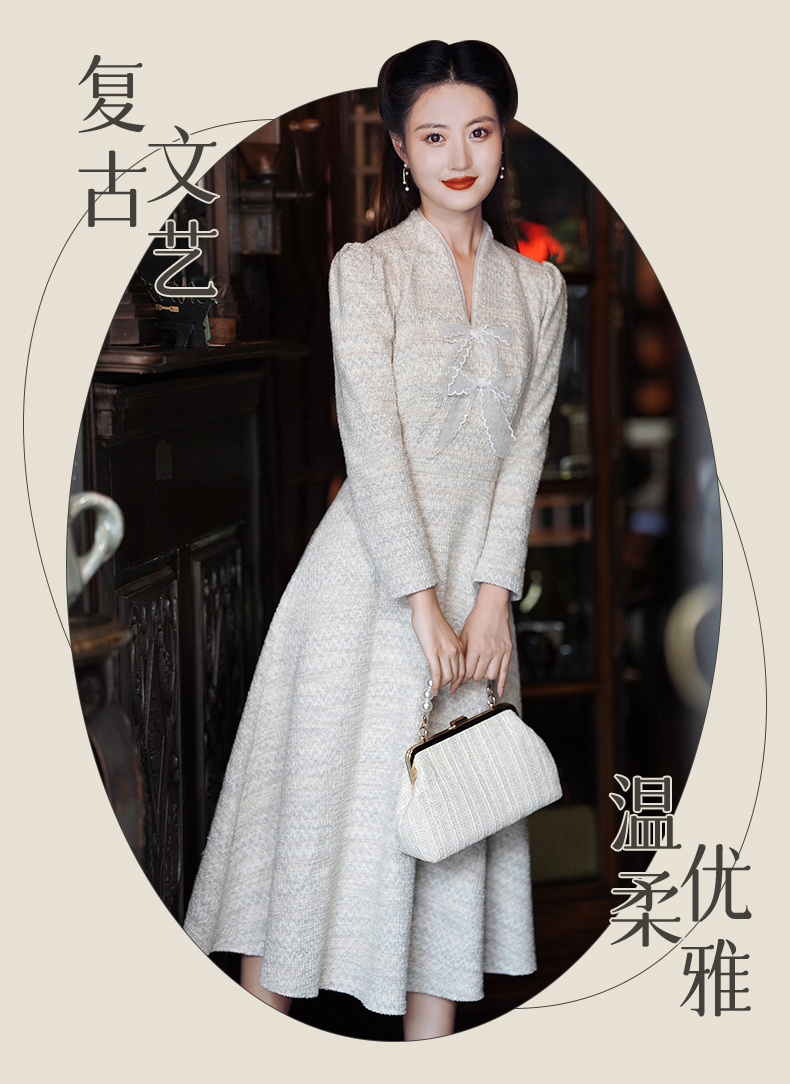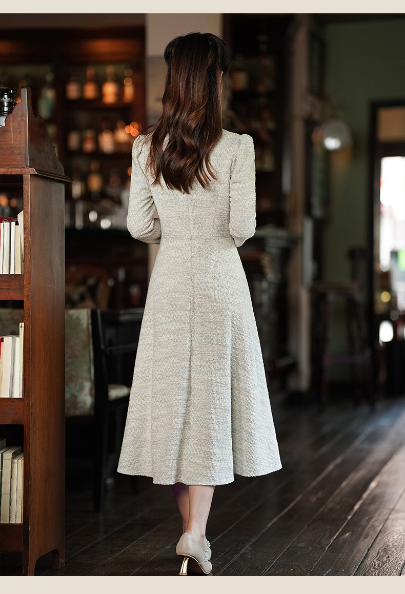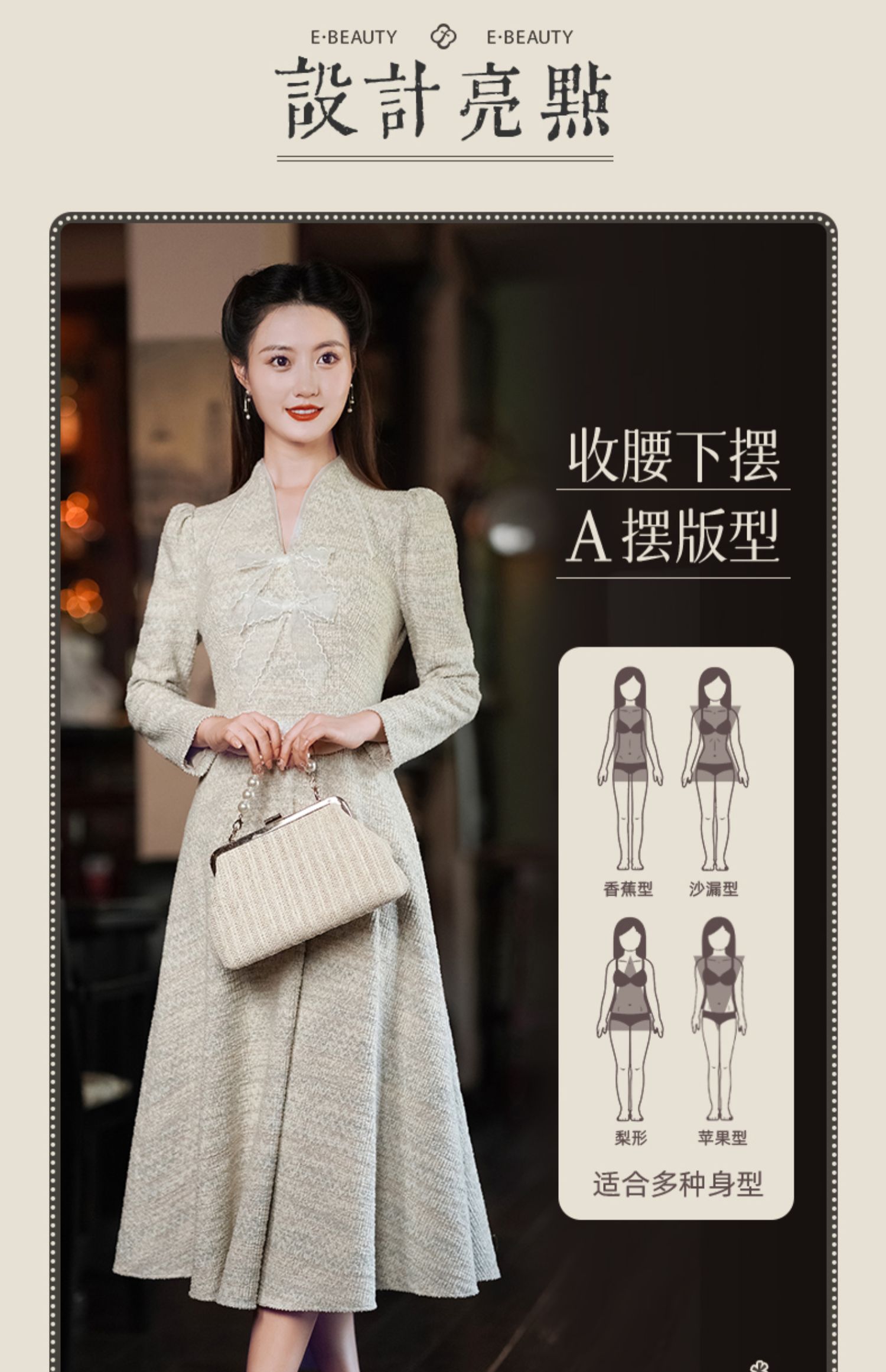 逸红颜白秀珠2025冬季新款仿花呢弹力针织连衣裙女九分袖法式气质