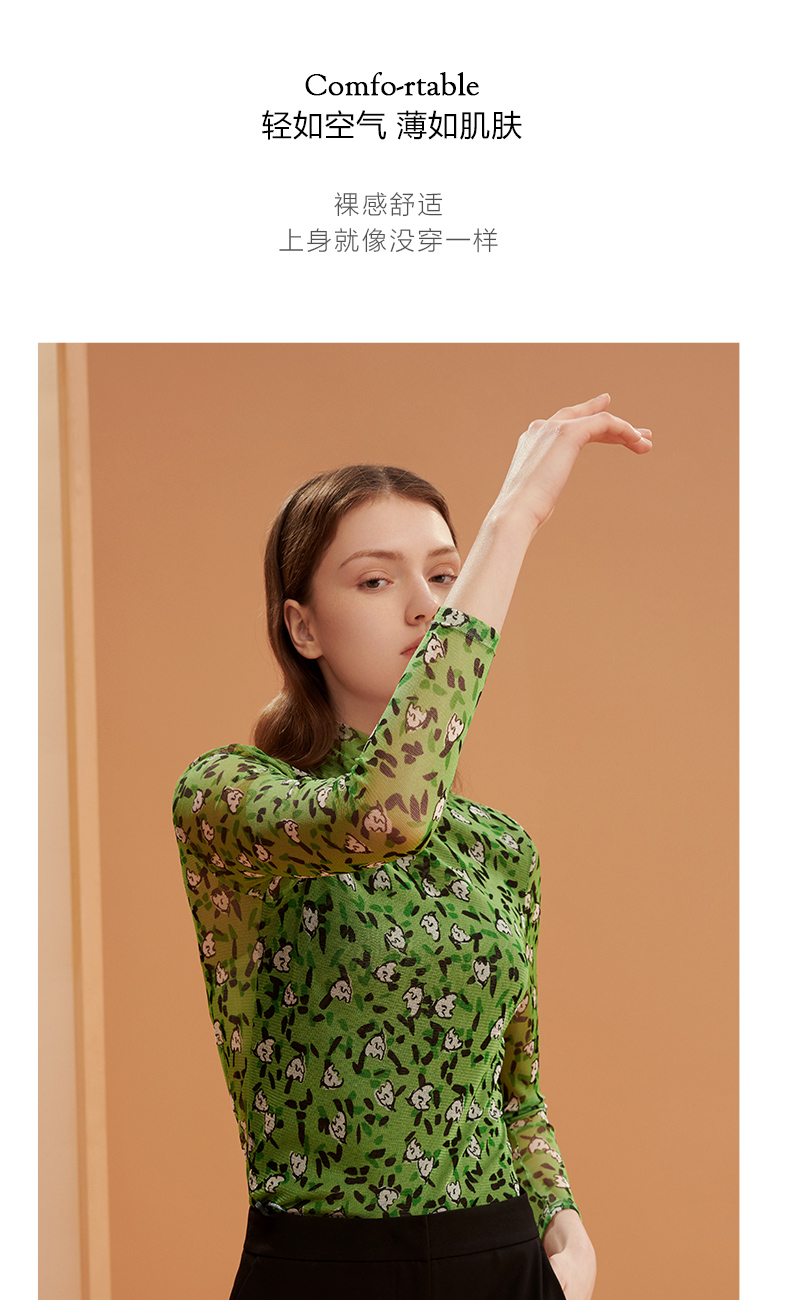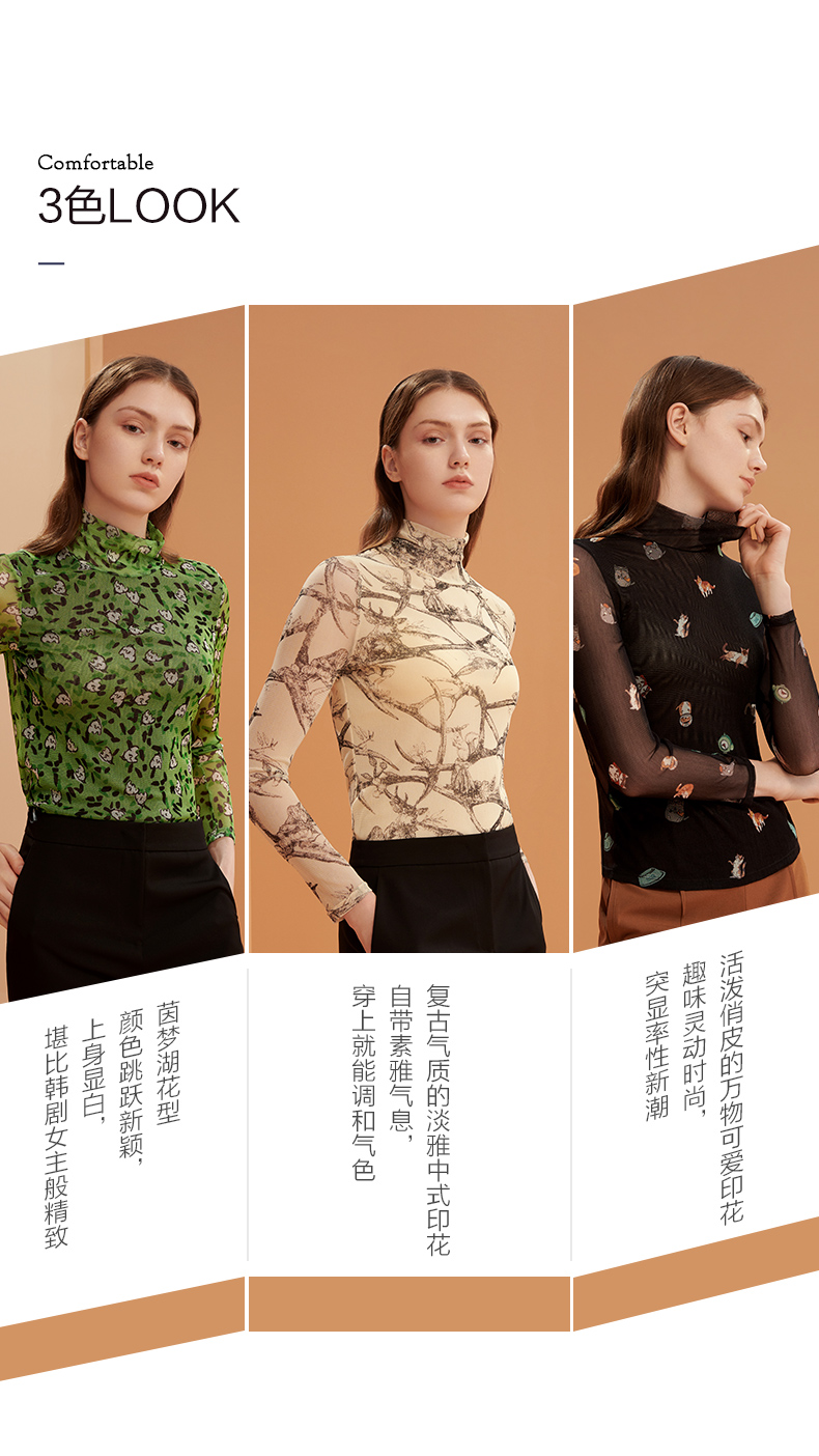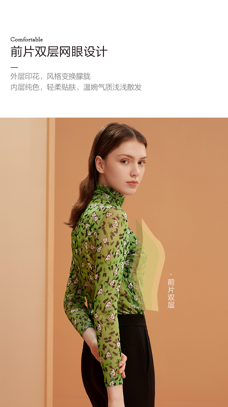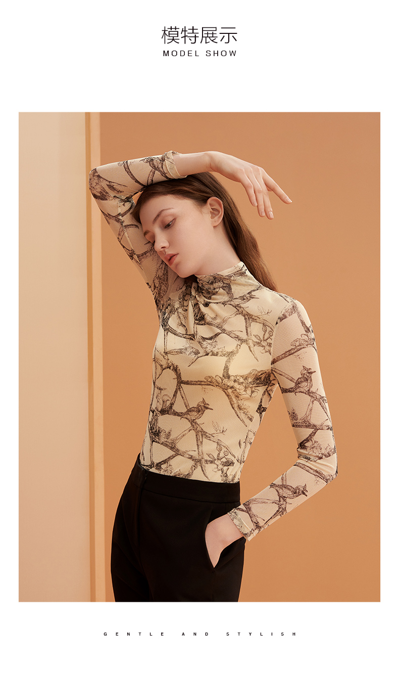 金三塔[裸感舒适] 真丝高领网眼印花打底上衣女桑蚕丝保暖打底衫 NZFBC721