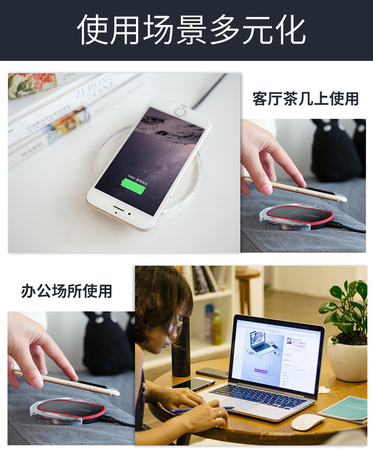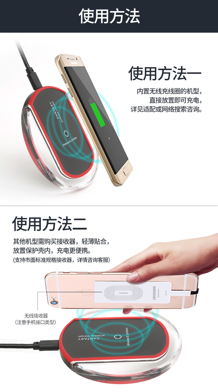 注意:不支持无线充电的手机请另外购买对应接收器配合使用(接收器单拍不发,请见谅)。