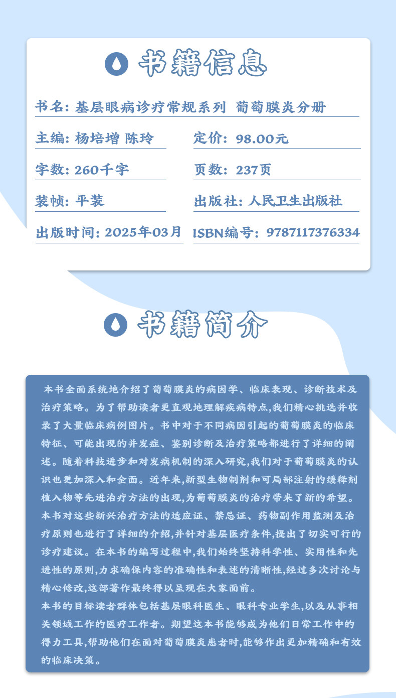 本套丛书以眼科三级学科分册,内容涵盖眼科常见病、多发病的诊疗常规,并对常用技术操作和适合地市级医院、县级医院开展的手术进行介绍,理论与操作相结合,突出实用性、规范性、可操作性。包括12分册:晶状体病,眼外伤,青光眼,结膜及角膜,玻璃体视网膜疾病,全身疾病与眼病,屈光不正及其矫正,眼睑、泪器、眼眶及眼肿瘤,斜弱视,护理,葡萄膜炎,神经眼科。计划每册10~20万字左右,配彩图。