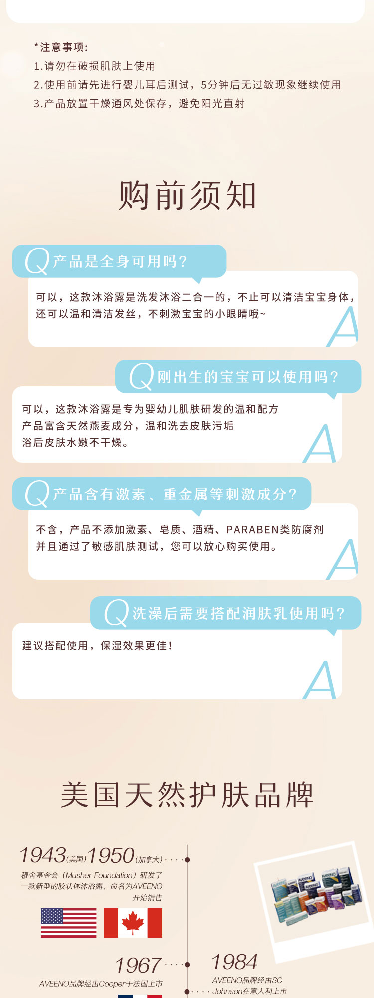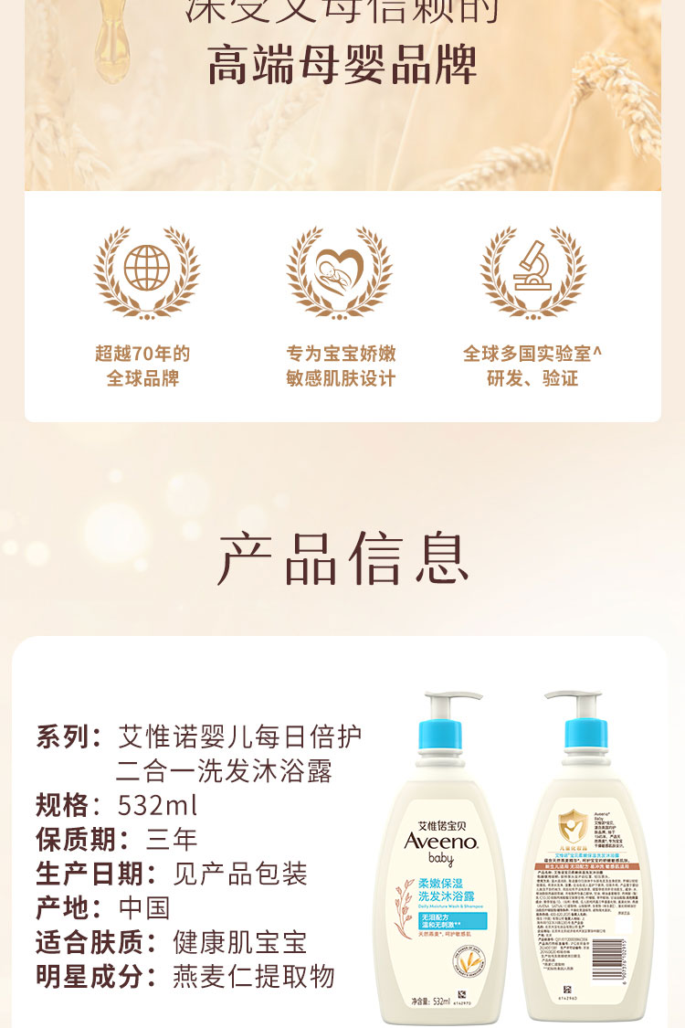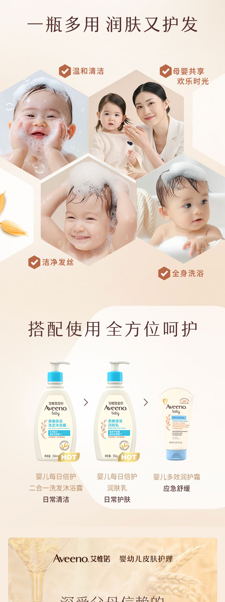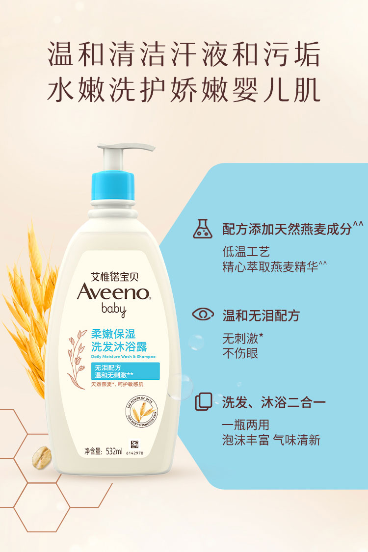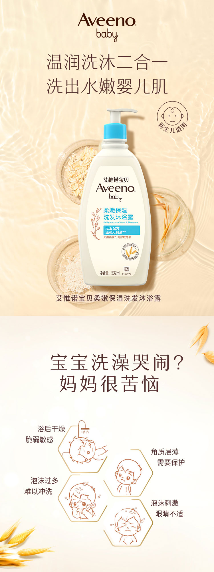 【1:1送水凝保湿霜10g】Aveeno艾惟诺宝贝柔嫩保湿洗发沐浴露二合一532ml