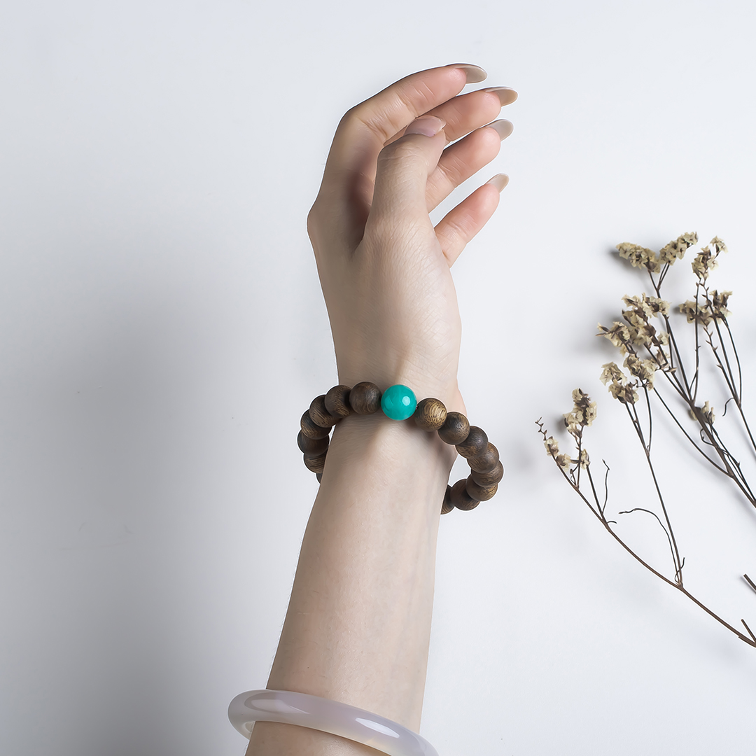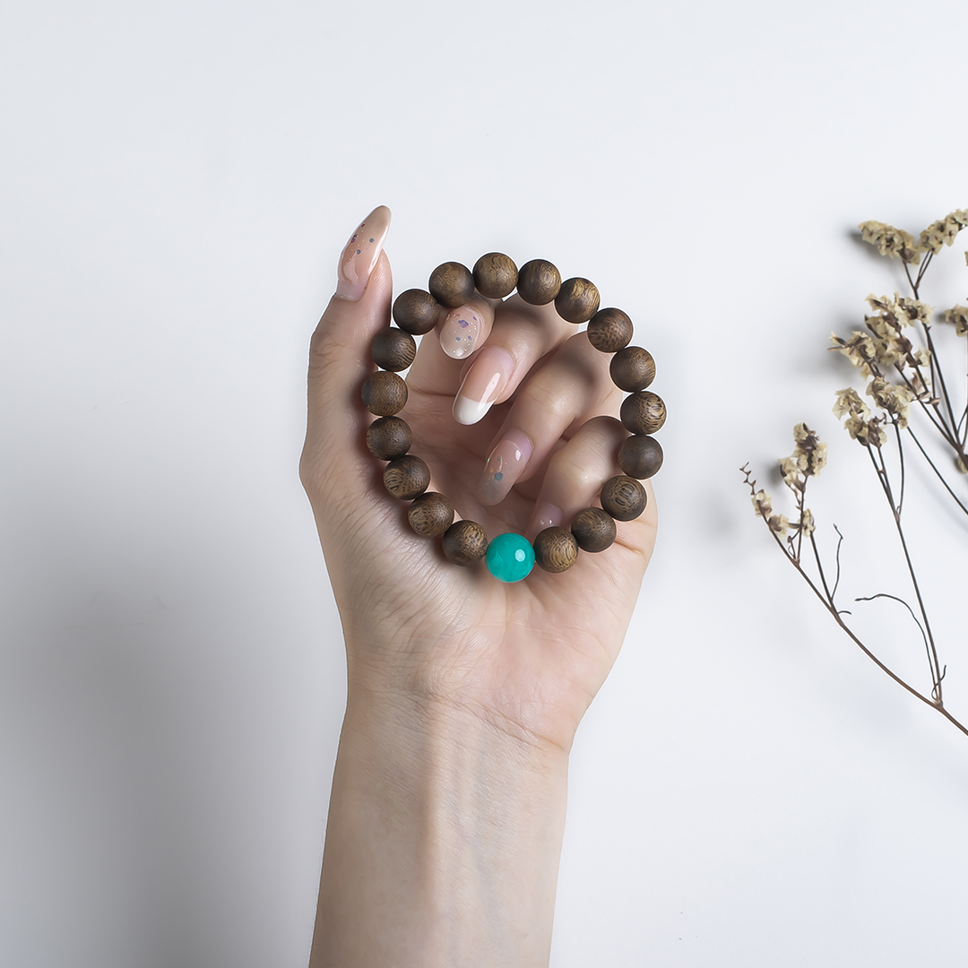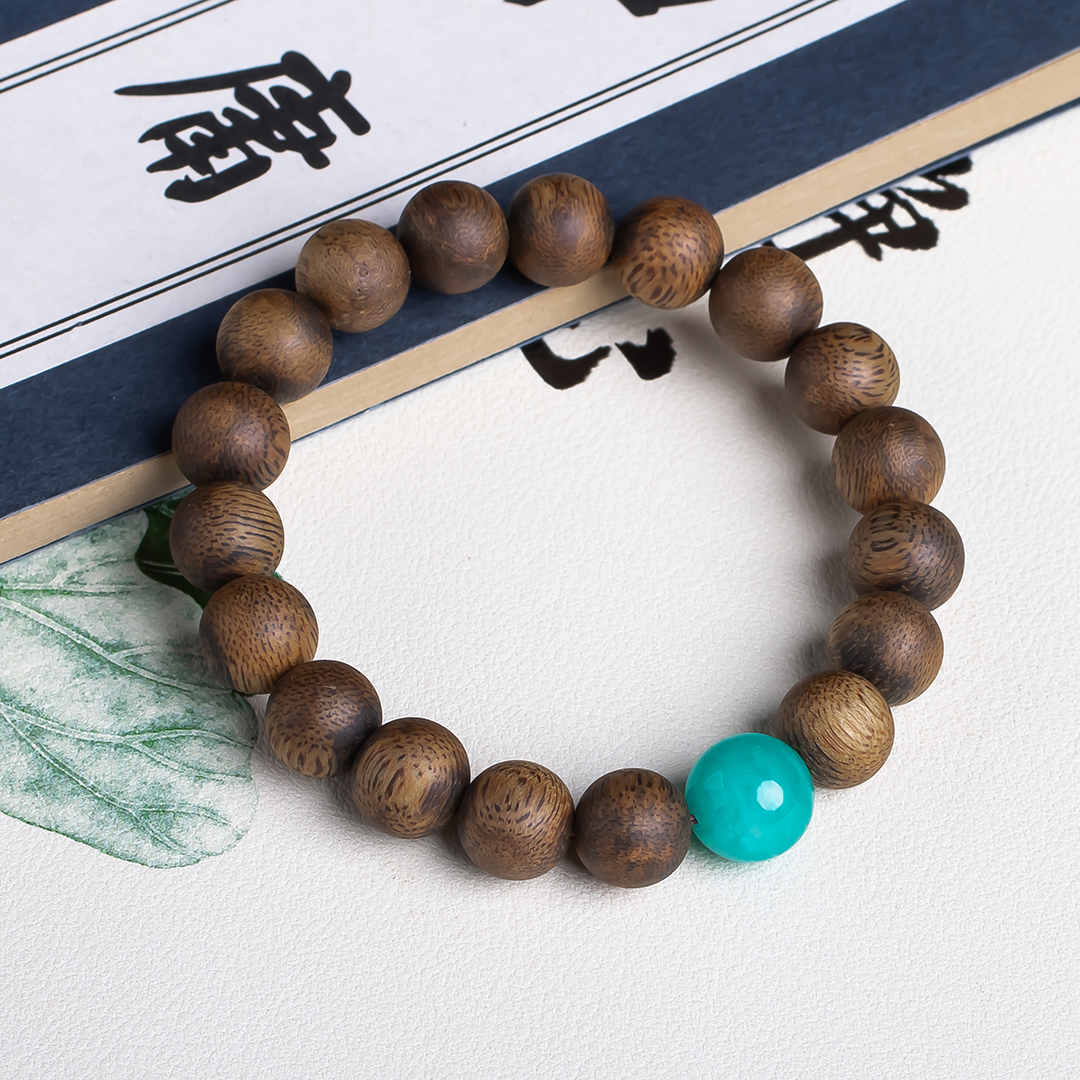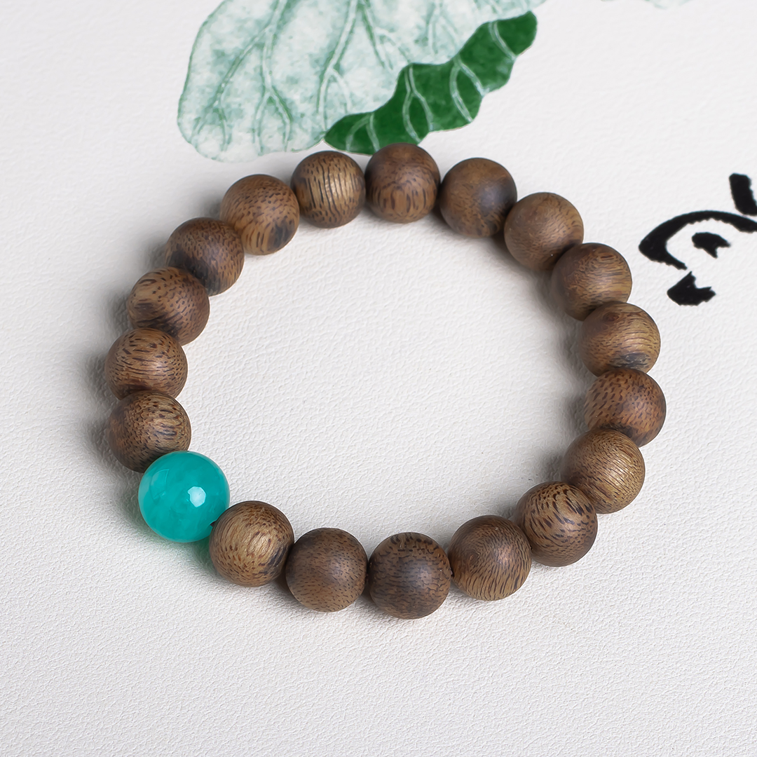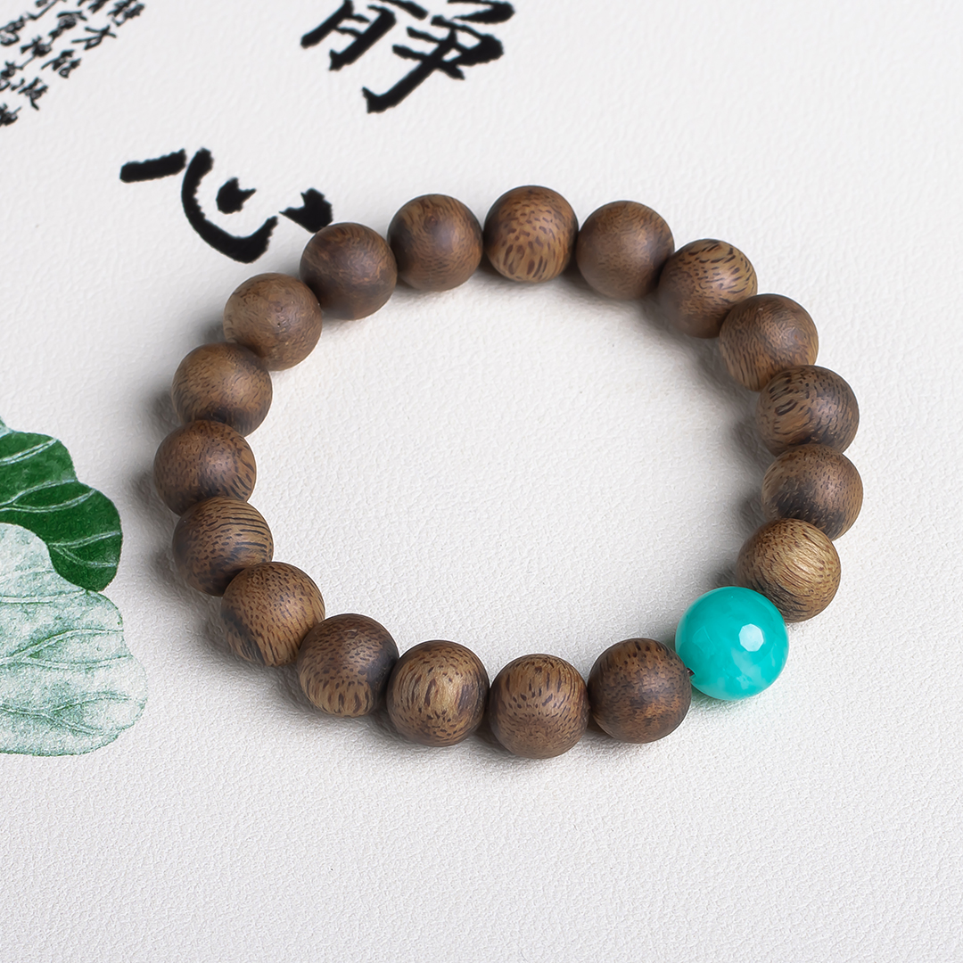 xy0569沉香+天河石单圈手串,天然沉香约10.3mm,原色原味,香味自然清甜,款式简约百搭,一颗满色天河石非常亮眼,具有提升信心、助力去除消极情绪的作用。上手大方,静心养神、减压。