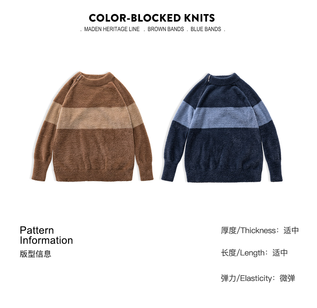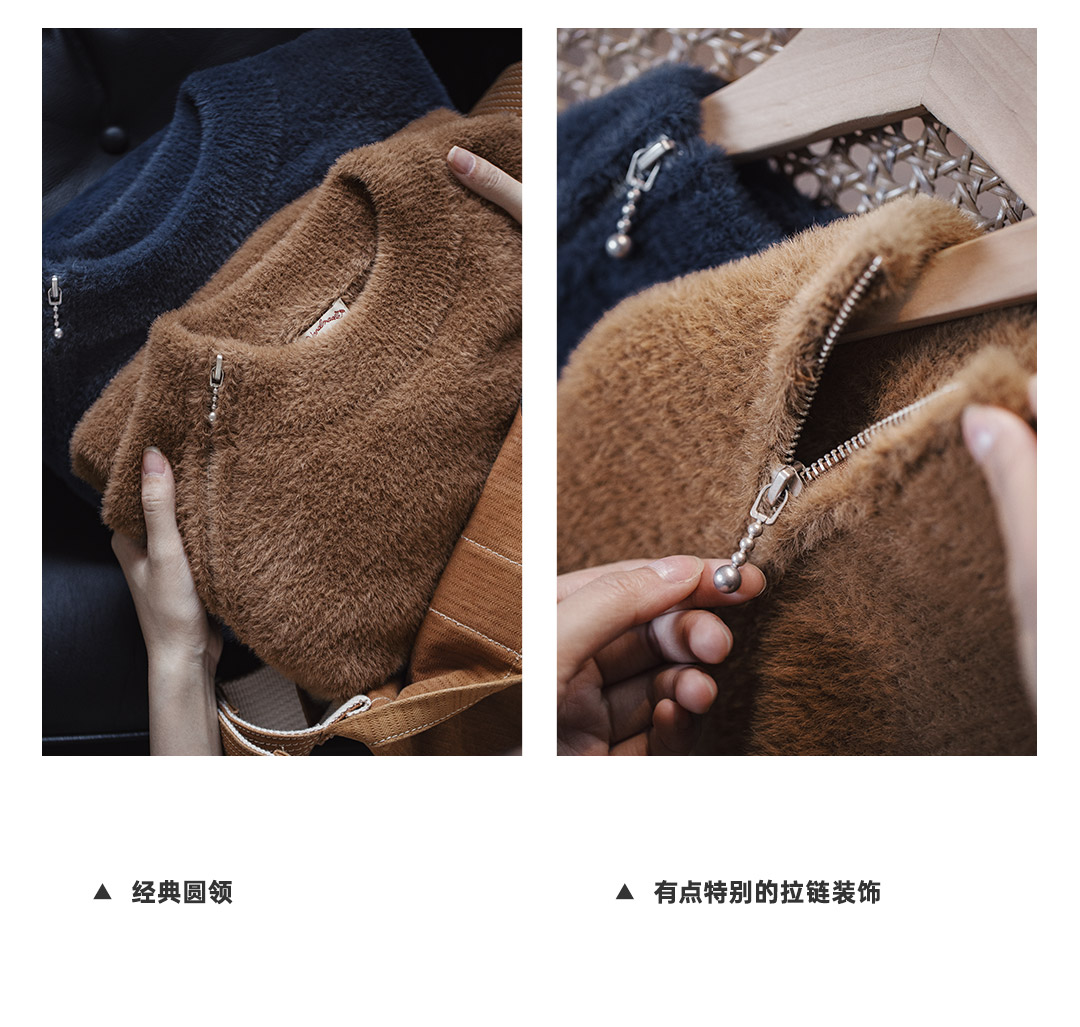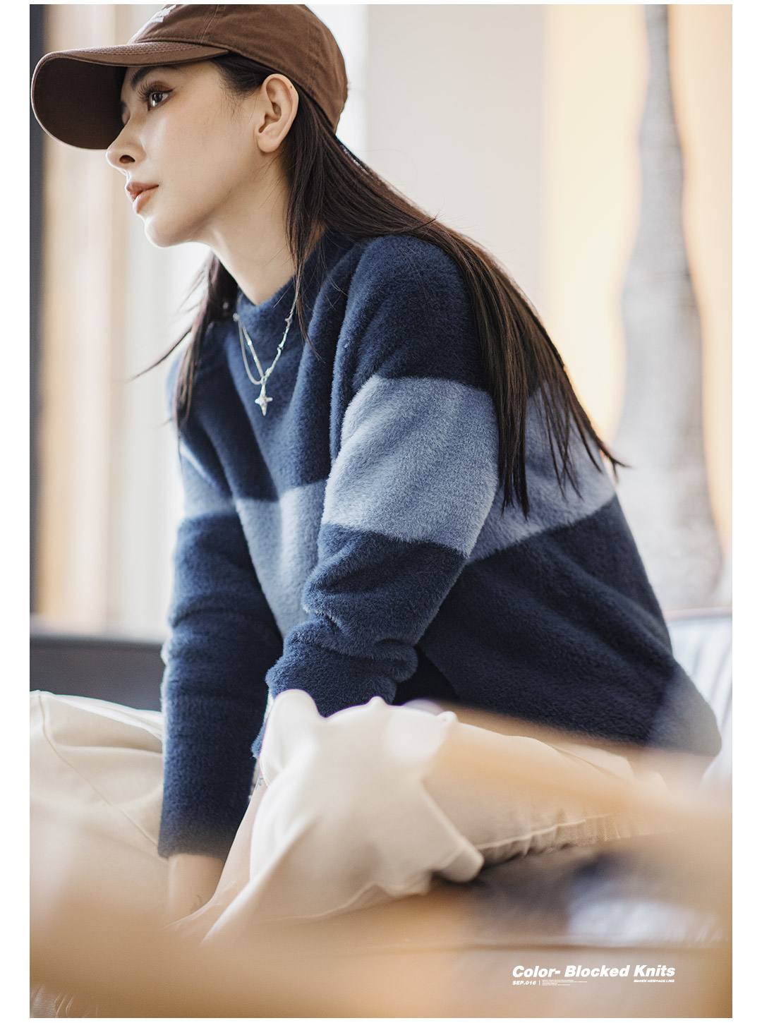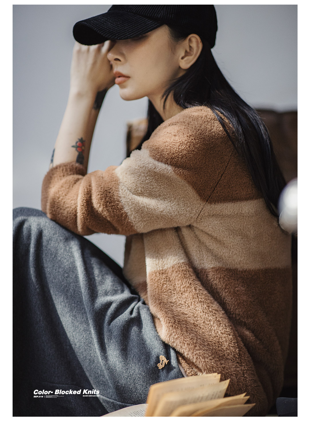 马登美式拼色仿水貂绒毛衣宽松慵懒毛茸茸针织衫套头圆领上衣冬女