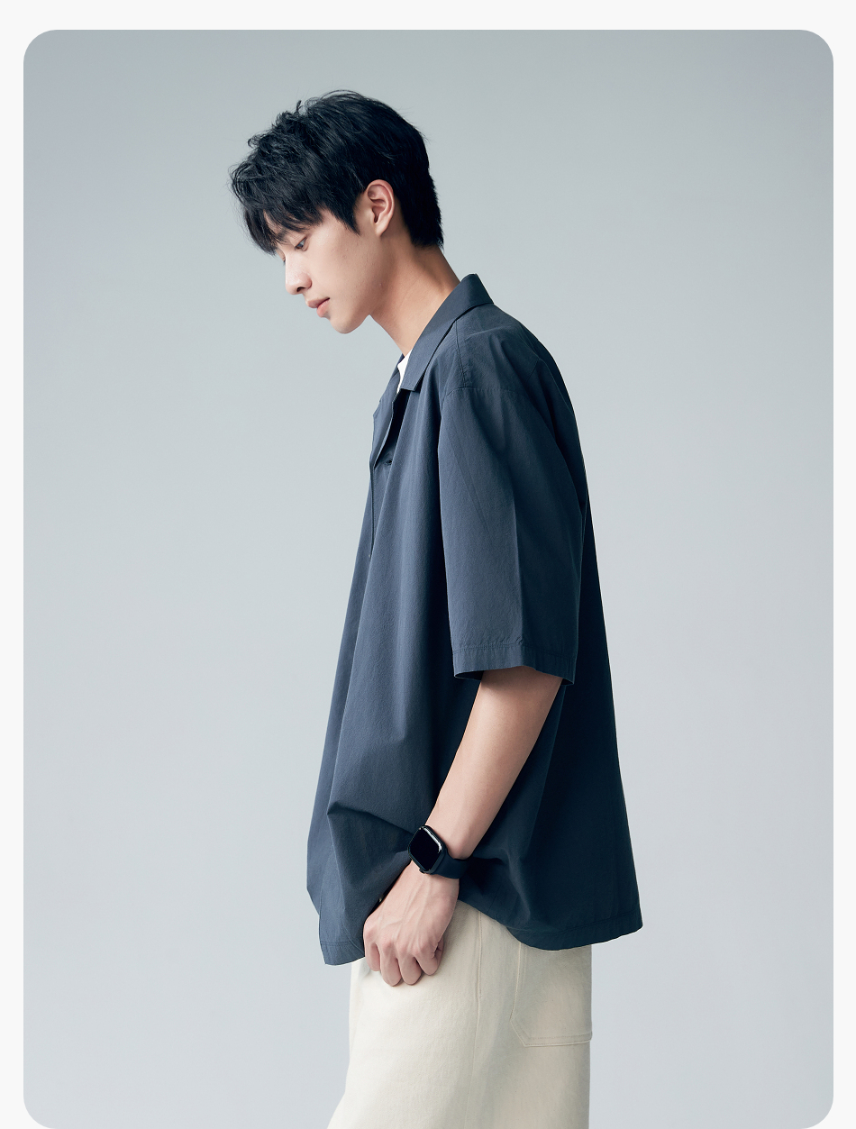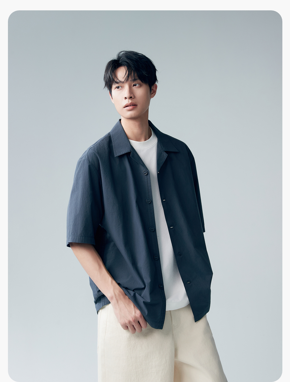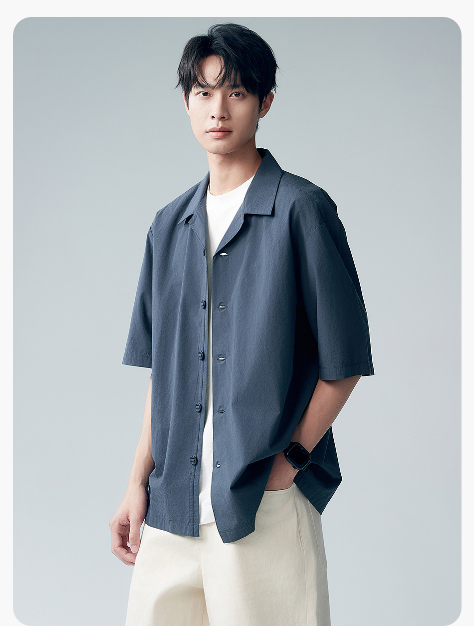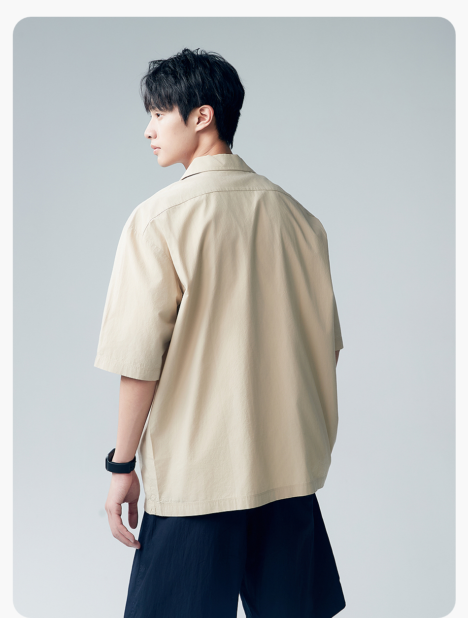 棉仓353804007-宽松落肩全棉盐缩古巴领短袖衬衫