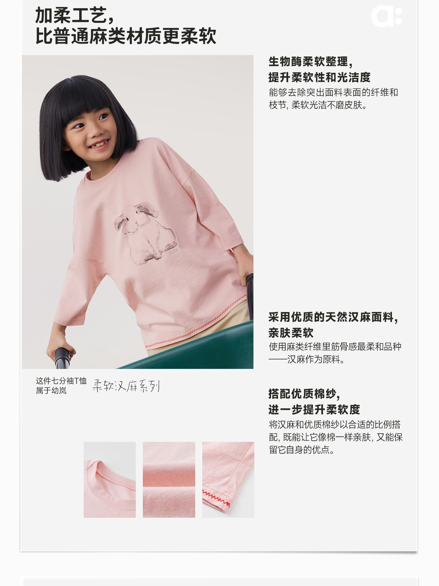 【春季特惠】幼岚「柔软汉麻」贴身亲肤透气七分袖T恤24春季新款儿童男女童T恤ZY