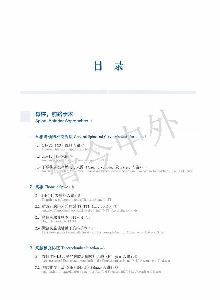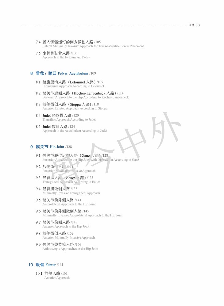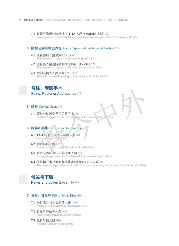新版沿承了第1 版的编写风格,内容包括四个部分,按照人体的部位逐步展开,包括脊柱(前路和后路)、骨盆与下肢、肩部与上肢,基本涵盖了临床上常用的各个部位手术入路。对每一种入路的介绍包括主要适应证、患者准备、体位、麻醉和切口、显露、切口闭合。其中重点部分为“显露”,以大量绘制精美、解剖层次清晰细致的线条图,结合精练的文字说明,将手术显露的过程一步步清晰地展现给读者。