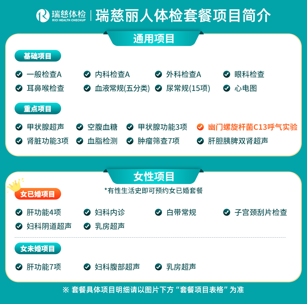| 子宫颈刮片检查、乳房超声检查、妇科B超、C13呼气实验、多肿瘤标志物联合检7项、甲状腺功能、血脂二项 |