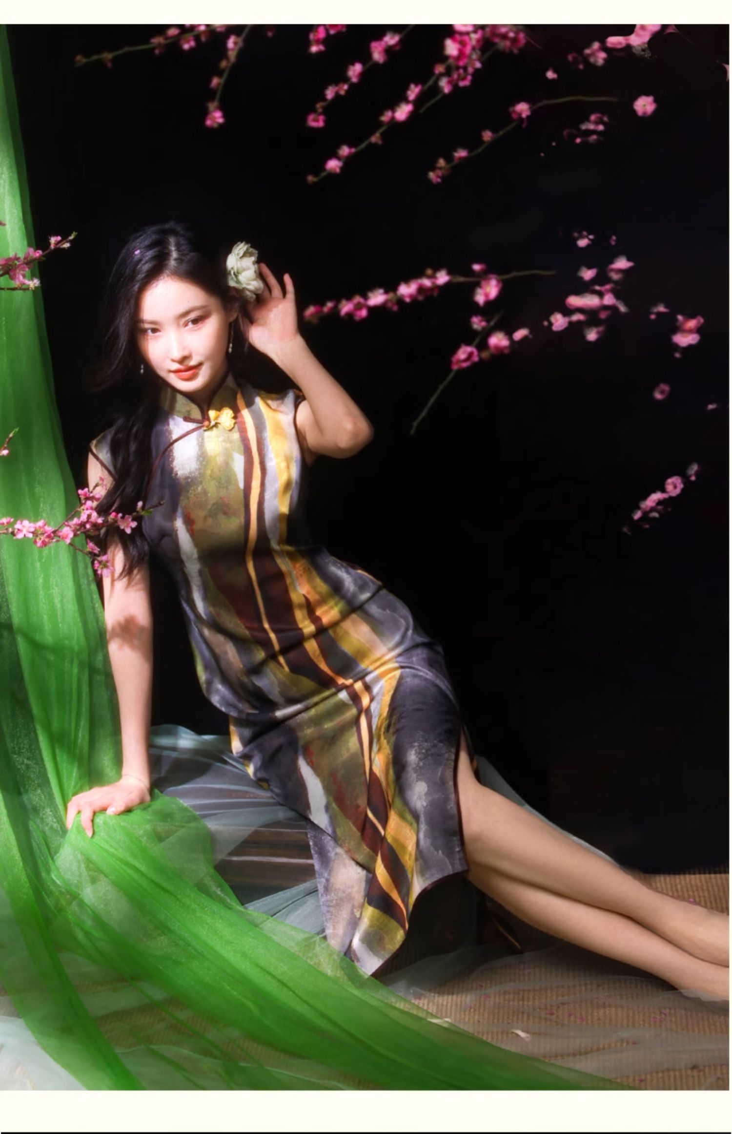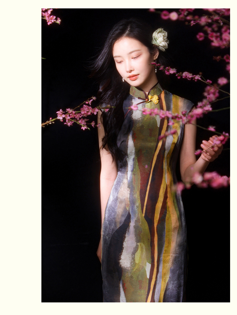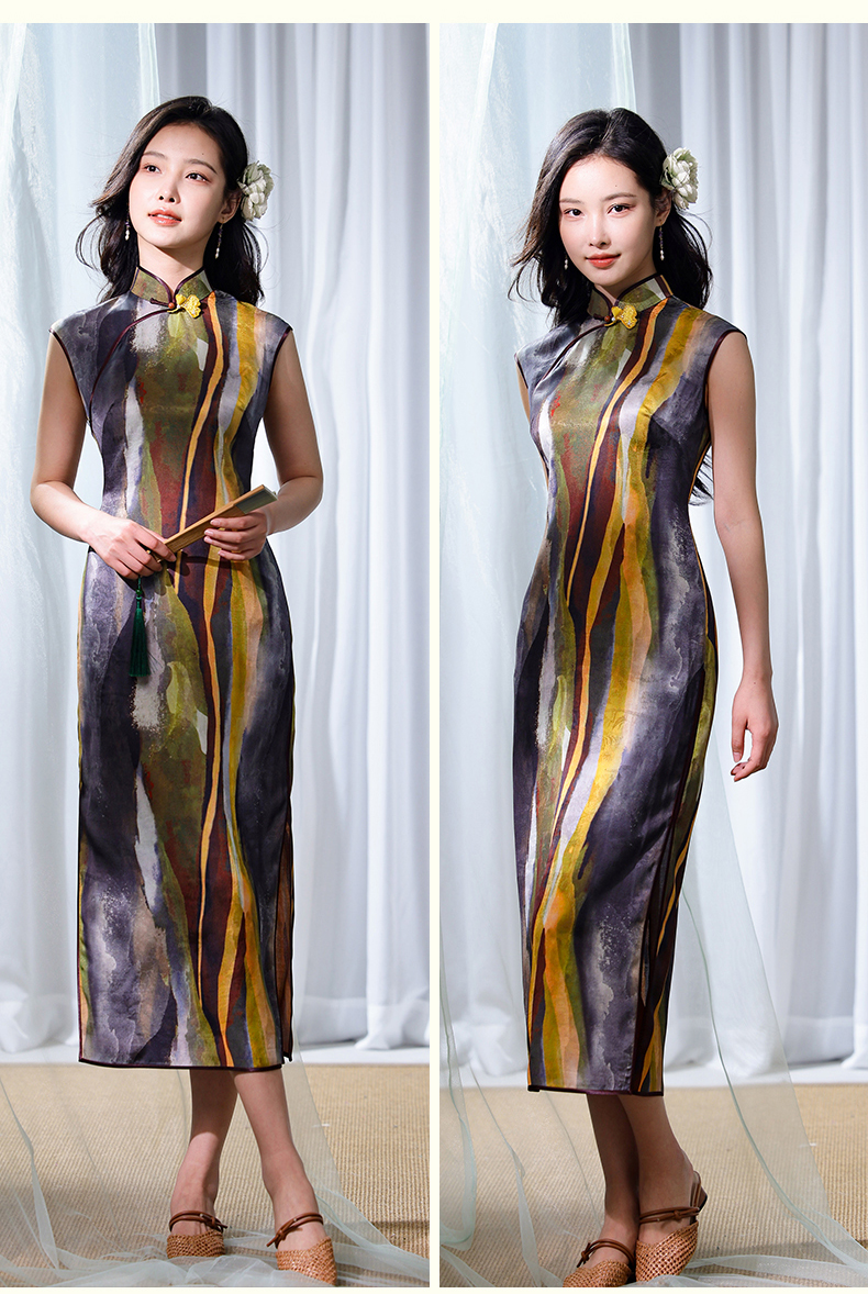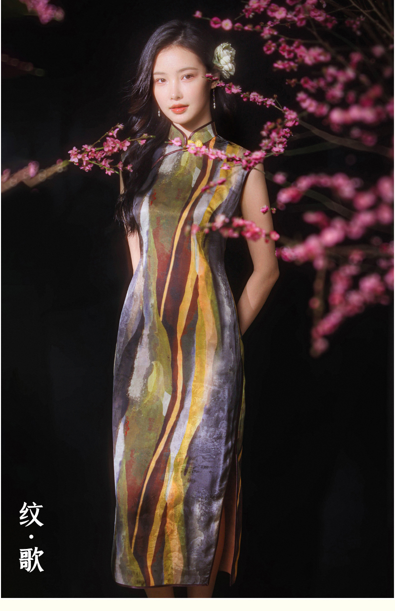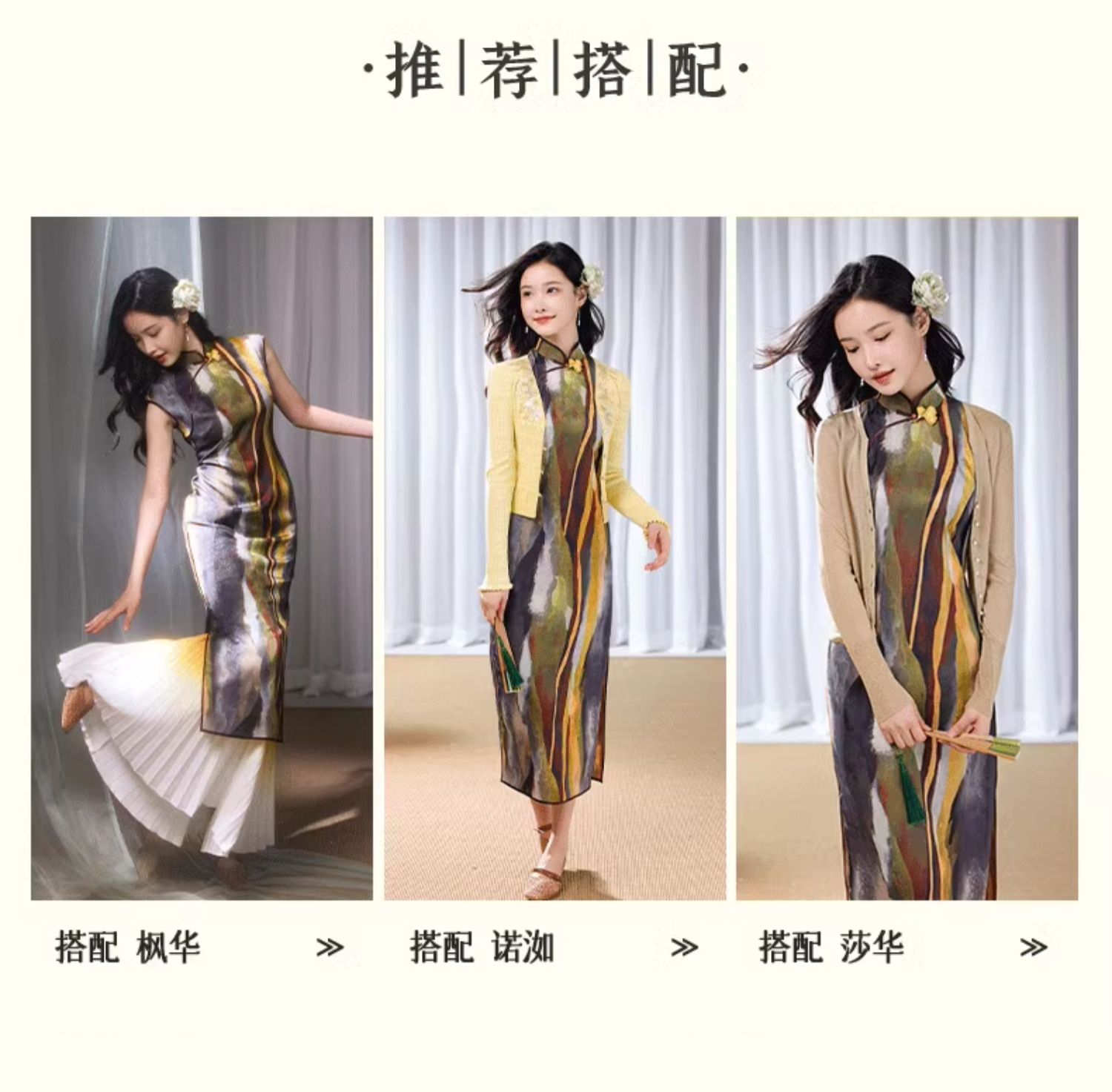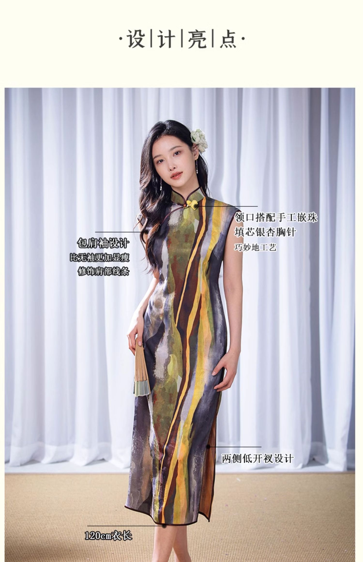 逸红颜玟歌2025夏新款艺术复古略宽松显腰身垂坠金绫缎改良长旗袍