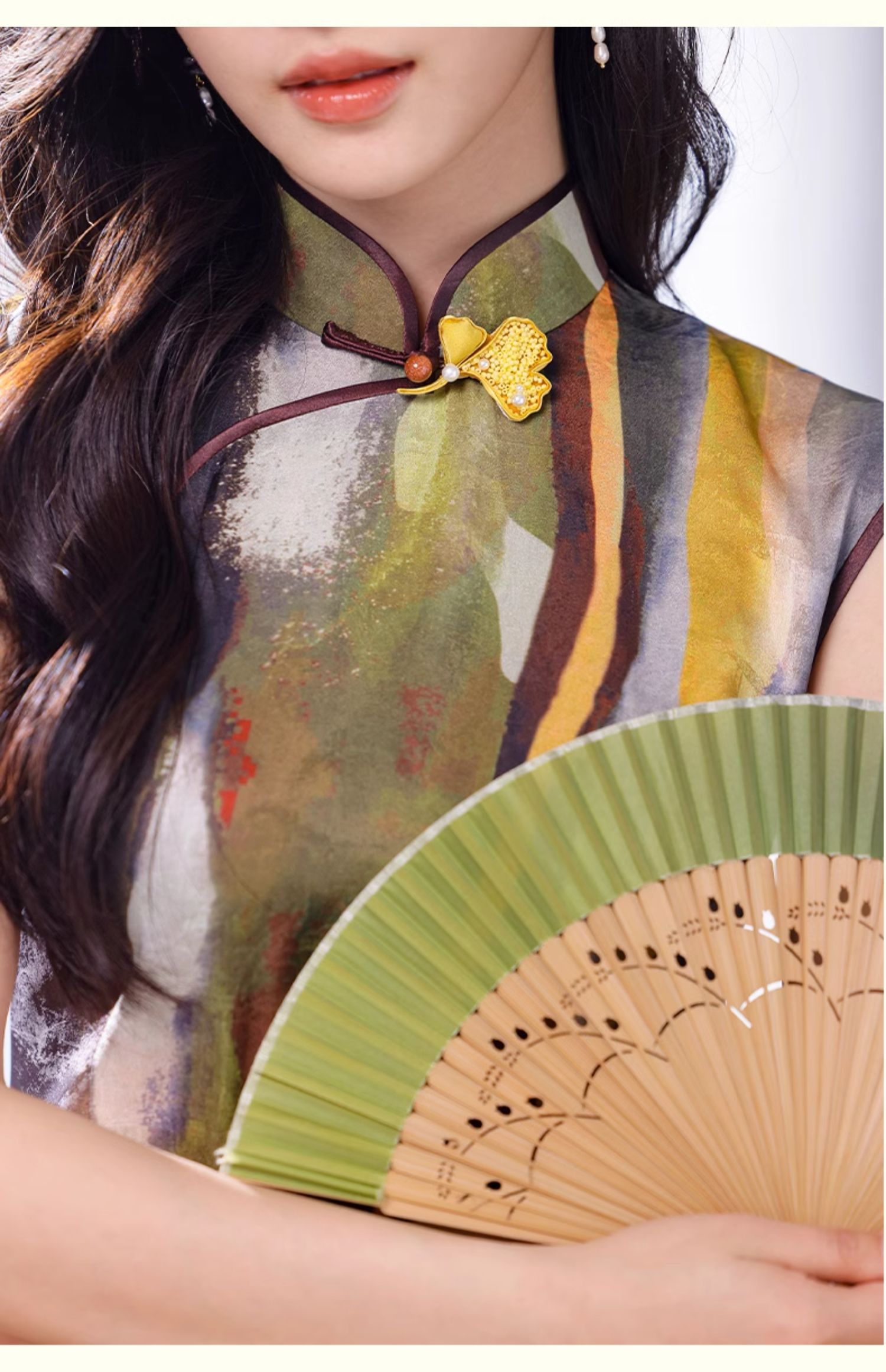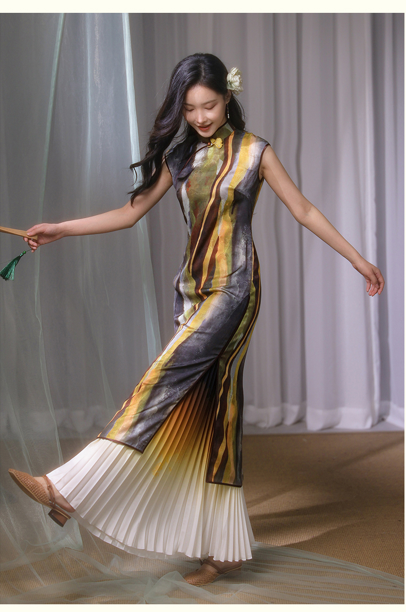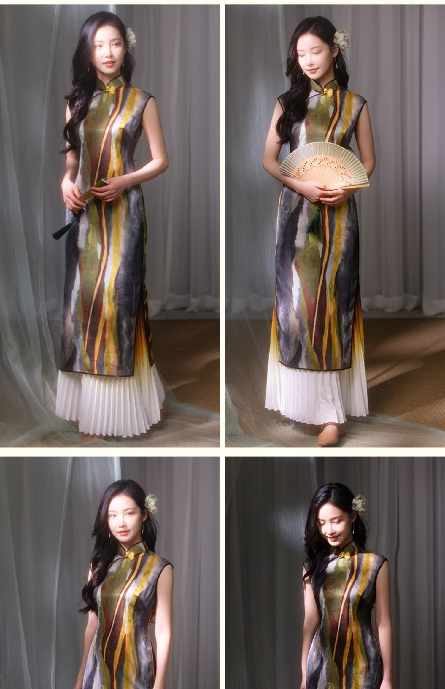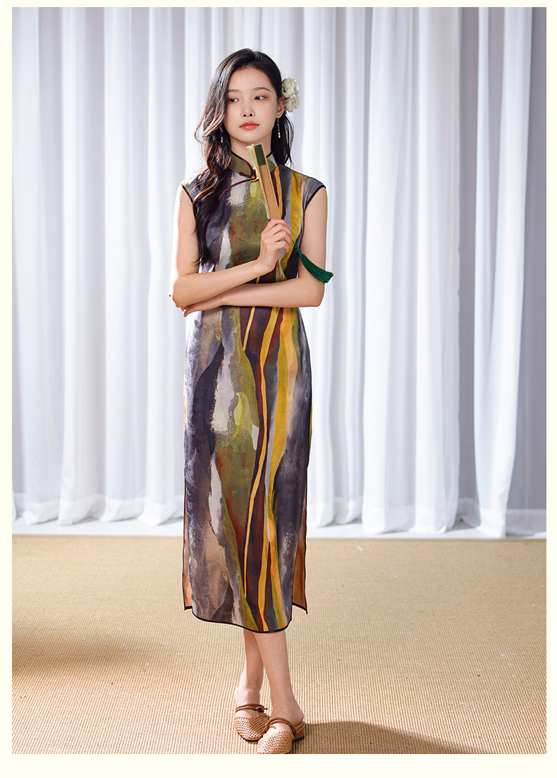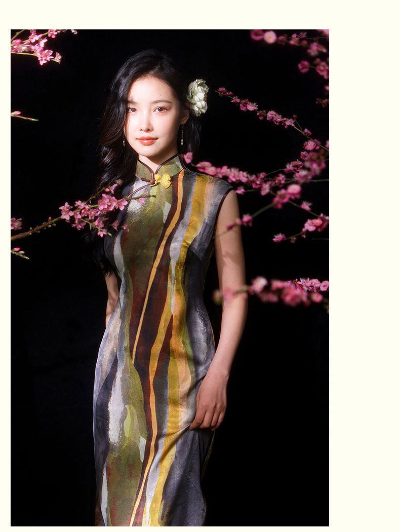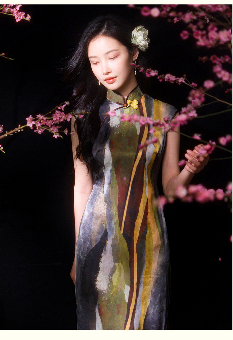 逸红颜玟歌2025夏新款艺术复古略宽松显腰身垂坠金绫缎改良长旗袍