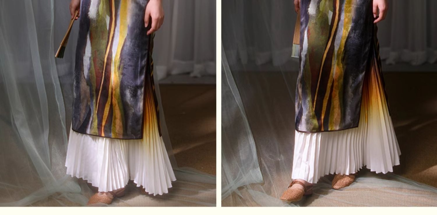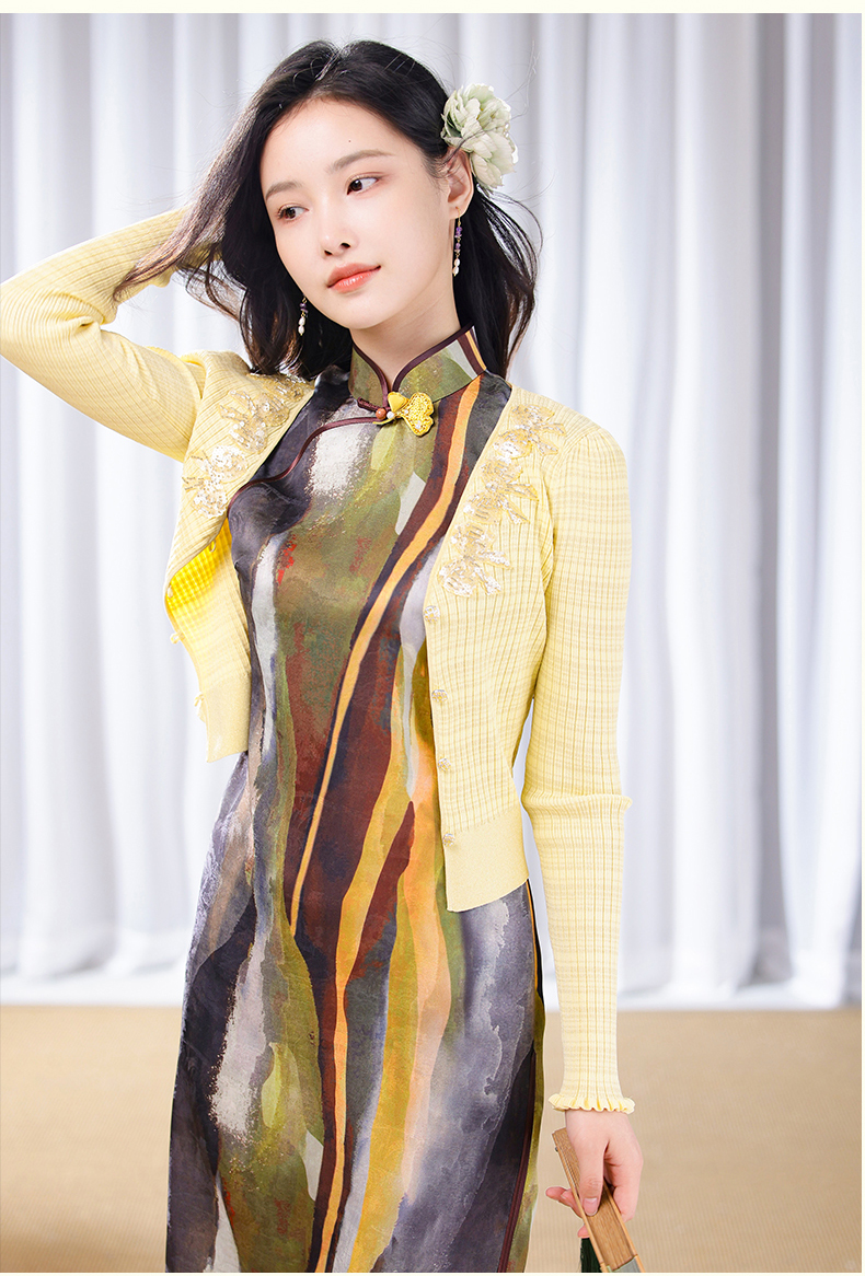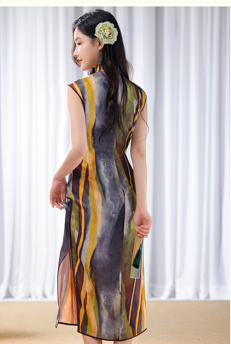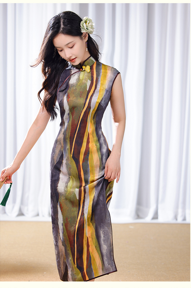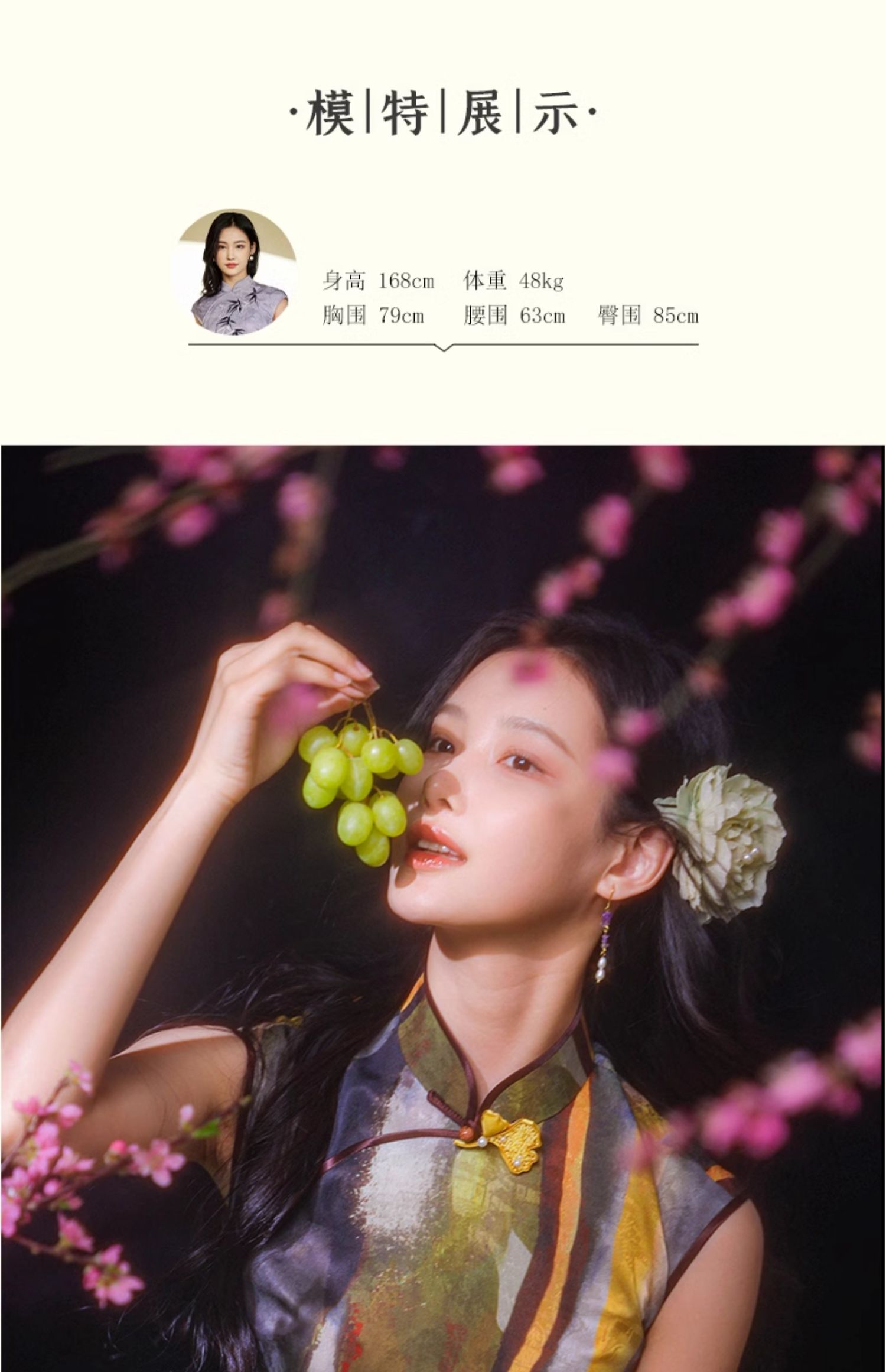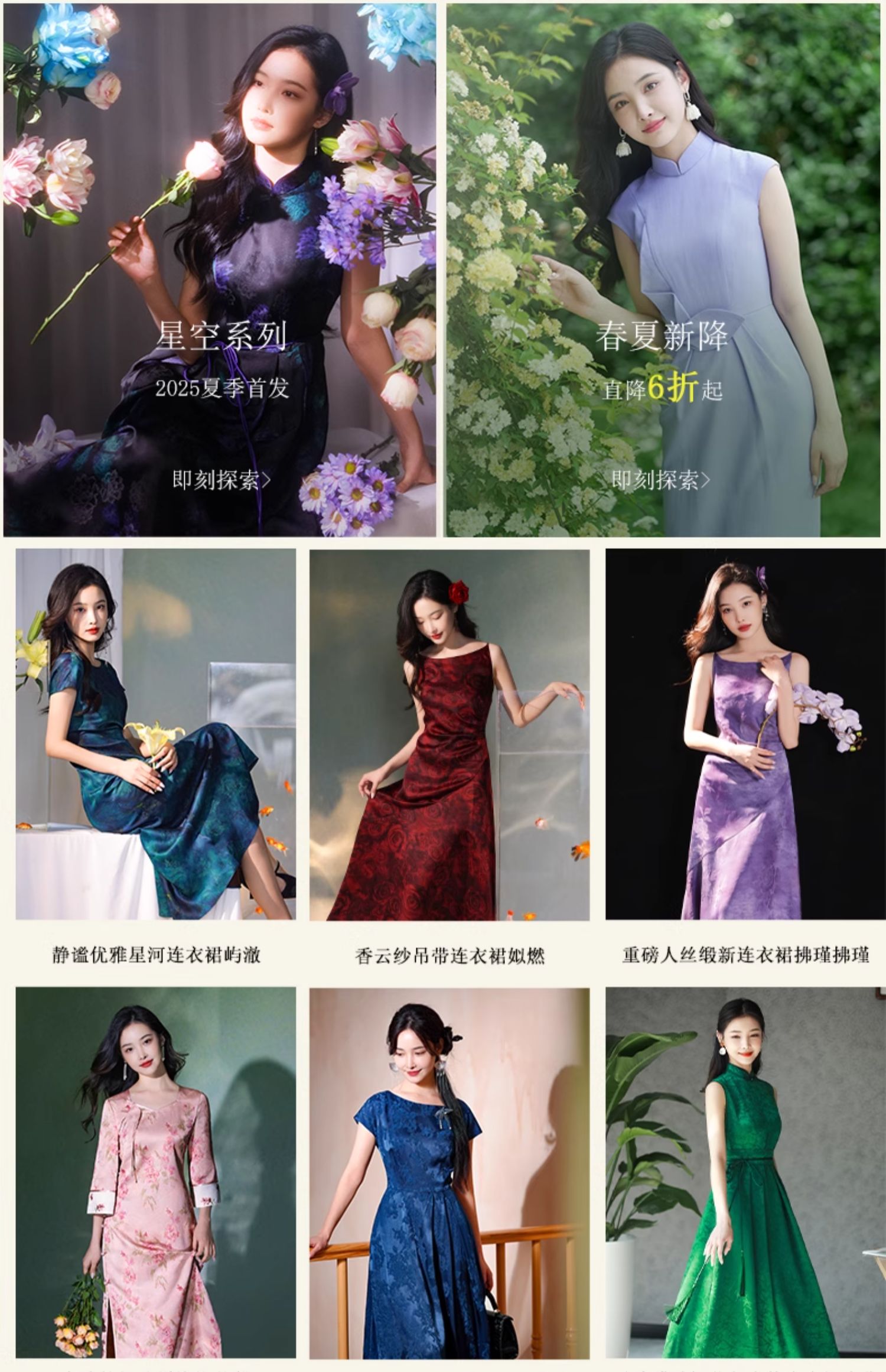 逸红颜玟歌2025夏新款艺术复古略宽松显腰身垂坠金绫缎改良长旗袍