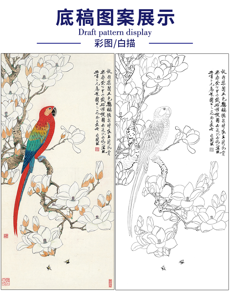 于非闇花鸟工笔画白描底稿《玉兰鹦鹉》临摹勾线高清打印稿HS09