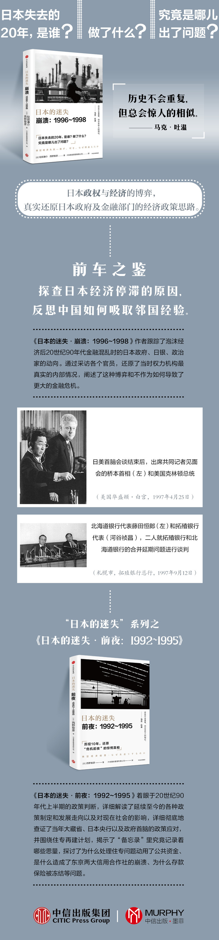 《日本的迷失·崩溃:1996~1998》作者跟踪了泡沫经济后20世纪90年代金融混乱时的日本政府、日银、政治家的动向。通过采访各个官员,还原了当时权力机构真实的内部情况,阐述了这种博弈和不作为如何导致了更大的金融危机。