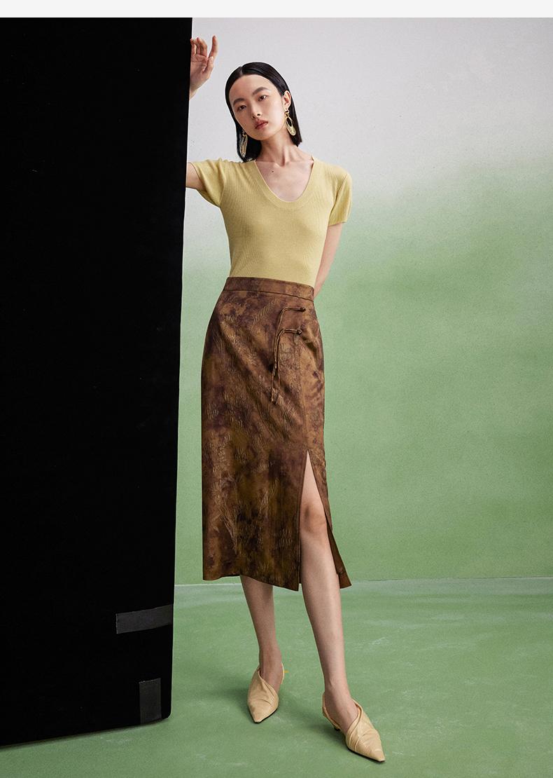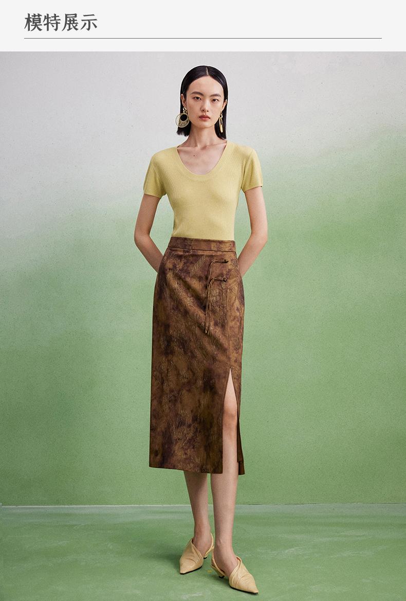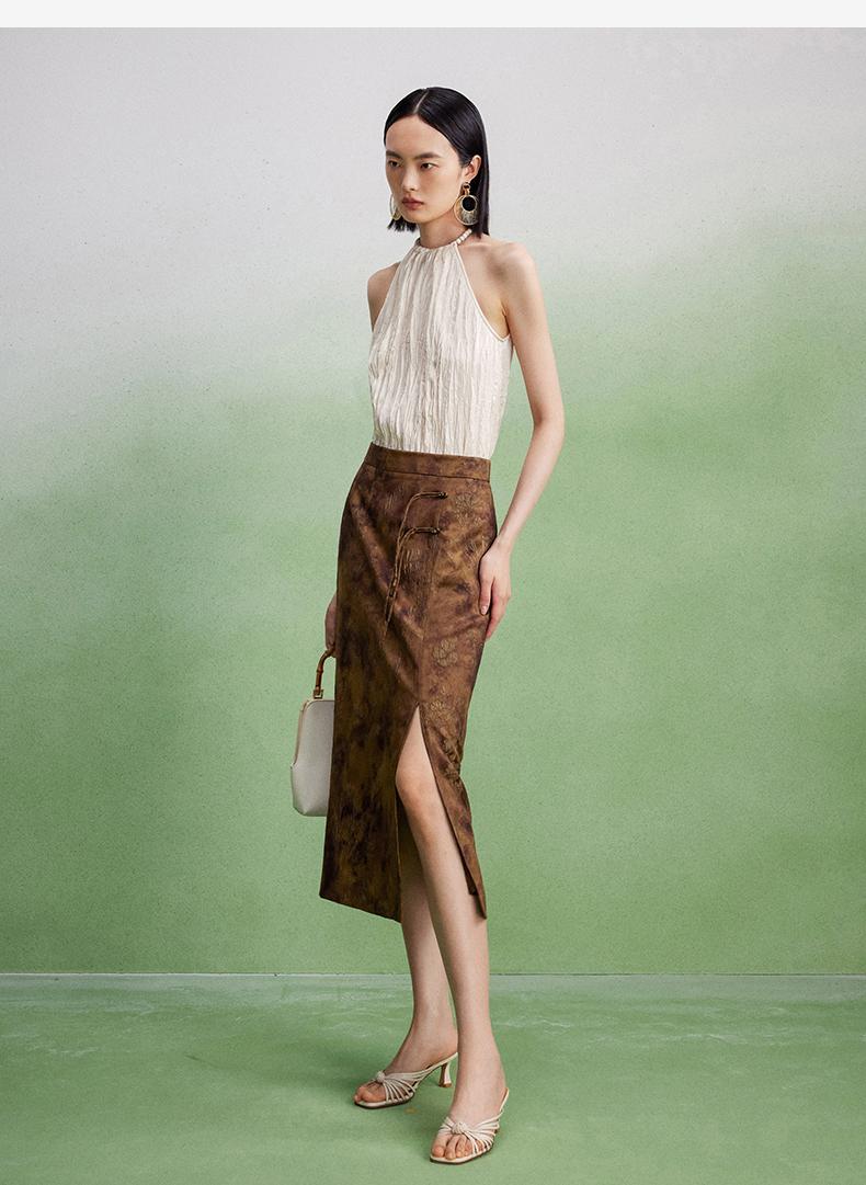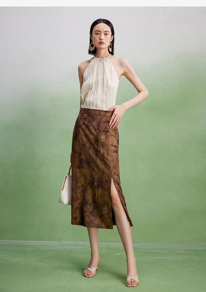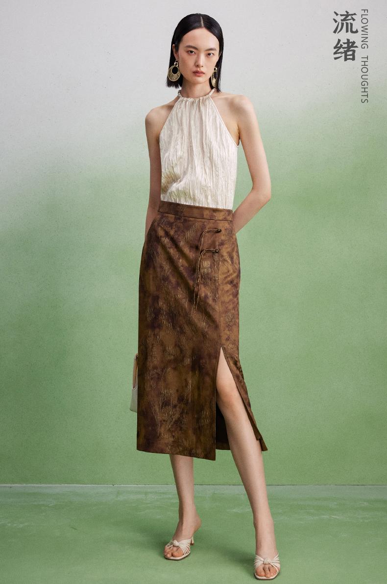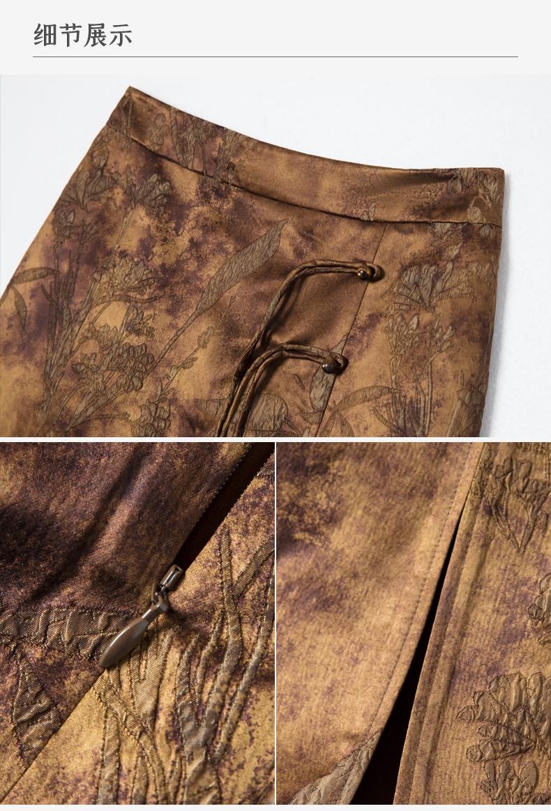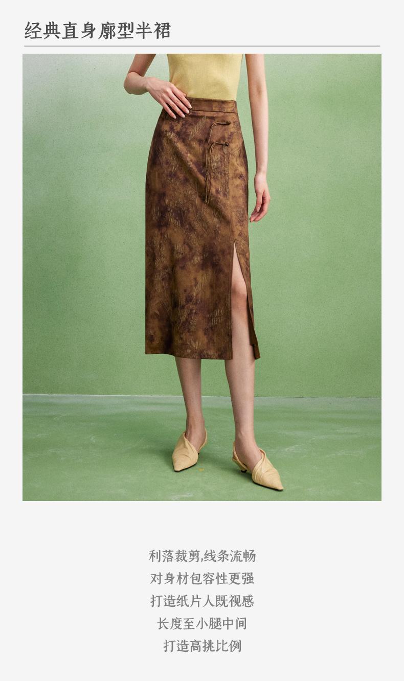 西嘉C+IMPRESS/西嘉人丝新中式半身裙女复古立体提花国风优雅开衩半裙BQ2402020