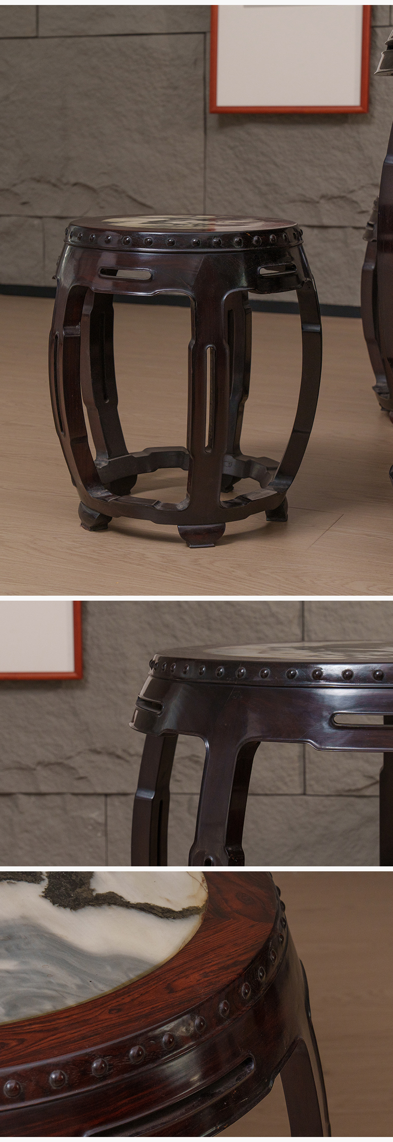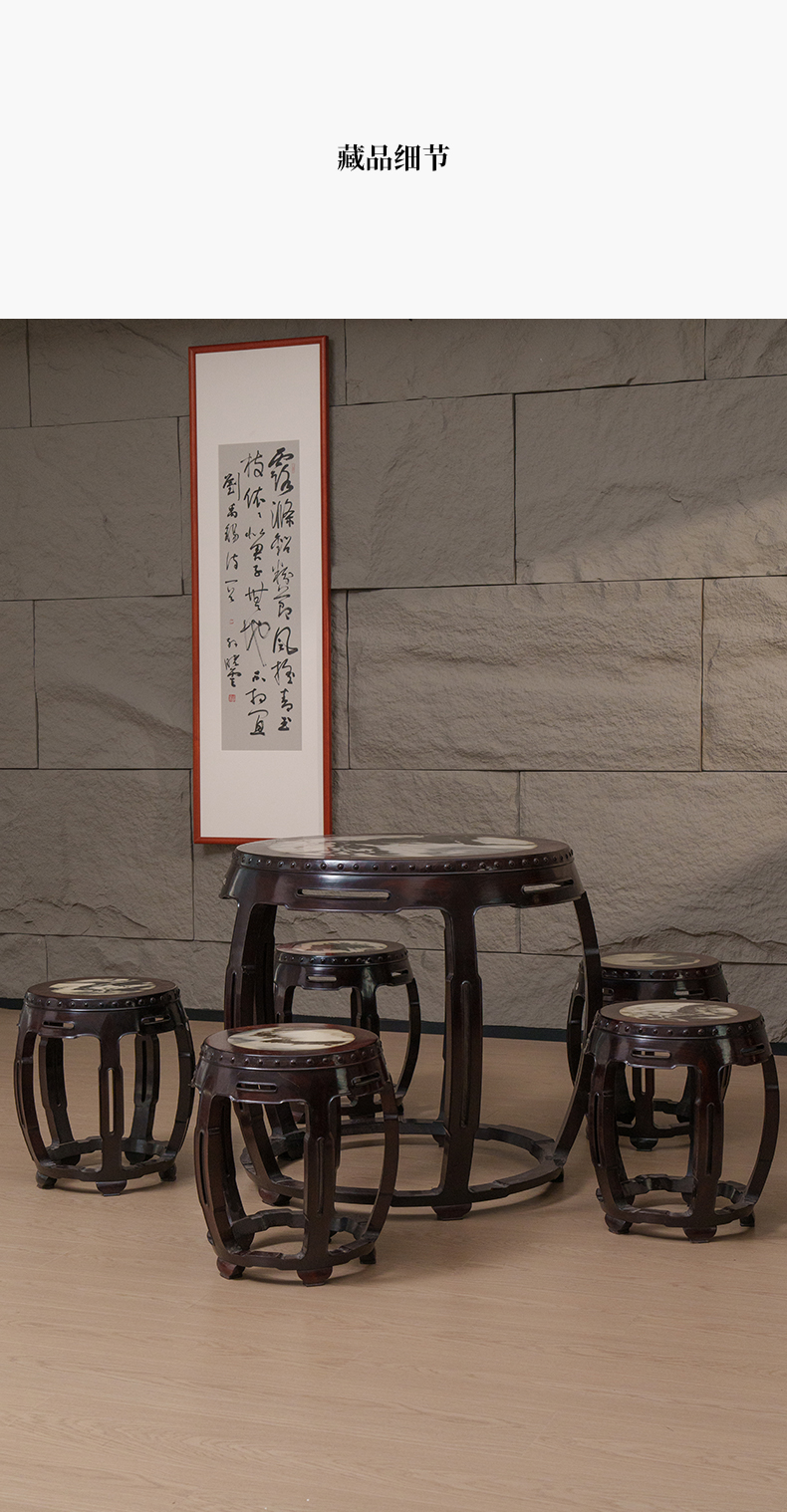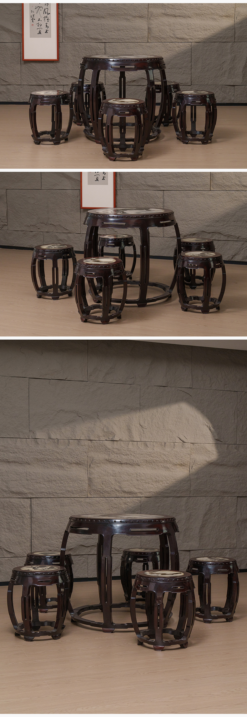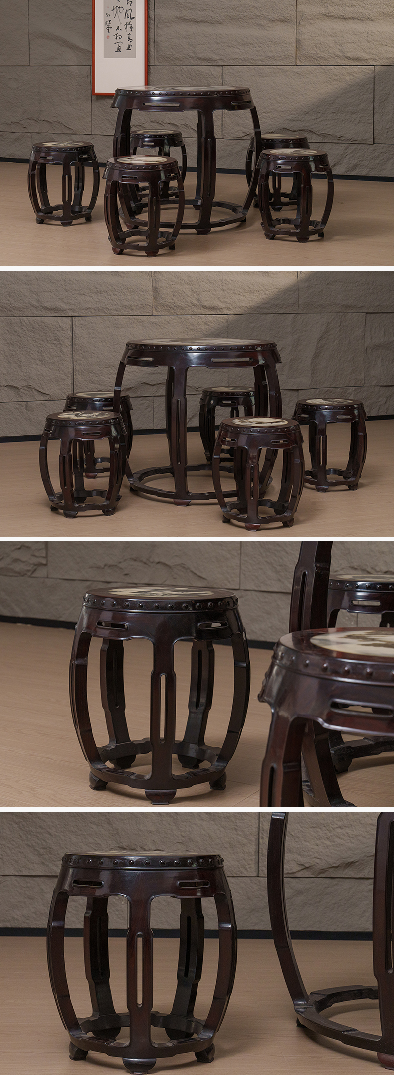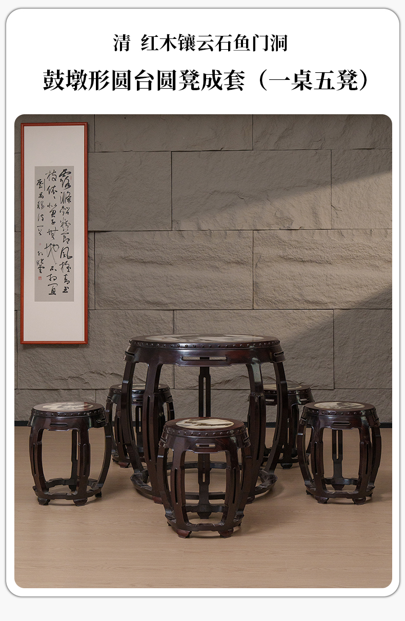 清 红木镶云石鱼门洞鼓墩形圆台圆凳成套(一桌五凳)