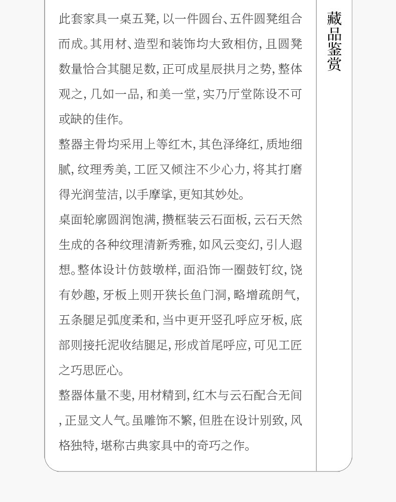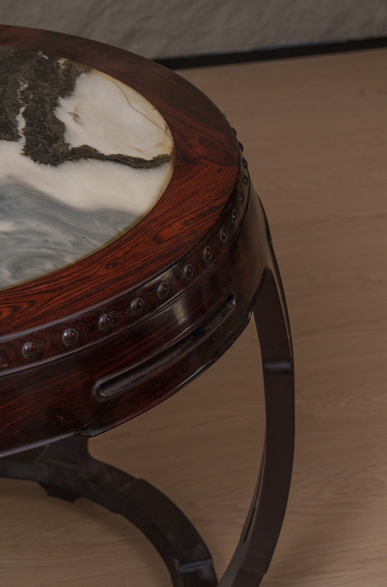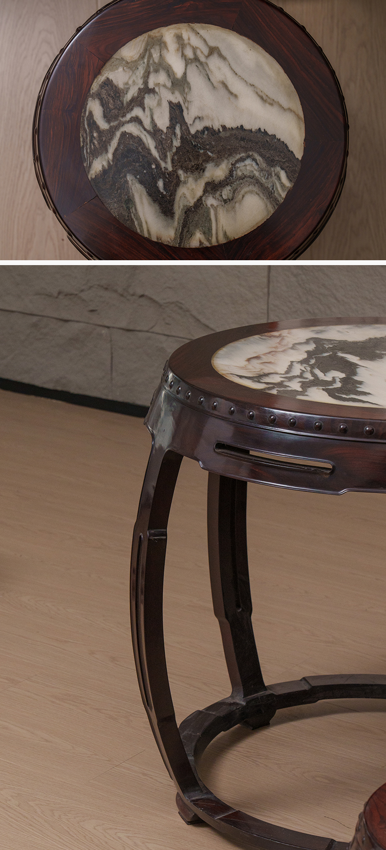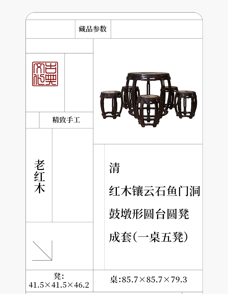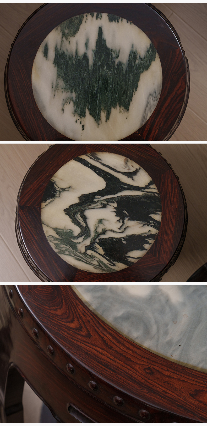 清 红木镶云石鱼门洞鼓墩形圆台圆凳成套(一桌五凳)