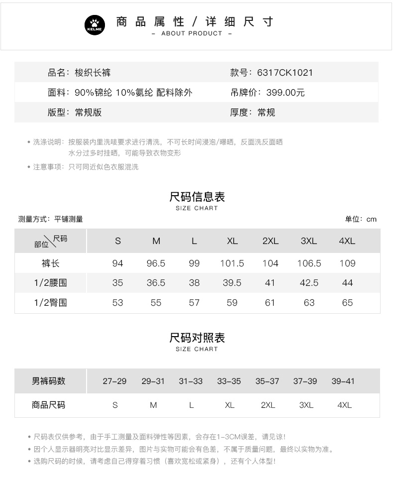 KELME卡尔美梭织长裤男春季薄宽松束脚裤运动裤休闲裤子